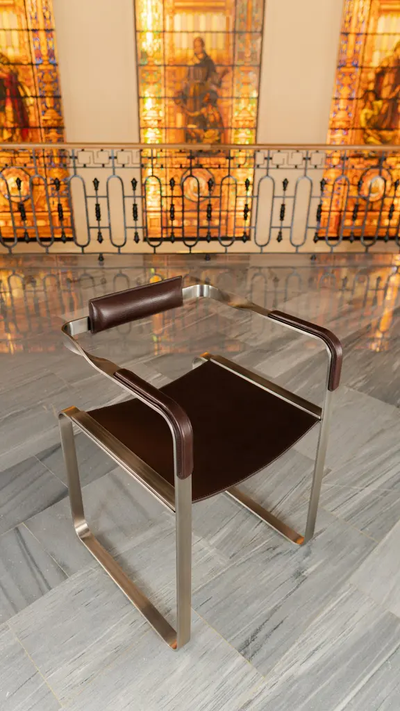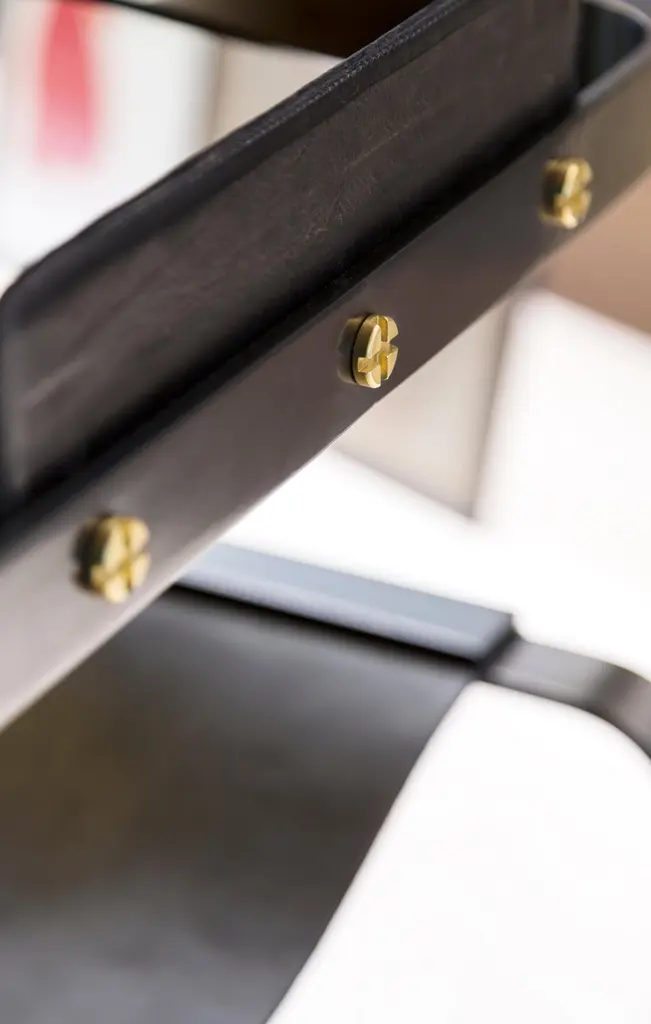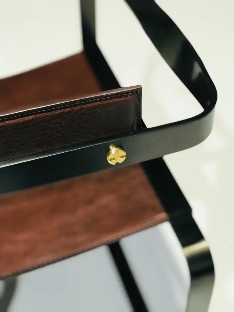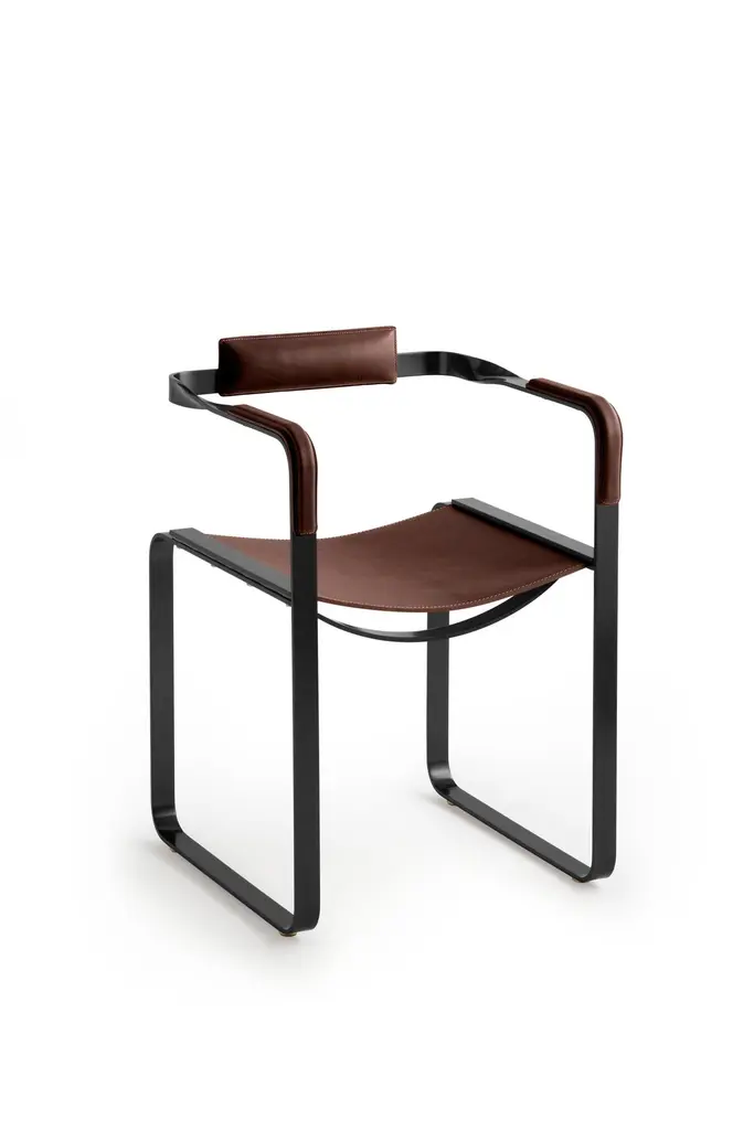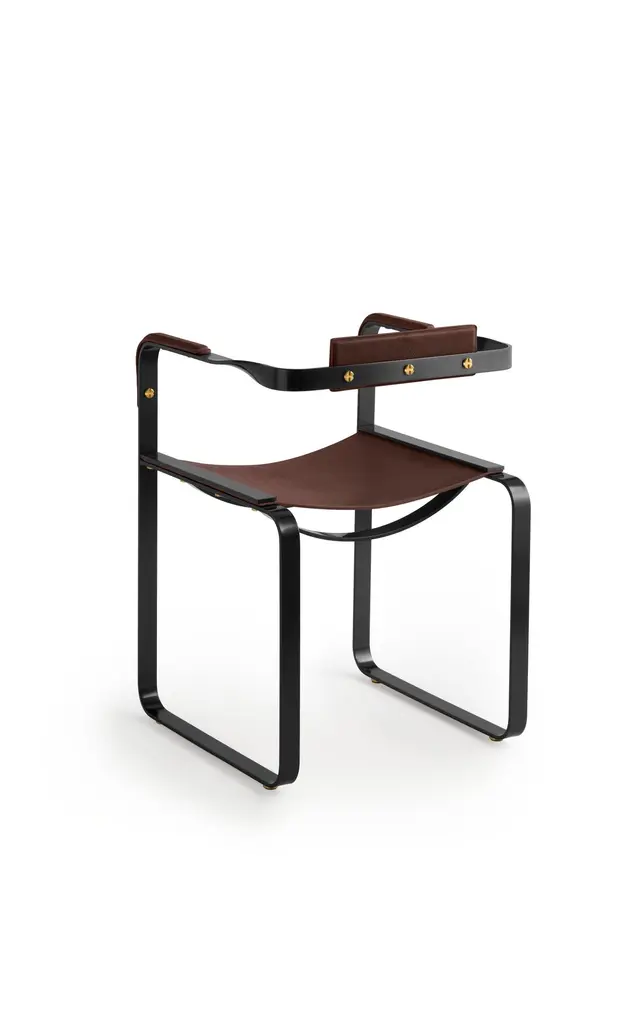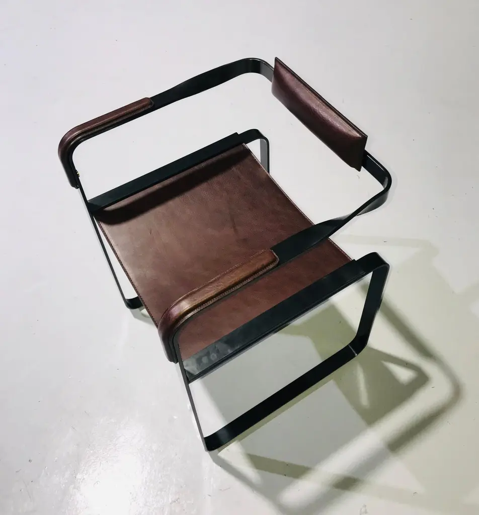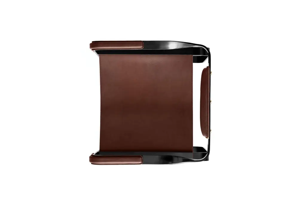 The Wanderlust contemporary armchair belongs to a collection of minimalist and serene pieces where exclusivity and precision are shown in small details such as the hand-turned metal nuts and bolts that fix the leather surfaces, that go unnoticed at first sight.The robustness of the steel structure is combined with the delicacy of the rounded edges. The matte metal finishes evoke the passage of time and are complemented by vegetable tanned cowhide leathers that age gracefully with its use.The Wanderlust counter stool is designed and conceived as a tribute of Bauhaus tribute, the phrases "Less is more" and "God is in the detail" from the German American architect and industrial designer Mies van der Rohe, one of the pioneers of modernist architecture, define this collection.All pieces are done with cold bended steel rods, polished, nickel plated, colored by electrolysis, and lacquered. The process of polishing and lacquering the steel, goes through a manual and delicate chroming process, which gives its final and unique metal color finish. This precise technique gives a uniform metallic finish of minimum 50 microns over the entire Surface. Our metal finishing has successfully passed a corrosion resistance test in a salt spray chamber according to UNE-EN ISO 9227: 2017 and UNE-EN ISO 1456: 2010. Our signature screws are made with brass turning lathed, polished, and lacquered, these are the pieces that fix the saddle leather to the metal frame.Leathers are Spanish hides vegetable tanned. We use premium saddles in multiple colors to adjust to your taste and interior needs. This traditional vegetable dying and tanning method is an organic technique that relies on natural tannings from bark or plant tissues. The use of oils and natural fats give the leather a distinctive flexibility and texture, allowing it to be molded, retain its shape and age graciously.All skins are carefully selected from food industry sub-products, with a minimum thickness of 3.5 mm / 0,02 in, using the part of the animal's shoulder, which allows for larger pieces and uniformity, even though signature wrinkle from the animal’s neck may be recognizable. The vegetable tanning is a traditional and artisan treatment, which is respectful to the environment. Even with careful selection natural marks as a result of the contact with other animals, the age, origin and characteristics of the skin, or even the season in which the tanning takes place cannot be avoided. We still believe that these factors only add authenticity and uniqueness to every piece. Our leather parts are made with double saddles, always showing the top side of the hides that presents the better quality.Customization options.With the aim of creating customized pieces, clients can select from the various metal finishes, and leather colors to create pieces that complement their home décor. Leather colors available, black, navy, dark brown, cognac and natural tobacco, and steel polished finishing available, aged brass, black smoke and aged silver.Normally we use tone on tone threats for stitches, but client can select a contrast option, being possible to select any color to make a unique piece for the project it belongs. The finish on the edges of our leather components are sanded and hand painted. We have the option of select an alternative color if not tone on tone will be applied.Our collections are made to full fill home spaces where to gather and enjoy great conversation with families and friends. Occasional furniture for exquisite homes, from cottages to exclusive resorts. Our product is understood as a sculptural piece of design, as an art object to be displayed at different house spaces as library, bar, living, foyer, bedroom, powder, meeting, grand or great room.The different finishes options make the furniture perfect combinations on diverse styles, from rustic mountain home, a small cottage, a ski lodge retreat, or industrial a minimalist look.