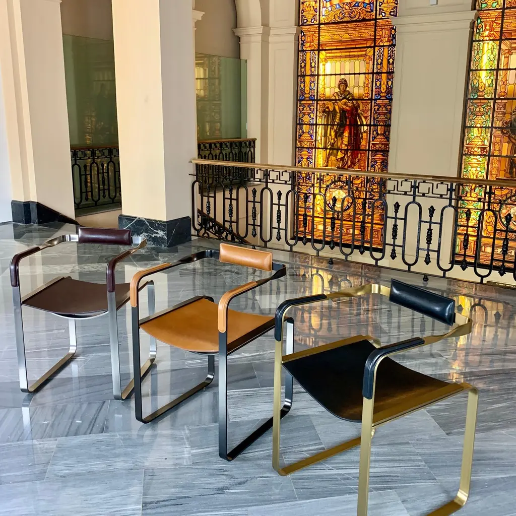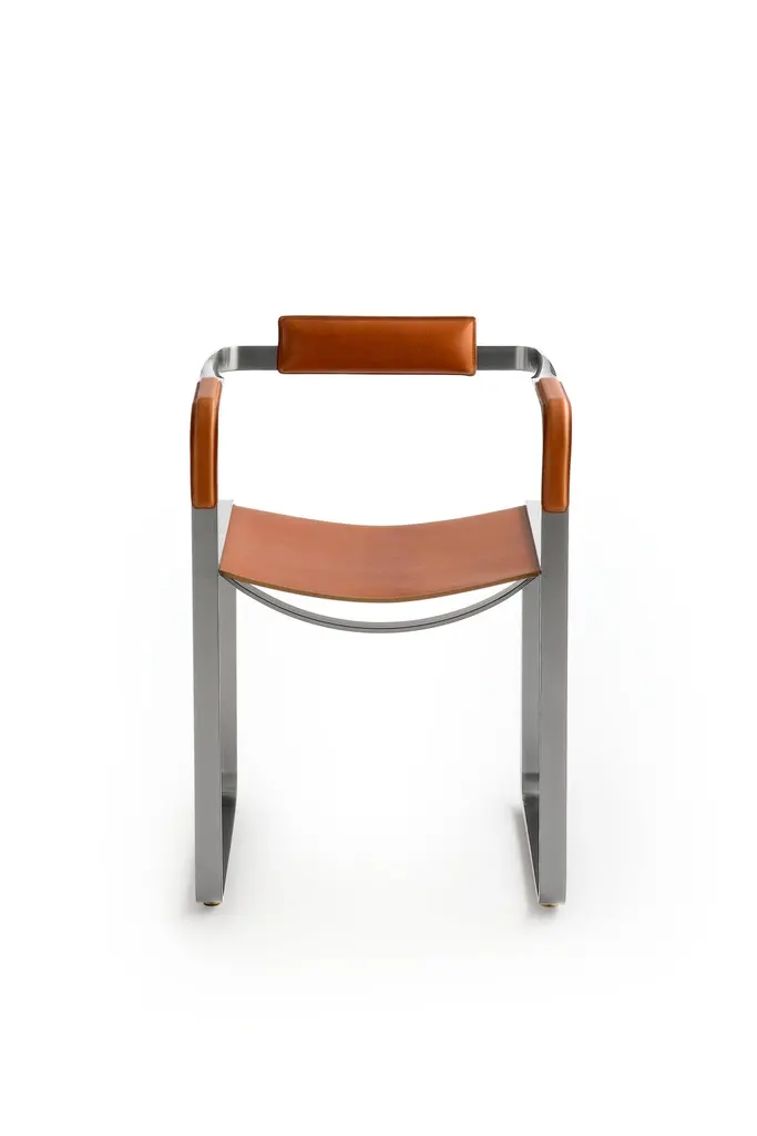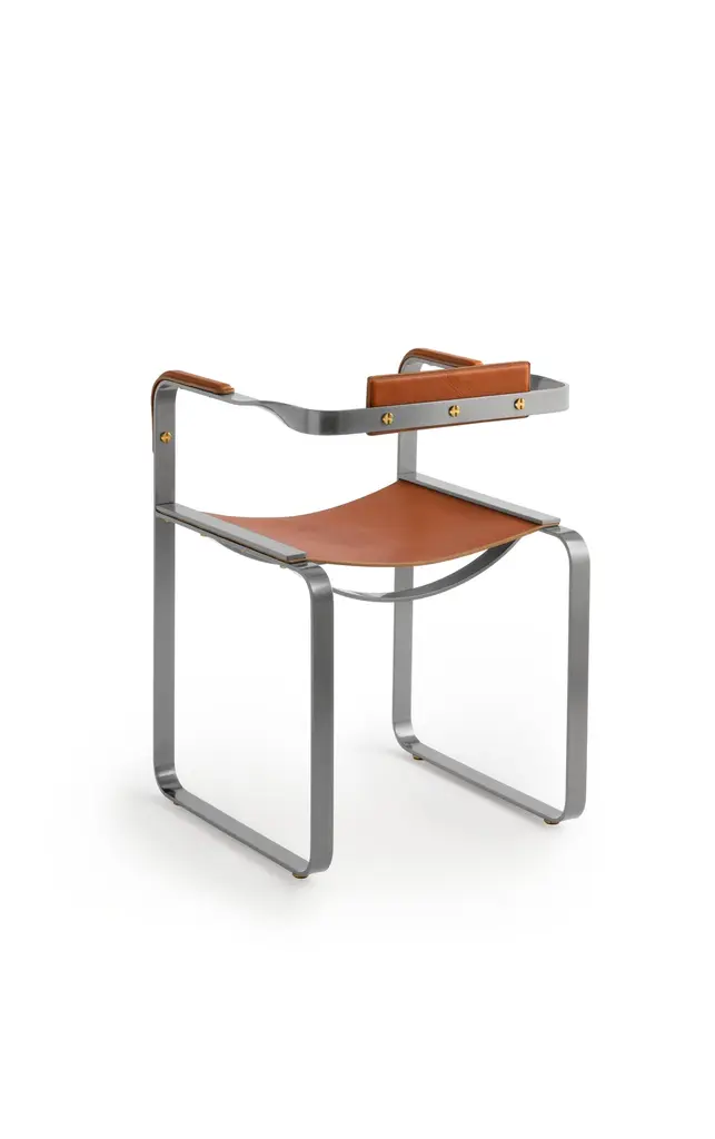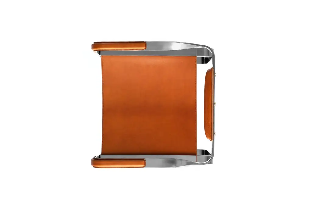 The Wanderlust contemporary armchair belongs to a collection of minimalist and serene pieces where exclusivity and precision are shown in small details such as the hand-turned metal nuts and bolts that fix the leather surfaces, that go unnoticed at first sight.The robustness of the steel structure is combined with the delicacy of the rounded edges. The matte metal finishes evoke the passage of time and are complemented by vegetable tanned cowhide leathers that age gracefully with its use.The Wanderlust counter stool is designed and conceived as a tribute of Bauhaus tribute, the phrases "Less is more" and "God is in the detail" from the German American architect and industrial designer Mies van der Rohe, one of the pioneers of modernist architecture, define this collection.All pieces are done with cold bended steel rods, polished, nickel plated, colored by electrolysis, and lacquered. The process of polishing and lacquering the steel, goes through a manual and delicate chroming process, which gives its final and unique metal color finish. This precise technique gives a uniform metallic finish of minimum 50 microns over the entire Surface. Our metal finishing has successfully passed a corrosion resistance test in a salt spray chamber according to UNE-EN ISO 9227: 2017 and UNE-EN ISO 1456: 2010. Our signature screws are made with brass turning lathed, polished, and lacquered, these are the pieces that fix the saddle leather to the metal frame.Leathers are Spanish hides vegetable tanned. We use premium saddles in multiple colors to adjust to your taste and interior needs. This traditional vegetable dying and tanning method is an organic technique that relies on natural tannings from bark or plant tissues. The use of oils and natural fats give the leather a distinctive flexibility and texture, allowing it to be molded, retain its shape and age graciously.All skins are carefully selected from food industry sub-products, with a minimum thickness of 3.5 mm / 0,02 in, using the part of the animal's shoulder, which allows for larger pieces and uniformity, even though signature wrinkle from the animal’s neck may be recognizable. The vegetable tanning is a traditional and artisan treatment, which is respectful to the environment. Even with careful selection natural marks as a result of the contact with other animals, the age, origin and characteristics of the skin, or even the season in which the tanning takes place cannot be avoided. We still believe that these factors only add authenticity and uniqueness to every piece. Our leather parts are made with double saddles, always showing the top side of the hides that presents the better quality.Customization options.With the aim of creating customized pieces, clients can select from the various metal finishes, and leather colors to create pieces that complement their home décor. Leather colors available, black, navy, dark brown, cognac and natural tobacco, and steel polished finishing available, aged brass, black smoke and aged silver.Normally we use tone on tone threats for stitches, but client can select a contrast option, being possible to select any color to make a unique piece for the project it belongs. The finish on the edges of our leather components are sanded and hand painted. We have the option of select an alternative color if not tone on tone will be applied.Please consult in case you are interested on having a particular heat embossing stamp on the leather with your own branding. Our collections are made to full fill home spaces where to gather and enjoy great conversation with families and friends. Occasional furniture for exquisite homes, from cottages to exclusive resorts. Our product is understood as a sculptural piece of design, as an art object to be displayed at different house spaces as library, bar, living, foyer, bedroom, powder, meeting, grand or great room.The different finishes options make the furniture perfect combinations on diverse styles, from rustic mountain home, a small cottage, a ski lodge retreat, or industrial a minimalist look.