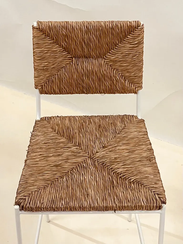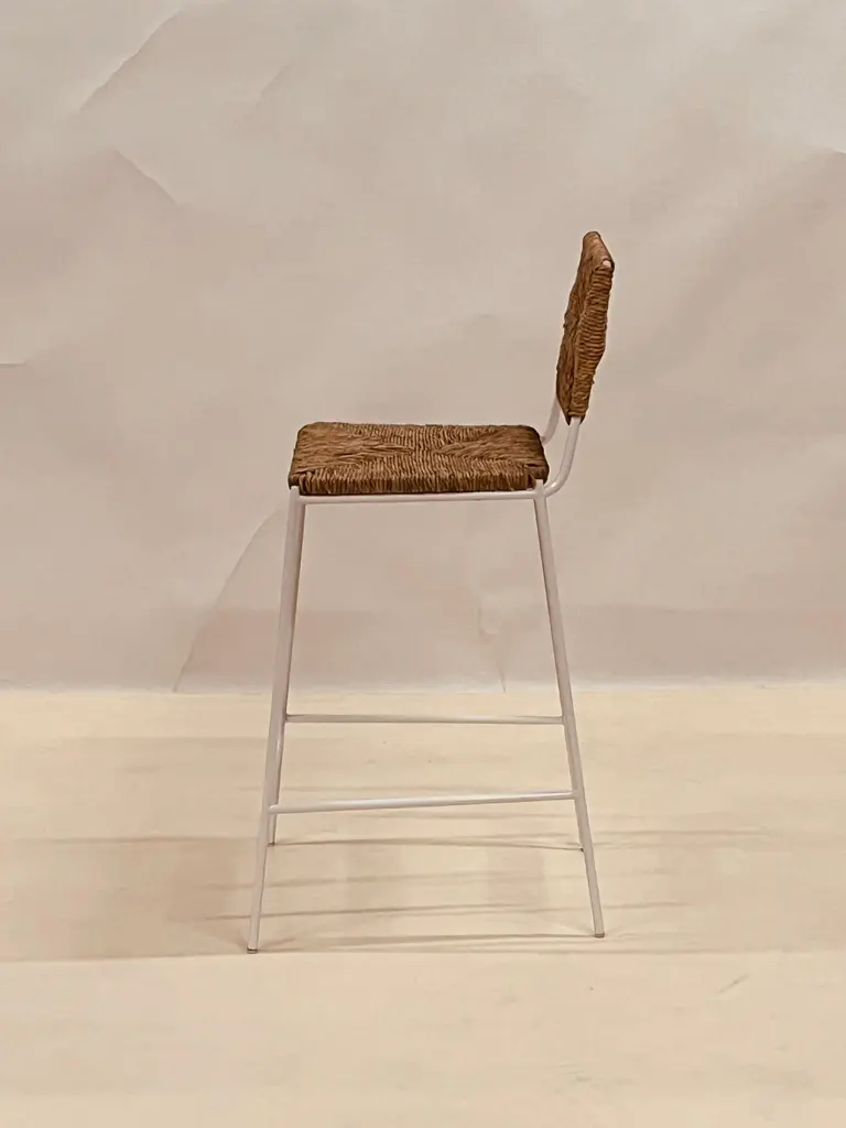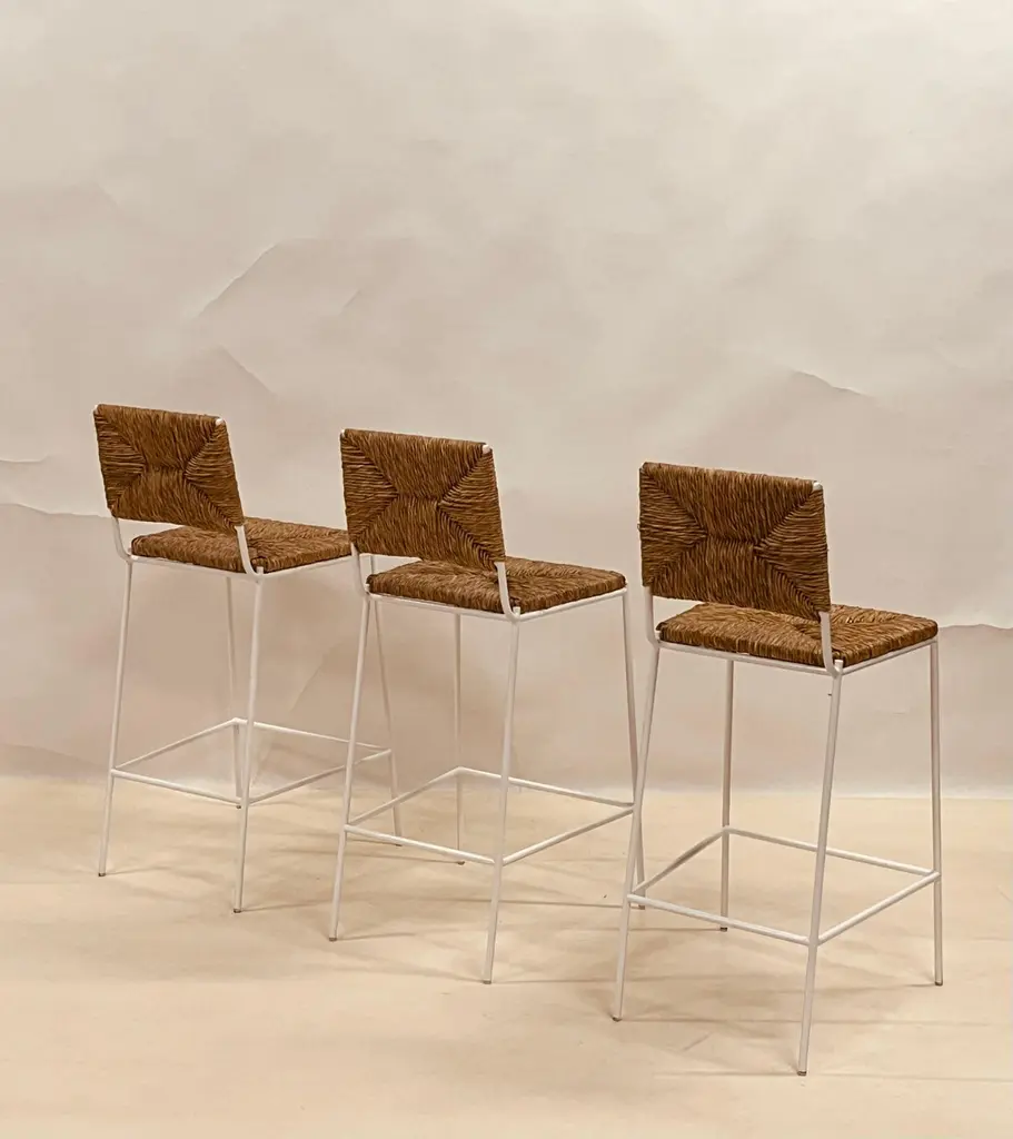 White 'Campagne' counter height stools by Design Frères.Chic combination of slender but sturdy and stable white powder-coated steel frames with handwoven rush seats and backs. Extra support under the rush seats for durability. Non-scratch plastic glides at the tip of the legs.