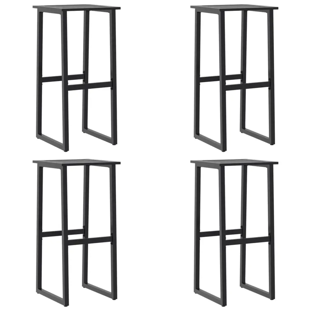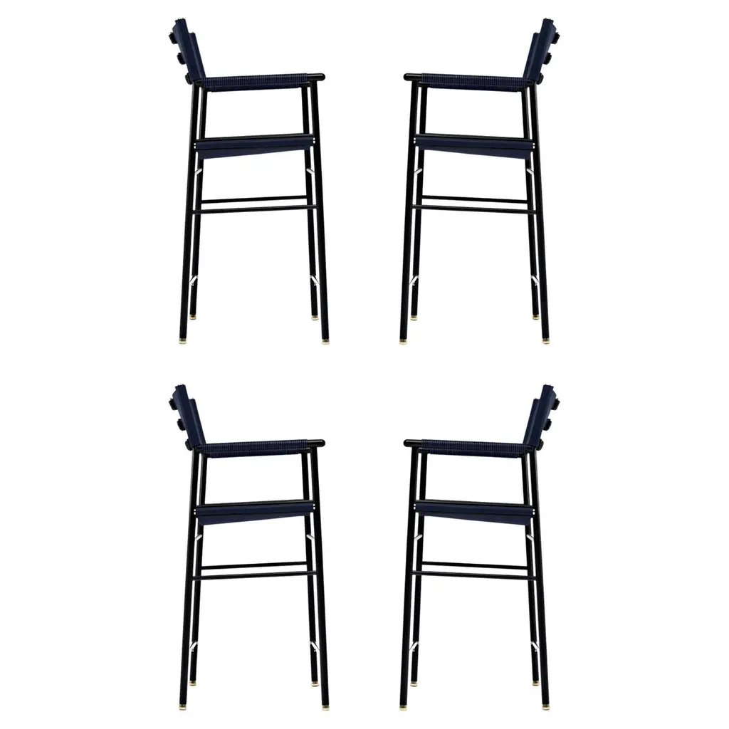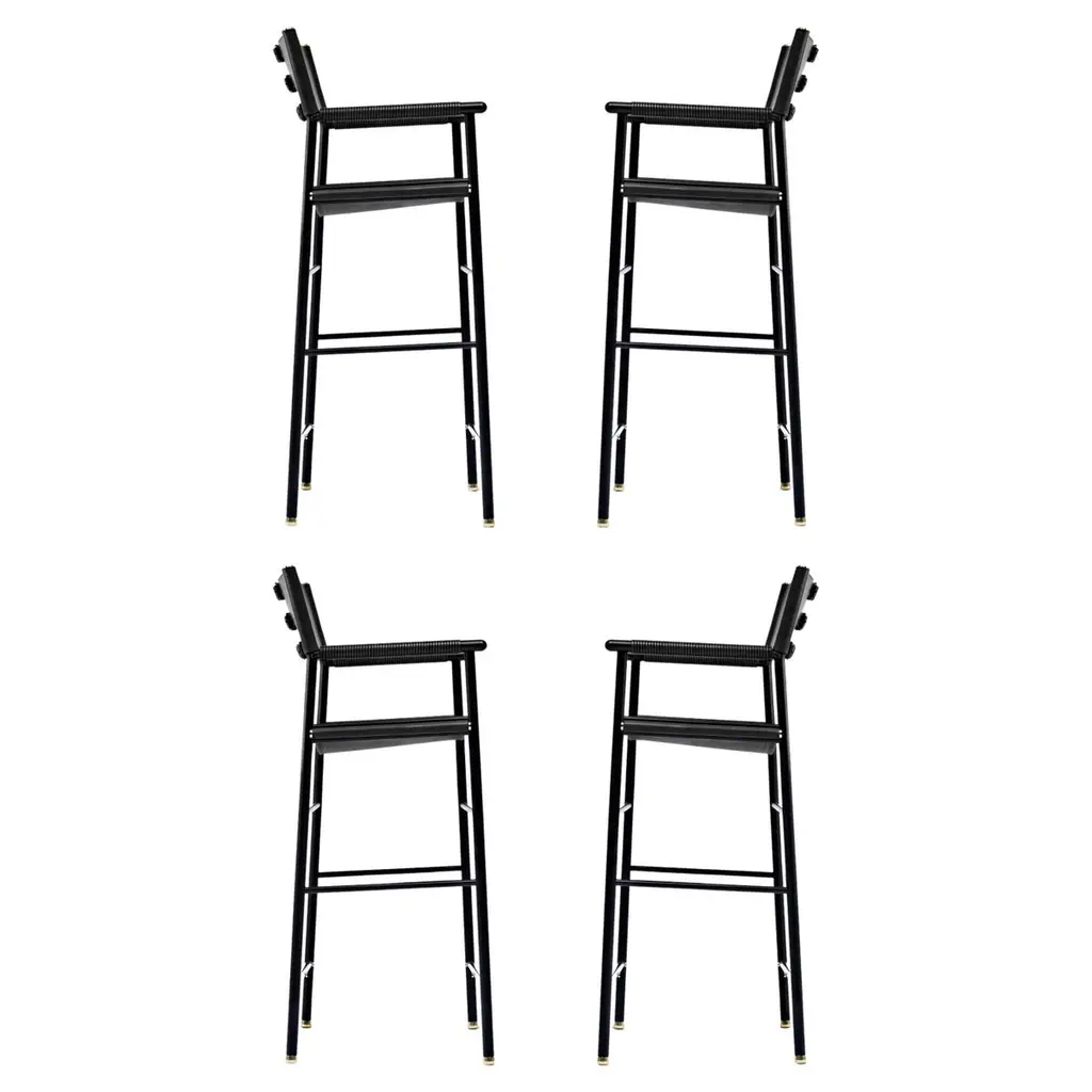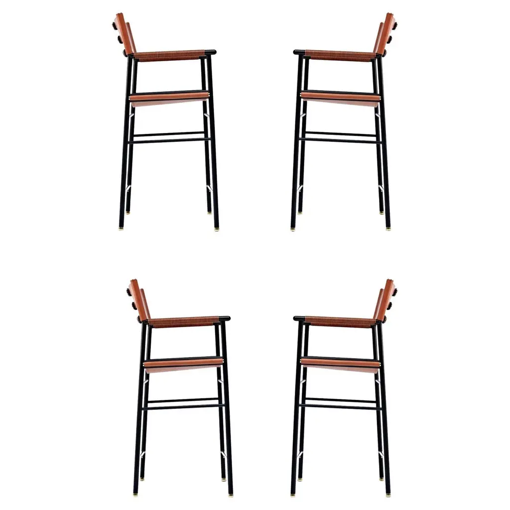 Set Of 4 Artisanal Counter Stool W. Backrest Black Leather & Black Rubber Metal