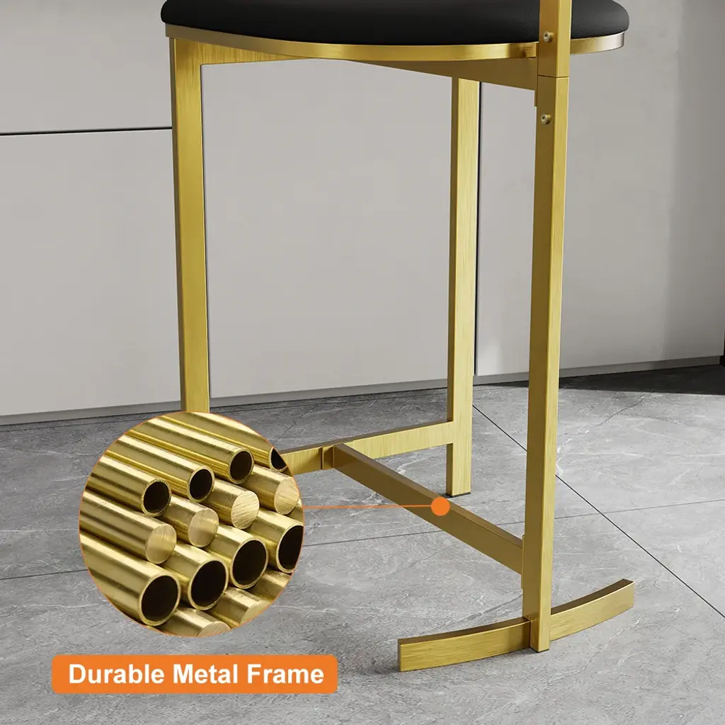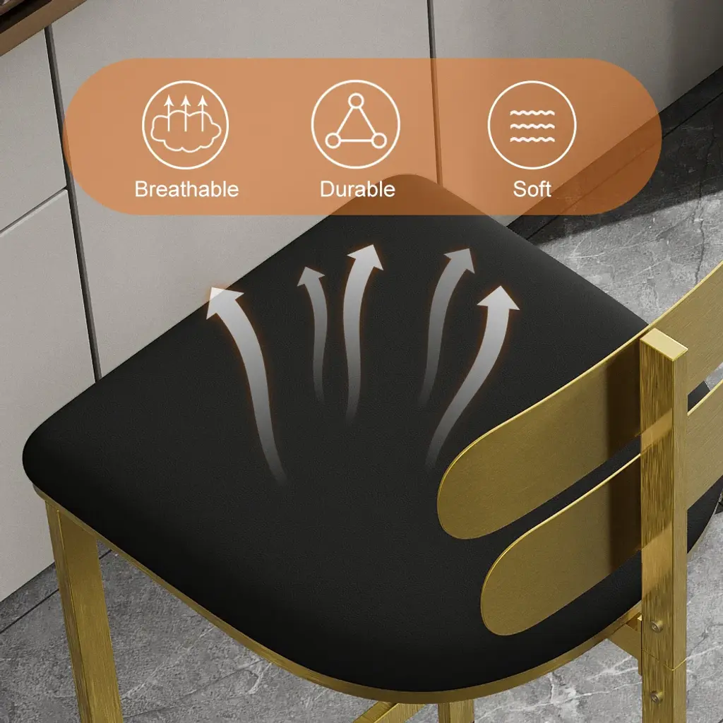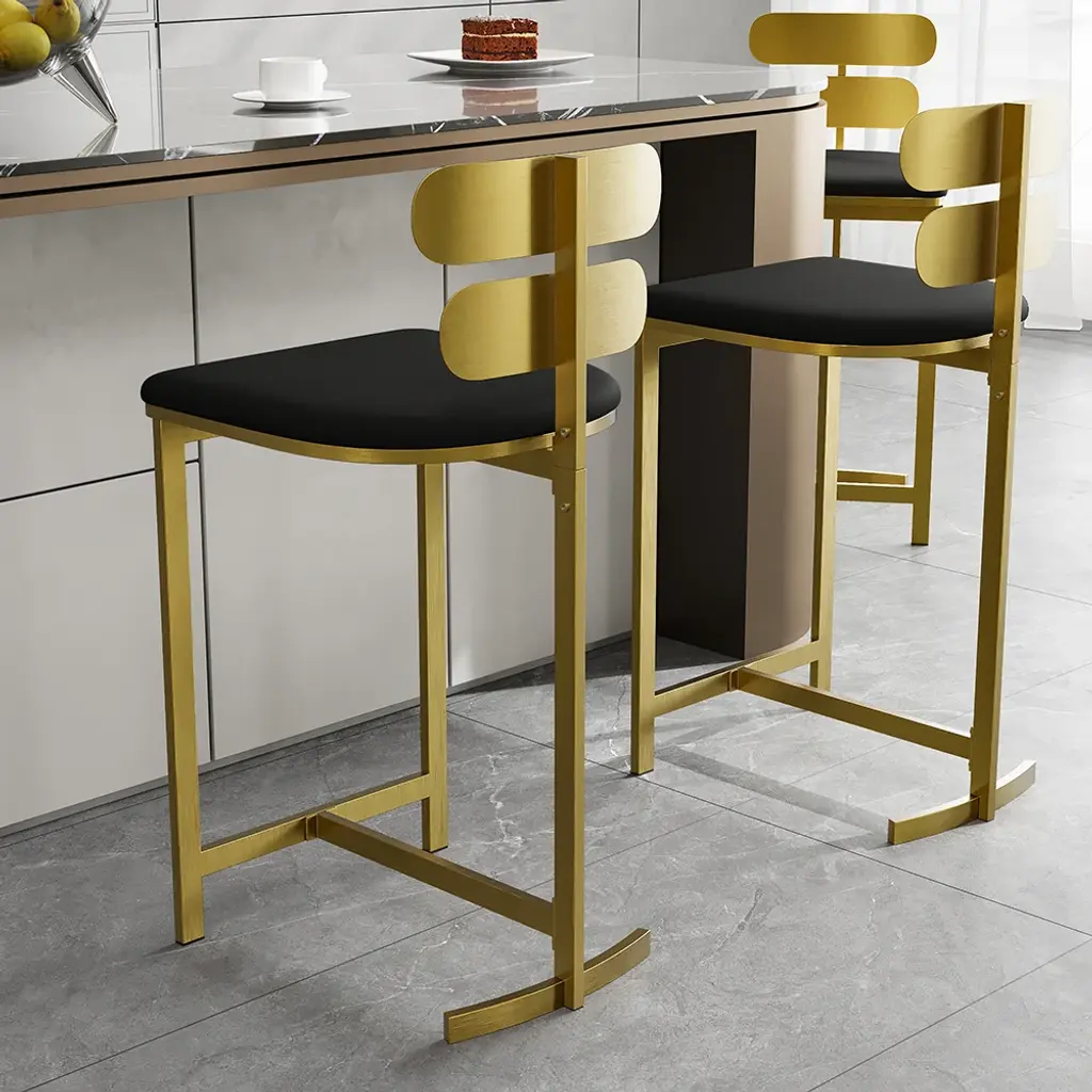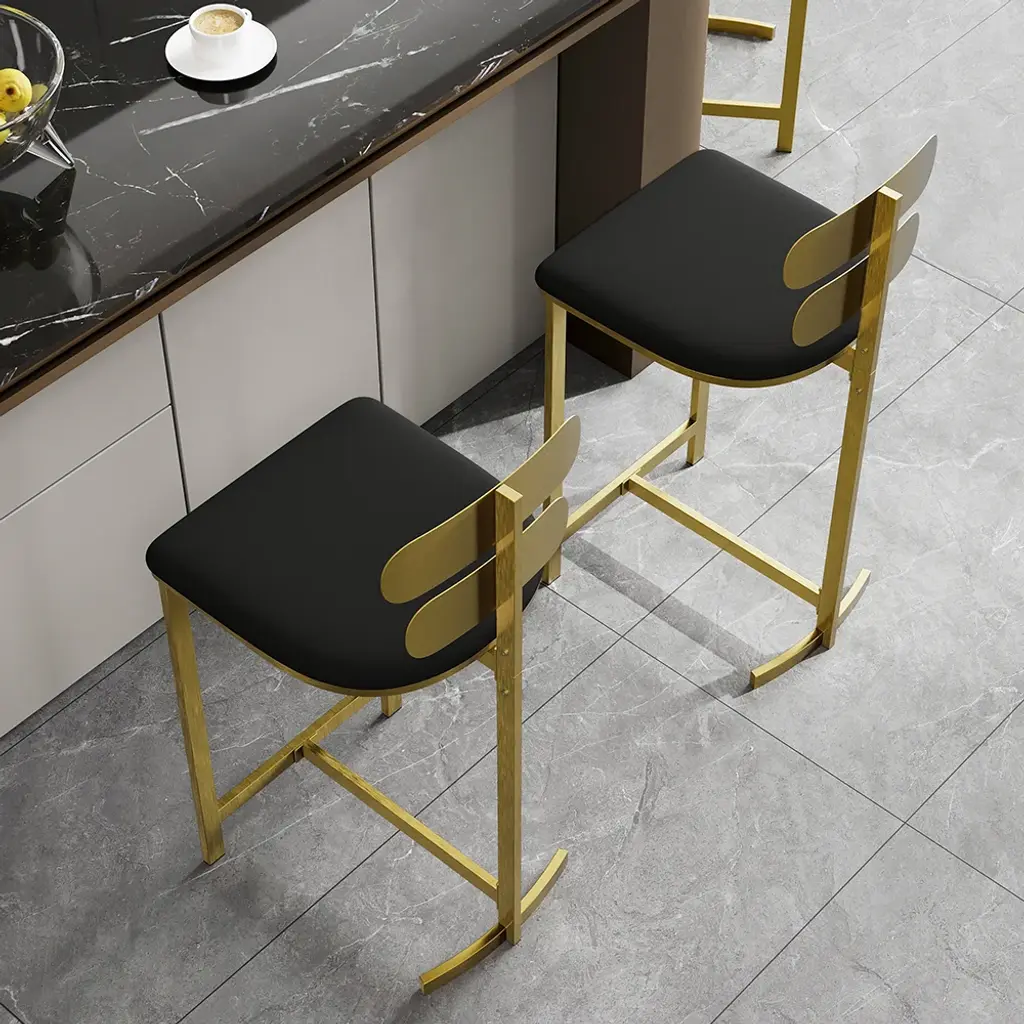 This modern black bar set of 4 adds style and functionality to any dining room. Sleek PU leather upholstery, low-back support, and square foam-filled comfort define the seat of these swanky stools. Supported by gold metal legs, with the added utility of a built-in footrest, this stool is all that one can dream of. Whether at a breakfast nook, kitchen counter, or home bar, it's a stylish yet practical choice.