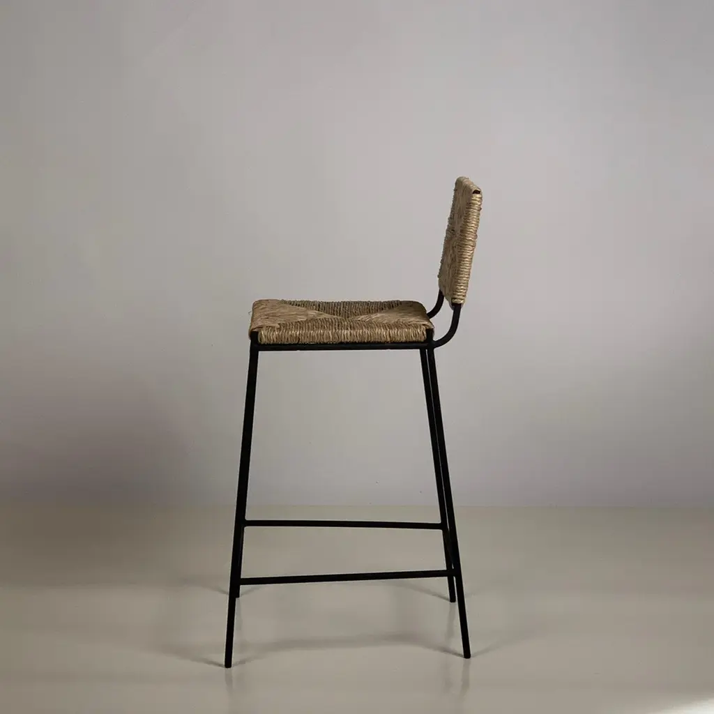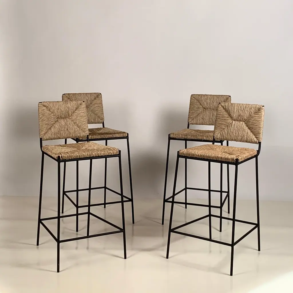 Set of 4 slender 'Campagne' counter stools by Design Frères.Comfortable, with a minimal footprint.Extra support under the rush seat.Feet pads to protect flooring.