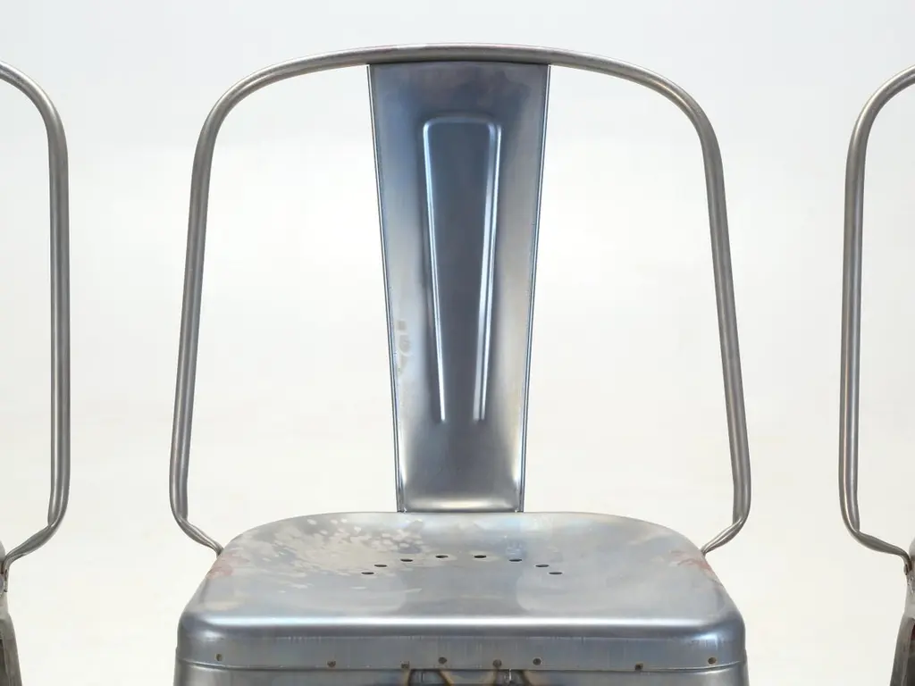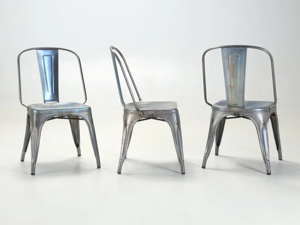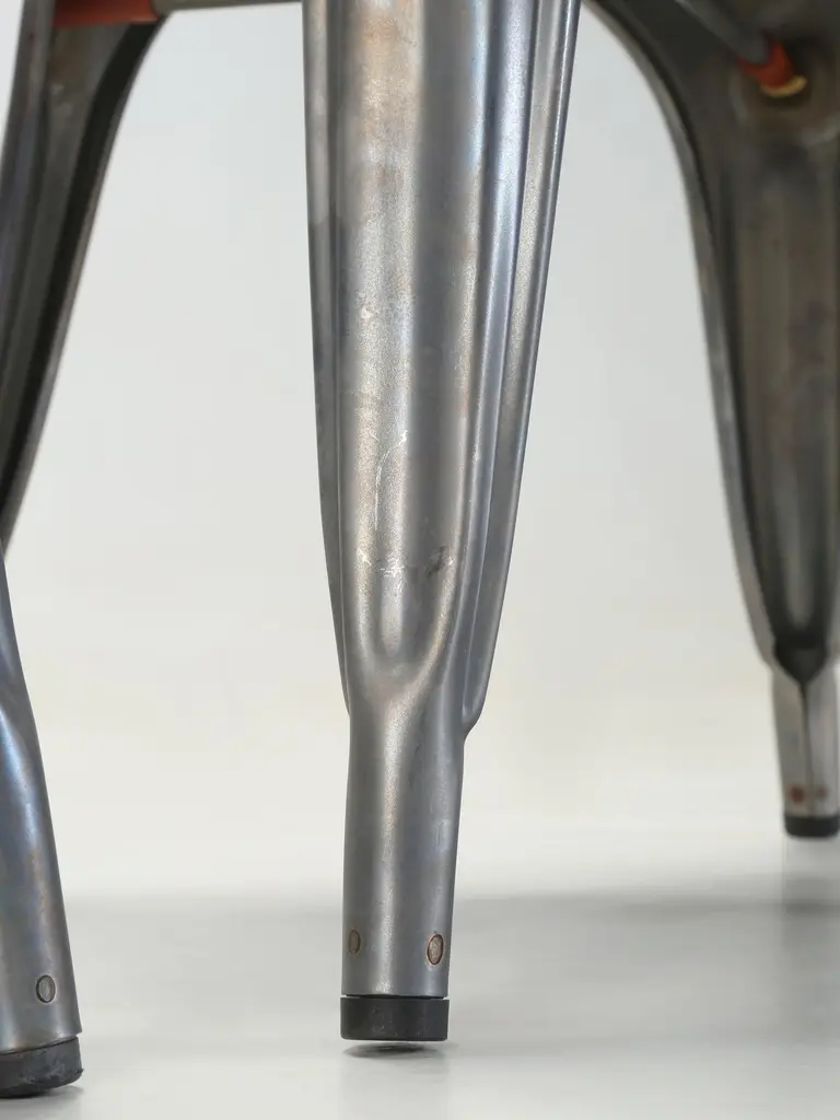 Set of (8) Genuine French Made Tolix AC Style Steel Stacking Chairs in Raw Welded Steel with a Grey-Blue protective wash. Tolix steel stacking chairs must be one of the most copied designs in history, for every time you turn around you will see them on another TV design show. Our set of (8) is also available in larger or smaller quantities and currently there are (5) more available along with a few counter stools. Our current inventory of Tolix stands plus or minus one-thousand pieces combined with both counter and bar height stools.