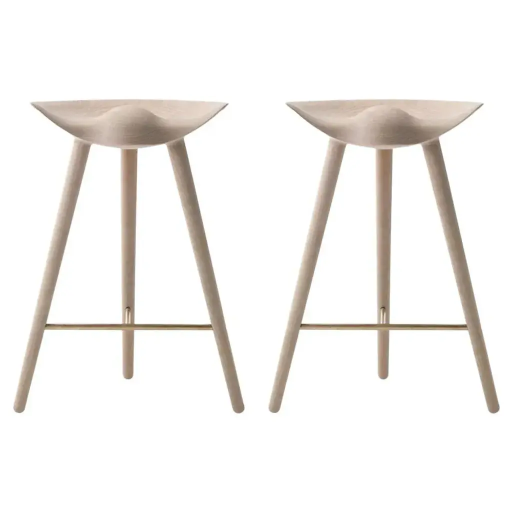 Set of 2 oak and brass counter stools by lassen dimensions: h 69 x w 36 x l 55.5 cm materials: oak, brass in 1942 mogens lassen designed the stool ml42 as a piece for a furniture exhibition held at the danish museum of decorative art. He took inspiration from the stools used by the shoemakers of the past, and transferred the light, elegant look to the creation of this sculptural three-legged stool. The stool ml42 is still manufactured in denmark to this day with a focus on quality and danish craftsmanship, and is considered a collector’s item by international design connoisseurs.
