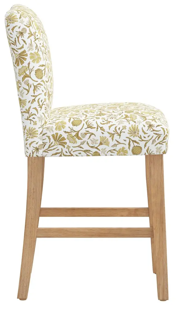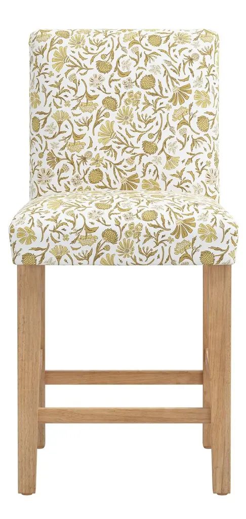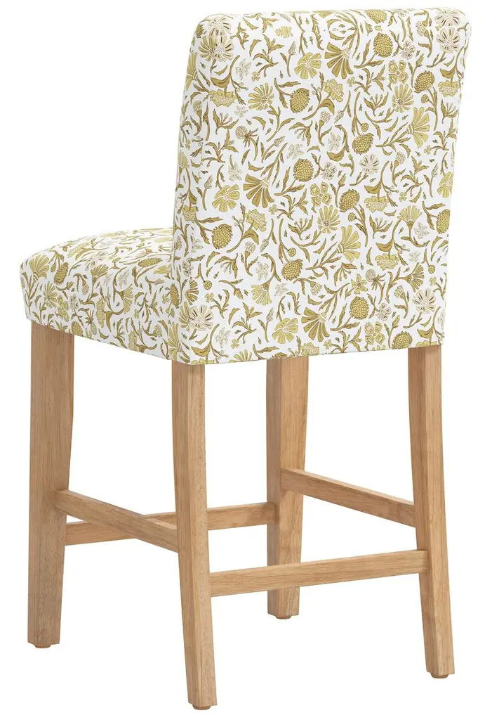 Exclusive to One Kings Lane: The floral motif of the upholstery, inspired by classic block prints, adds timeless allure to this clean-lined counter stool. Ample padding of both the seat and the back makes this stool as comfortable as it is chic.