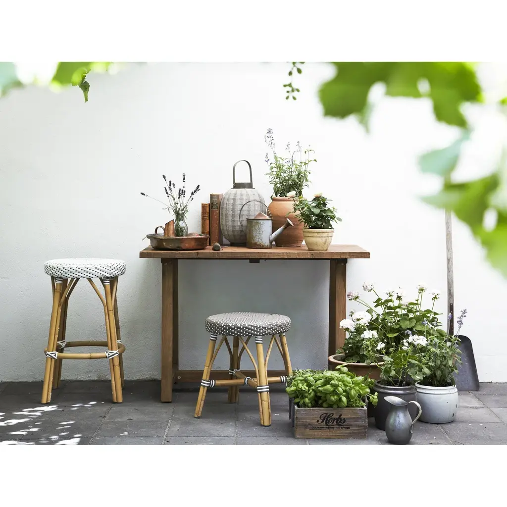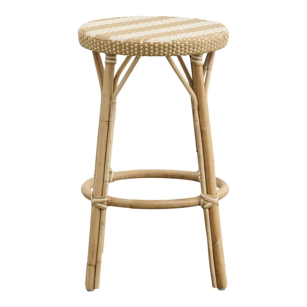 Part of the Affaire collection, the stools are for covered areas outside in summertime and for indoor use. The stools can stand a rain shower, but not daily rain. When used outdoors the rattan frame will turn greyish like teak. Do not use in heavy rain and do not leave outside all year long. The Simone Counter Stool is the perfect height for a kitchen island and also makes for versatile outdoor seating, adding an air of unassuming refinement wherever it is used. This stool is maintenance-free, crafted from all-natural rattan and polystrand bindings. Designed for indoor or covered outdoor use, the stool's rattan frame will patina to a lovely light gray finish over time. If the original natural rattan look is desired, rub with linseed oil.