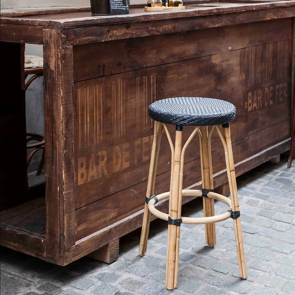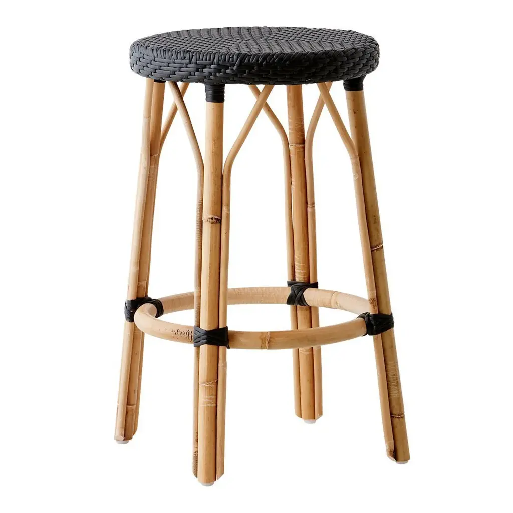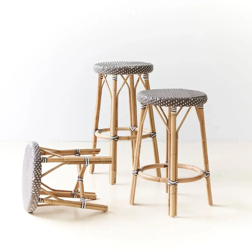 Part of the Affaire collection, the stools are for covered areas outside in summertime and for indoor use. The stools can stand a rain shower, but not daily rain. When used outdoors the rattan frame will turn greyish like teak. Do not use in heavy rain and do not leave outside all year long. The Simone Counter Stool is the perfect height for a kitchen island and also makes for versatile outdoor seating, adding an air of unassuming refinement wherever it is used. This stool is maintenance-free, crafted from all-natural rattan and polystrand bindings. Designed for indoor or covered outdoor use, the stool's rattan frame will patina to a lovely light gray finish over time. If the original natural rattan look is desired, rub with linseed oil.