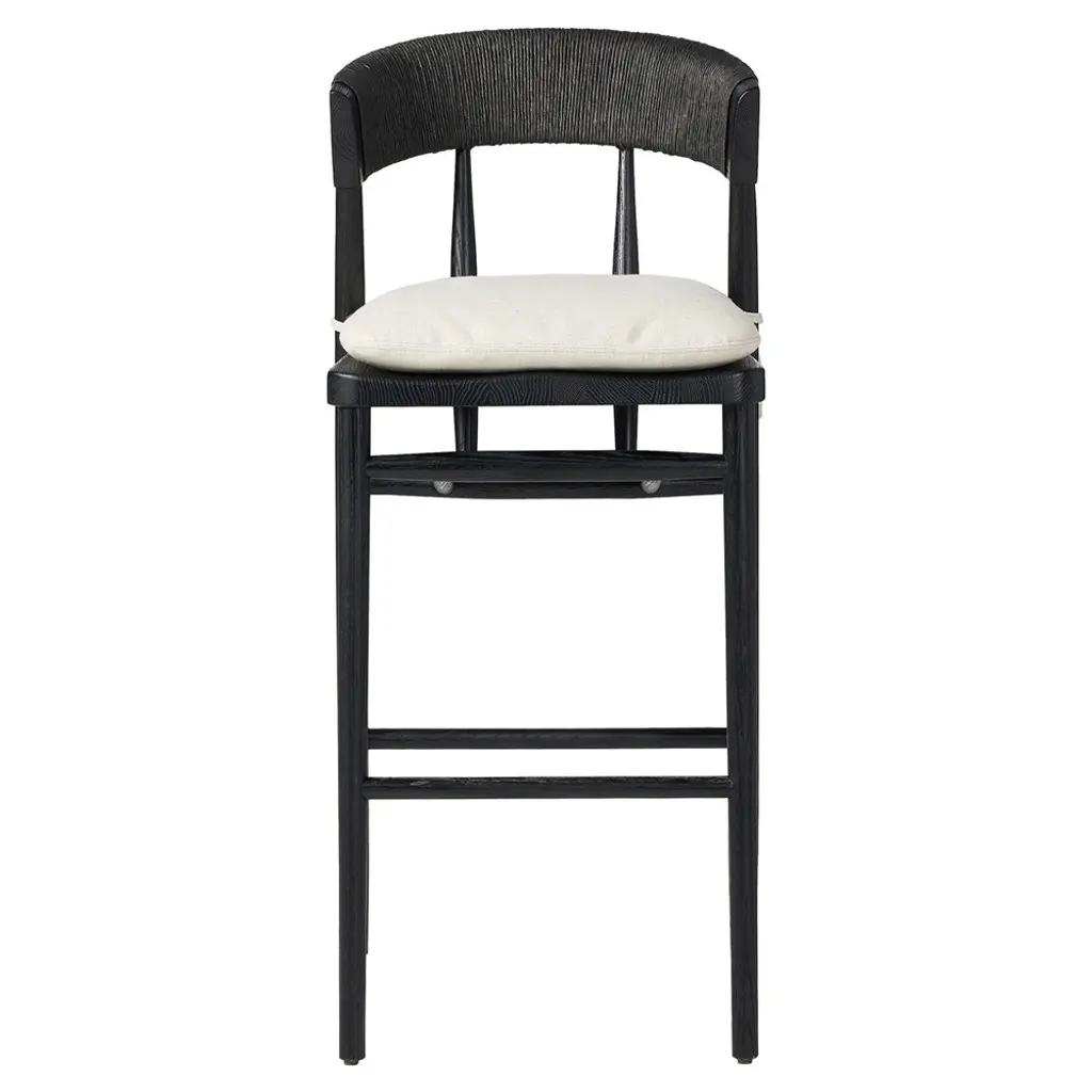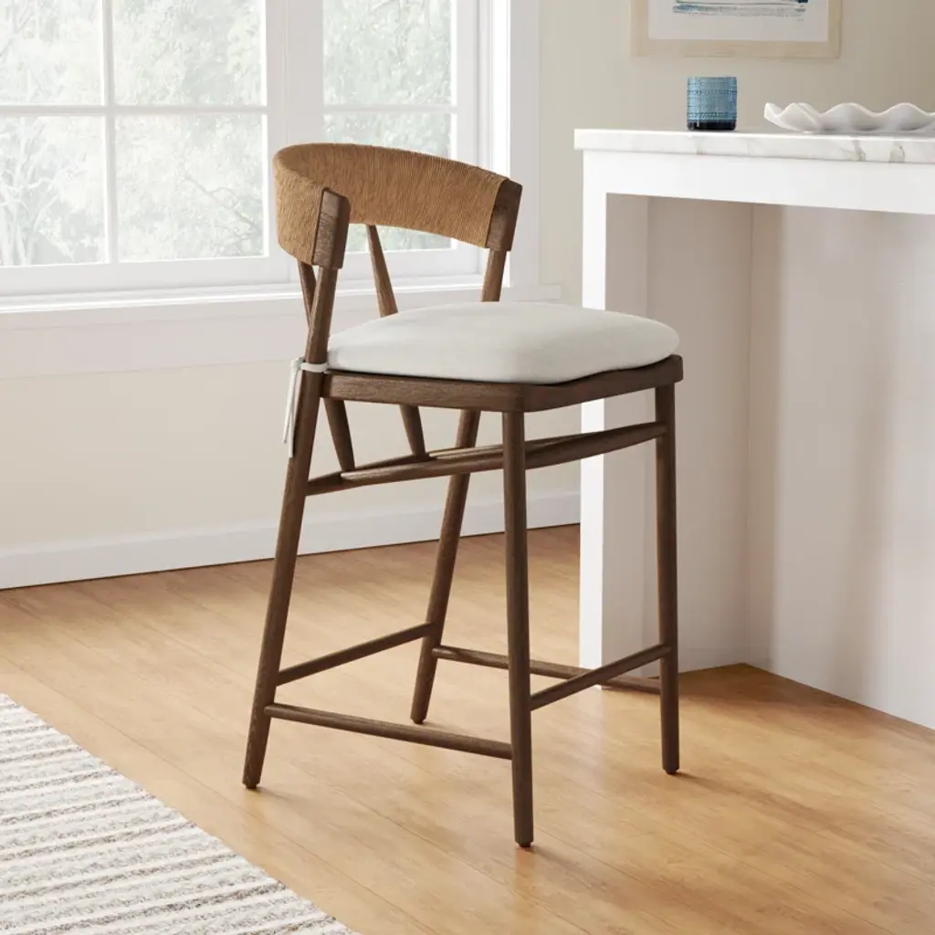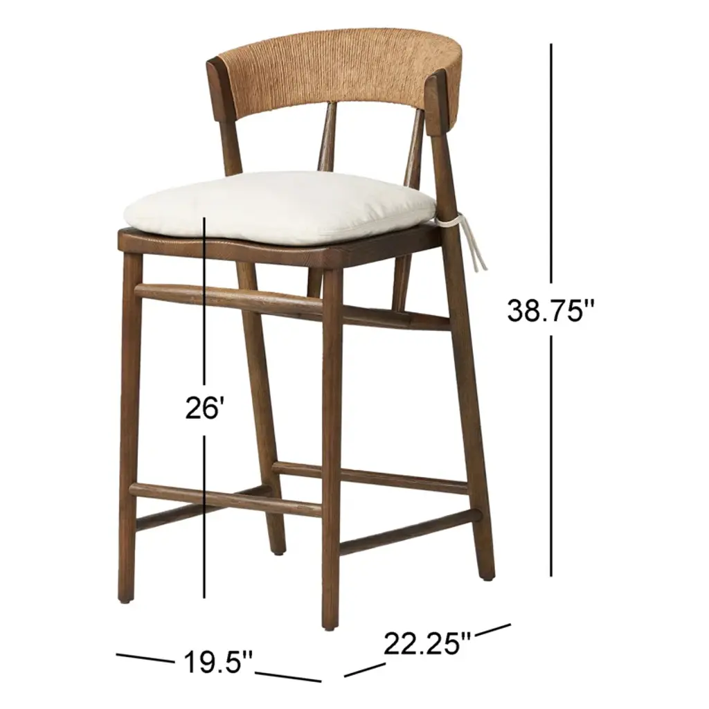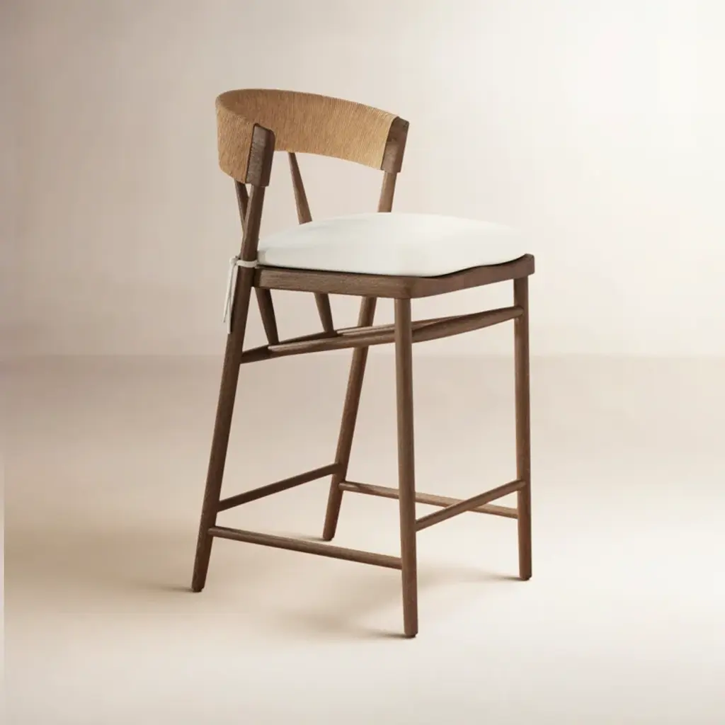 A solid oak counter stool defined by tapered legs and framing gives an updated look to the classic whistler chair. Finished with a paper rush wrapped detail on the back.