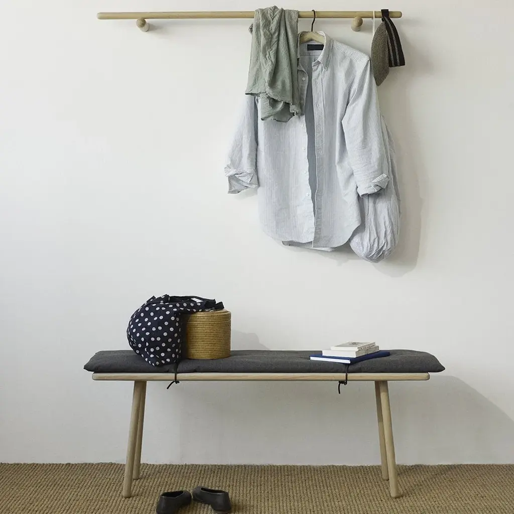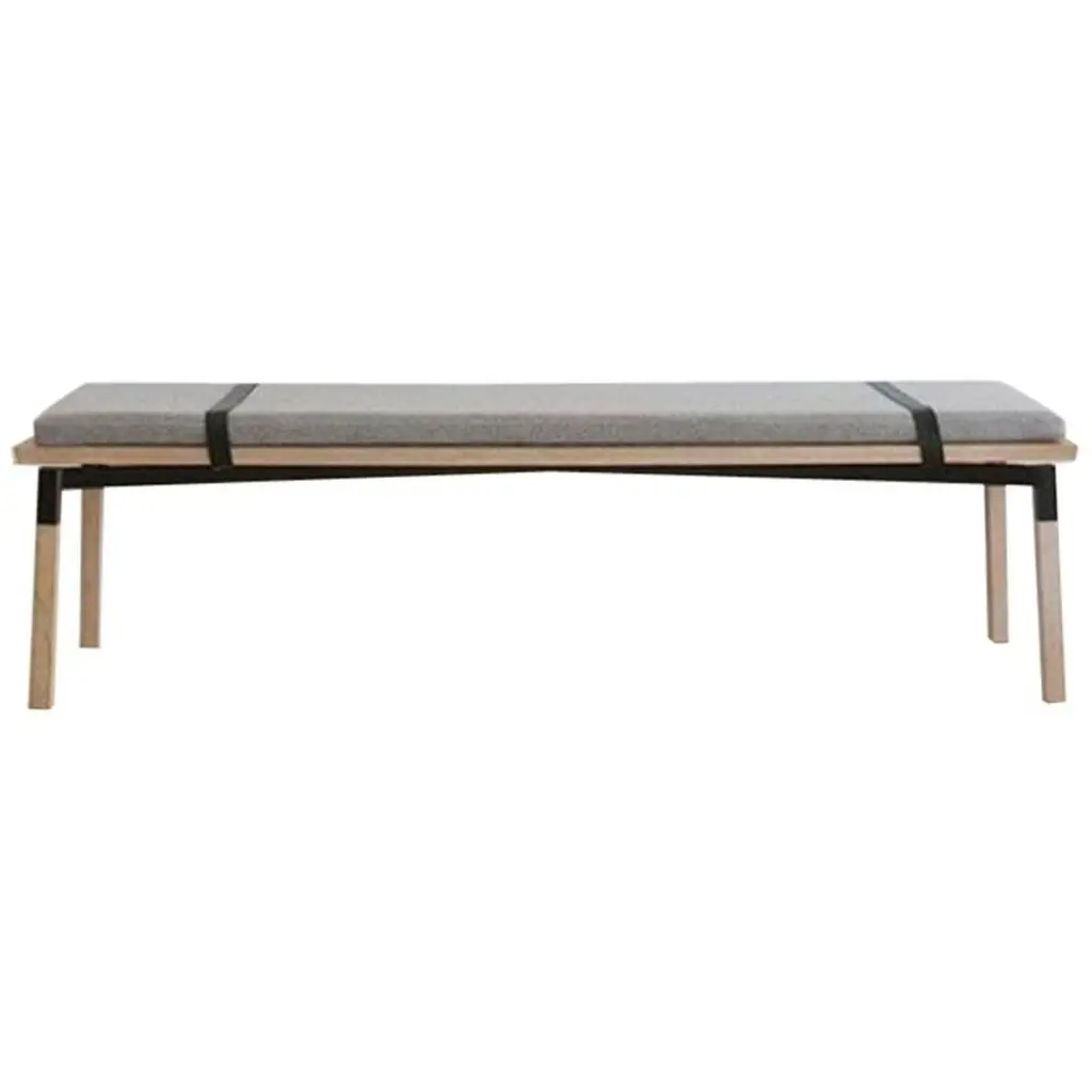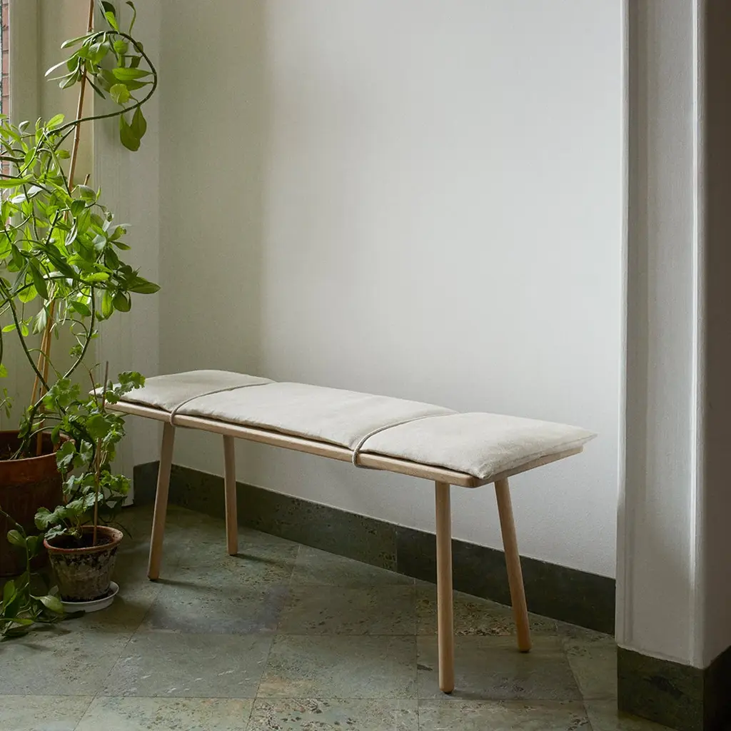 The Georg Bench is an extension of the stool with its very own unique qualities, for while the stool strikes a more solitary expression, the bench is inviting and generous. It has room for more. The grey wool cushion extends slightly beyond the seat, inviting the user to feel the textural quality and the material encounter of textile, leather and wood.