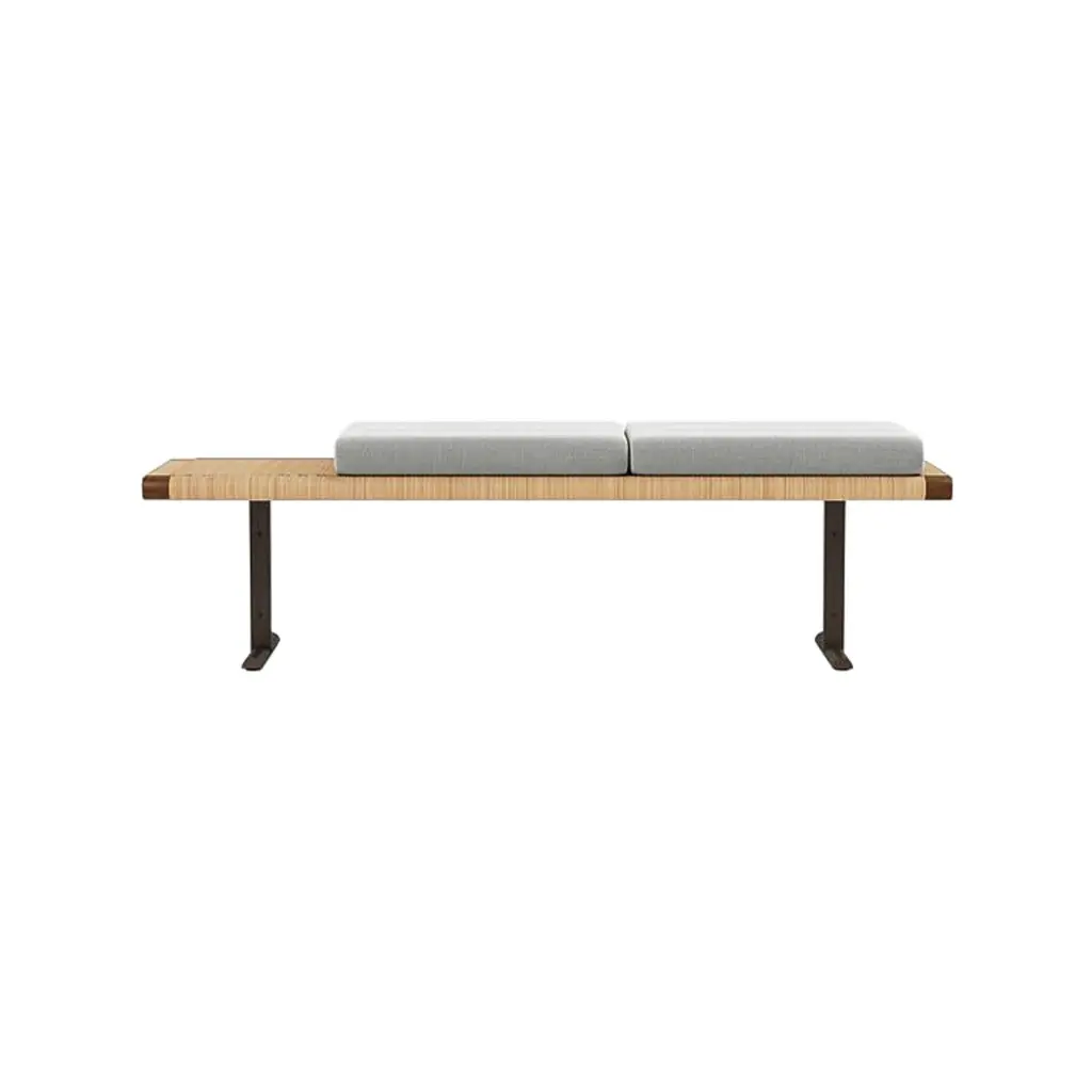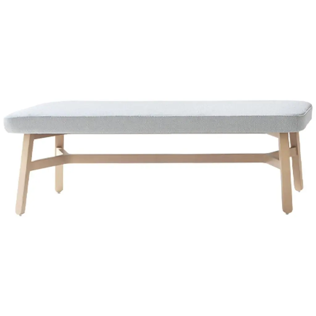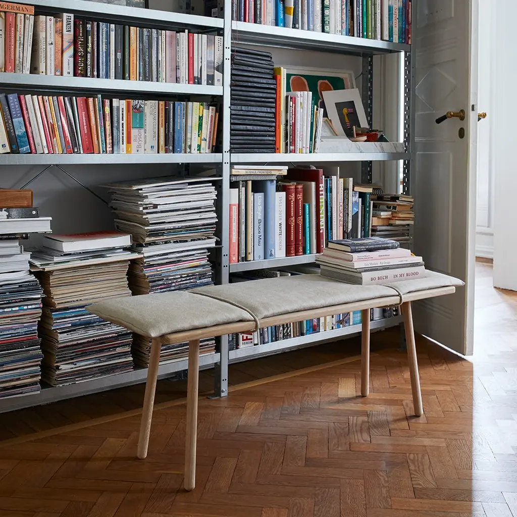 The Georg Bench is an extension of the stool with its very own unique qualities, for while the stool strikes a more solitary expression, the bench is inviting and generous. It has room for more. The grey wool cushion extends slightly beyond the seat, inviting the user to feel the textural quality and the material encounter of textile, leather and wood.