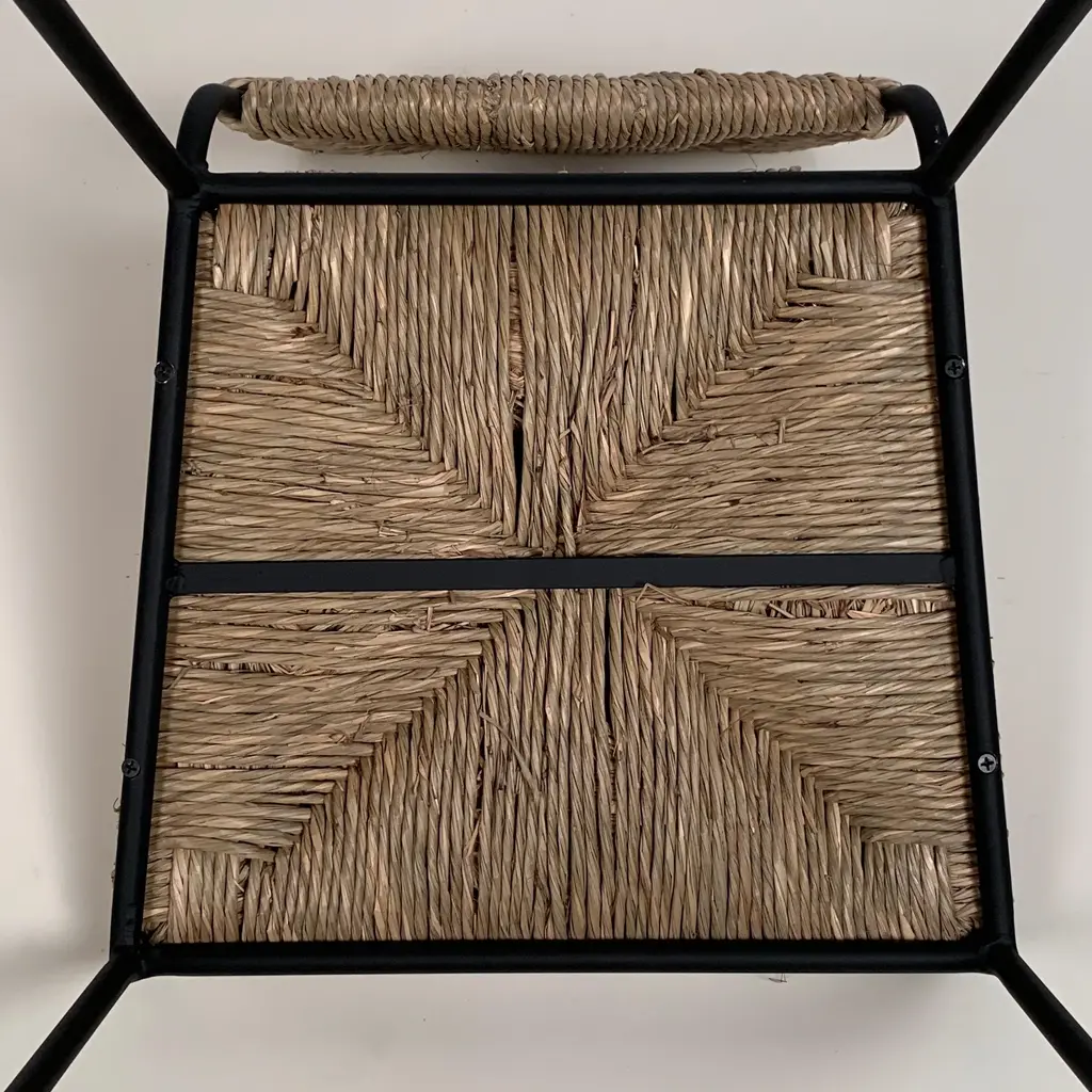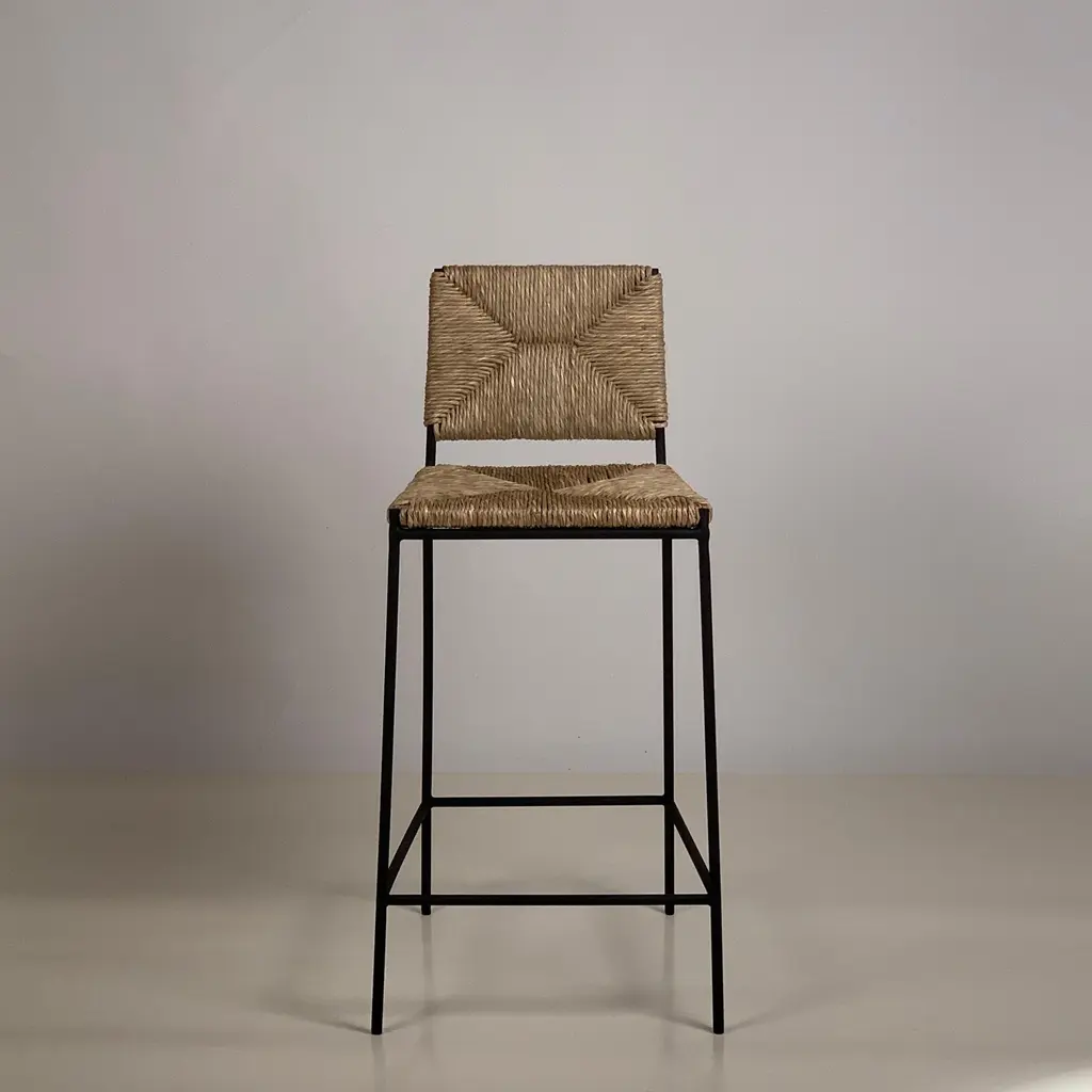 Set of 4 slender 'Campagne' counter stools by Design Frères. Comfortable, with a minimal footprint. Extra support under the rush seat. Feet pads to protect flooring.