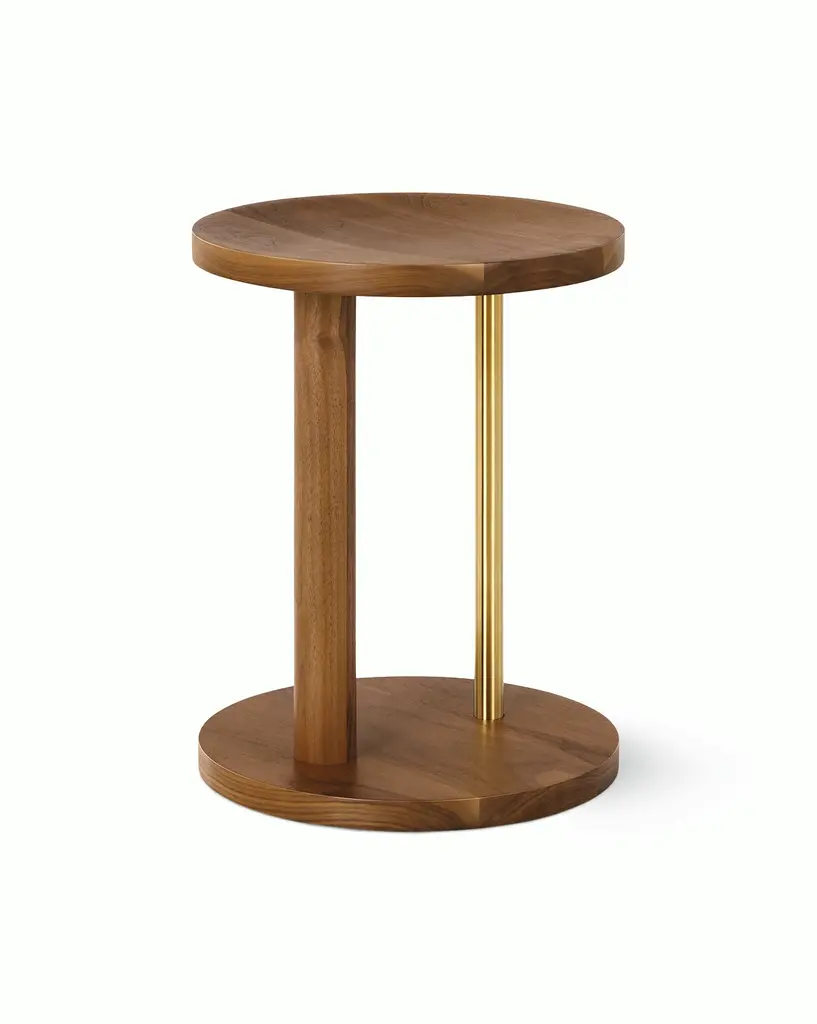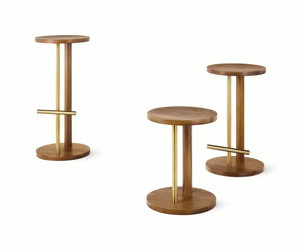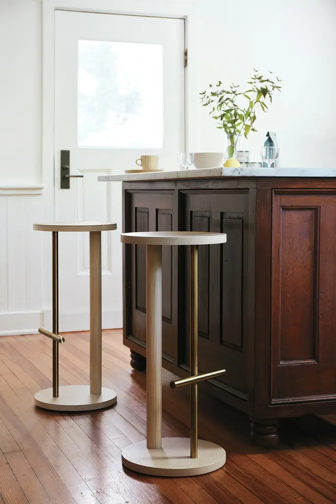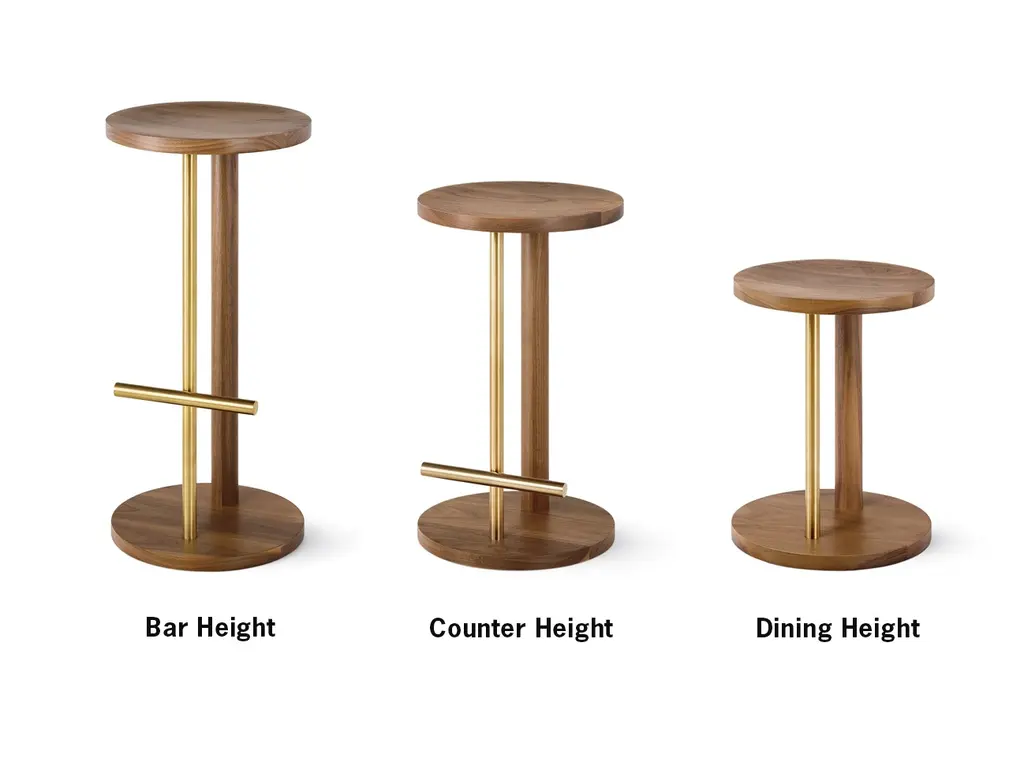 A deconstructed cylindrical shape refined to its bare essentials, the Spot Stool (2016) brings an austere sense of elegance to any interior. Two parallel legs join the circular seat and base together in a kindred pairing of metal and wood. Offered in three heights, with the two tallest outfitted with a crossbar footrest, this modern counter stool was designed by Michael Anastassiades.