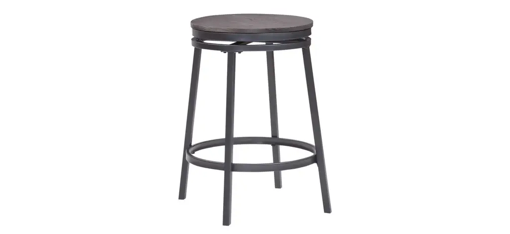 The Stockton backless stool offers a sleek and transitional styling perfect for any d_cor. A neutral grey oak finish is used on the seat with a slate gray metal on the base. A 360-degree swivel and comfortable footrest allows guests to enjoy the entire room.