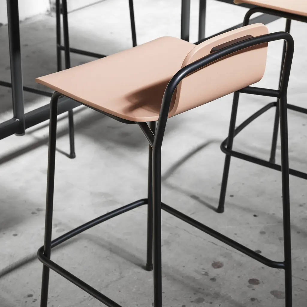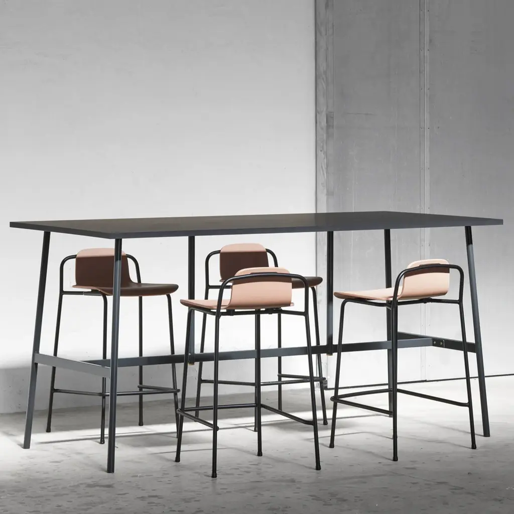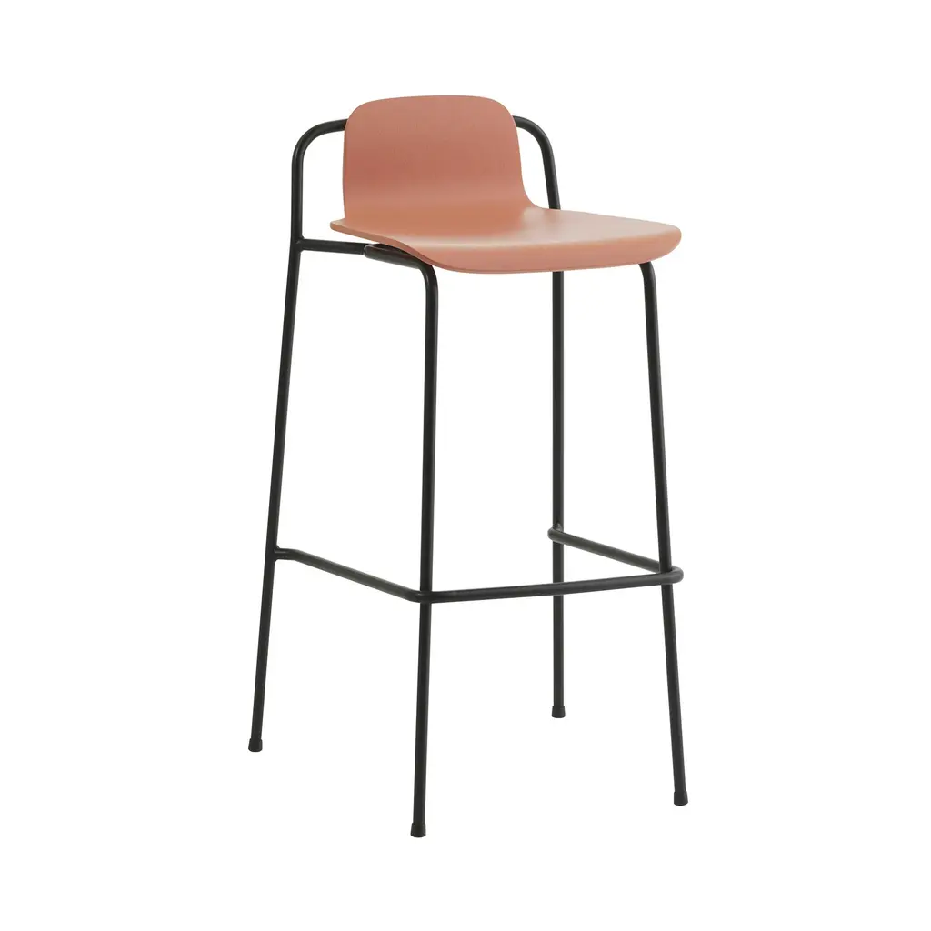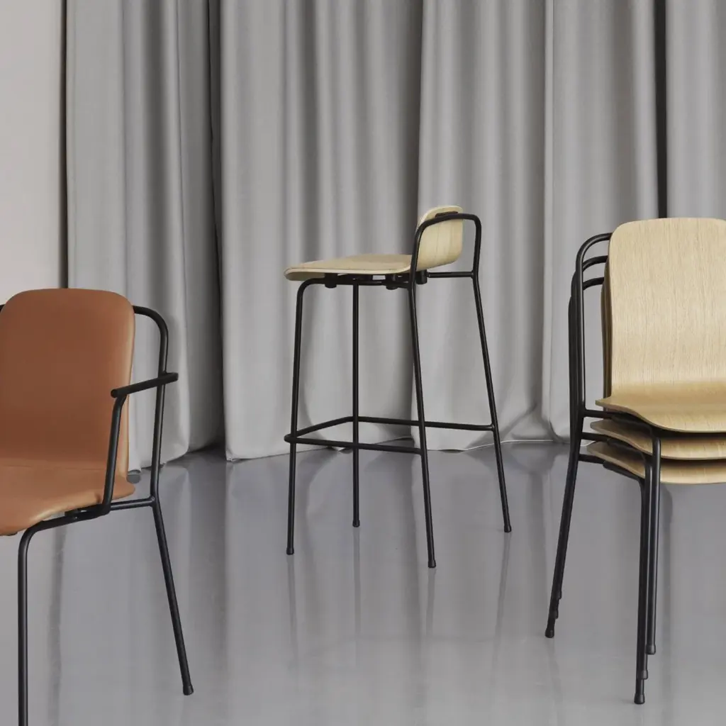 Designer Simon Legald's modernist Studio template expands with this bar and counter stool for Normann Copenhagen. With its signature flowing lines, the slender black frame graphically complements the molded wood-veneer shell. More than just an eye-catching silhouette, the ergonomic seat is also deeply comfortable. And the stool is handily stackable when not in use—ideal for hospitality areas or educational venues—and the steel frame makes it easy to grab hold of and move around.