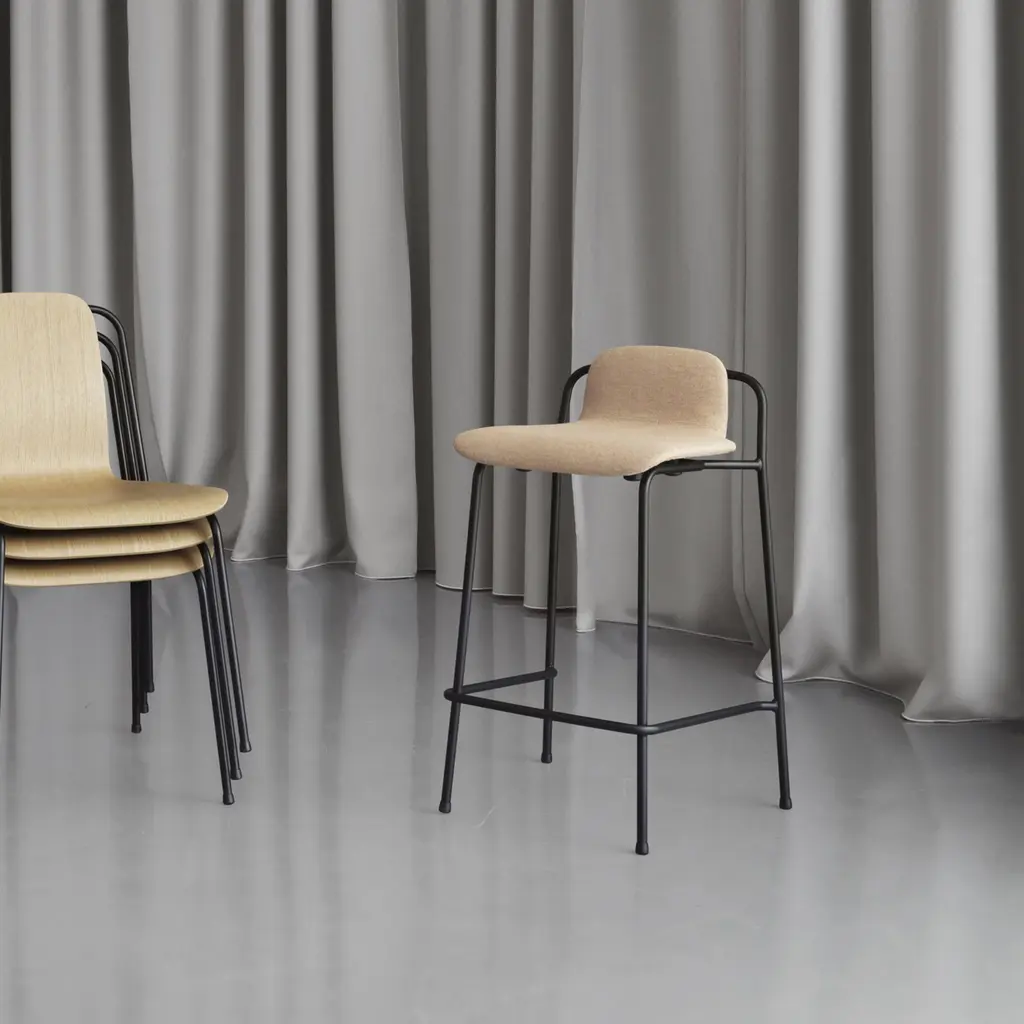 Normann Copenhagen offers a fully upholstered addition to designer Simon Legald's signature Studio collection with this bar- and counter-height stool. With the molded shell completely clad in one of the high-quality fabric or naturally treated leather options, it creates a striking impression with the graphic contrast of the black metal frame. Apropos wherever a completely custom look is desired. the seating performs equally well in both contract and residential environs.