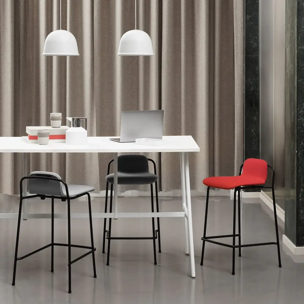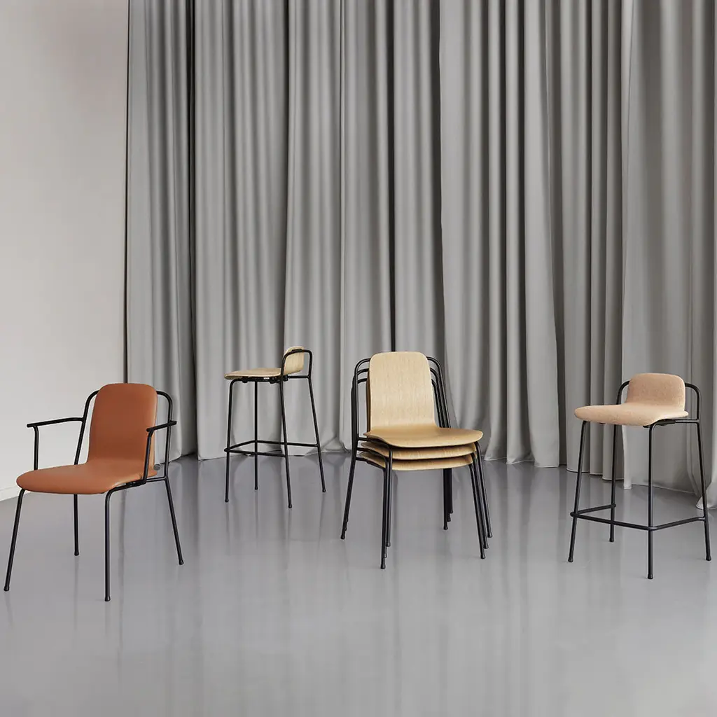 There is something virtually graphic about the way the slender steel frame grows out below the Studio chair's seat and back, framing the molded shell in an airy design. The flowing lines stand out in an eye-catching silhouette, like a line drawing or a pictogram, just as the empty spaces between the frame and the back act to define the shape. The simple construction in veneer and steel tubing directs one's thoughts towards older French factory chairs, giving Studio its industrial notes. A design that attracts attention, but glows with pure simplicity. The multi-purpose Studio chair series is designed for use in both domestic and public spaces. The series includes chairs, armchairs and barstools in two heights. All models are stackable, making the range suitable for restaurants and educational facilities with the need for transformable areas. The steel frame makes it easy to grab hold of the chairs and move them around as required.