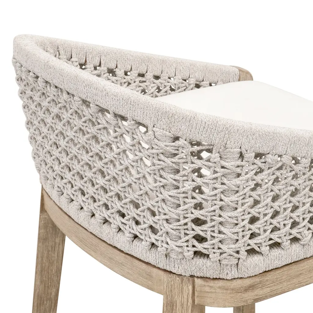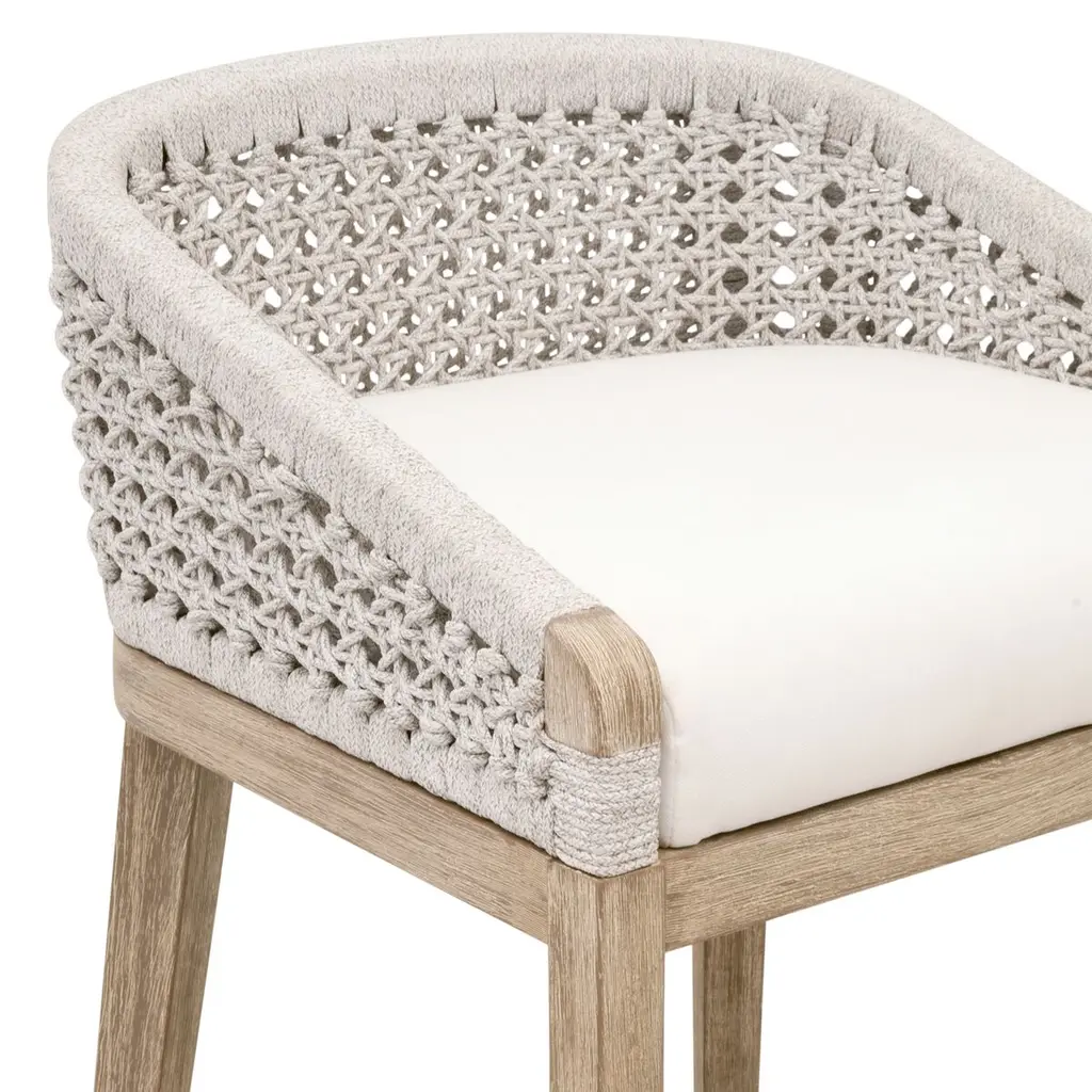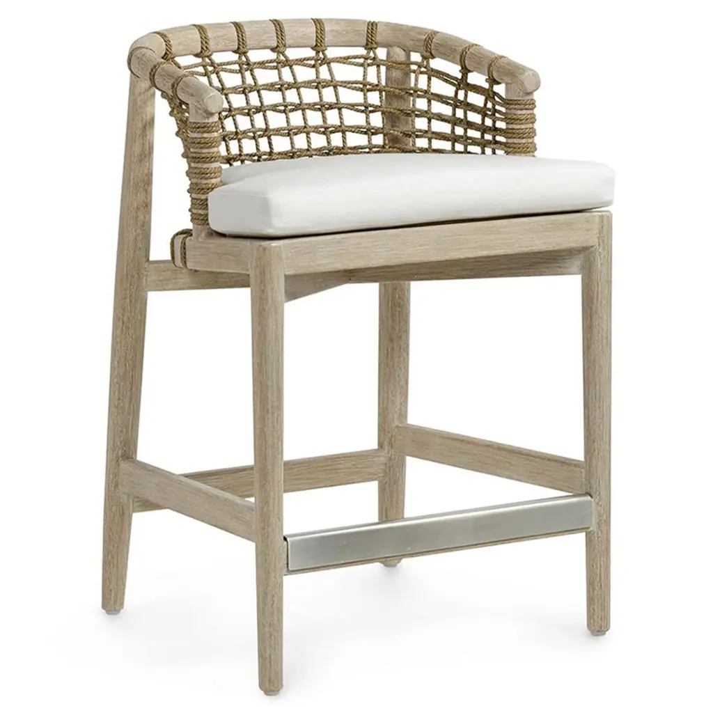 The Sununy Counter Stool offers a contemporary take on coastal style, perfect for transitional spaces. With a sturdy base and frame supporting the rope seat, this stool stands at 21” wide, 21.5” deep, 32.25" high, with a seat height of 27". The handwoven rope seat adds a unique textural element. The fixed seat cushion is upholstered with high-performance fabric, which makes cleaning easy. The legs are designed with extra support in mind, crafted with an X-brace with rope detail at the center. The footrest features a metal cover to provide durability and support. This beach-inspired counter stool will be a lasting addition to any bar or dining space.
