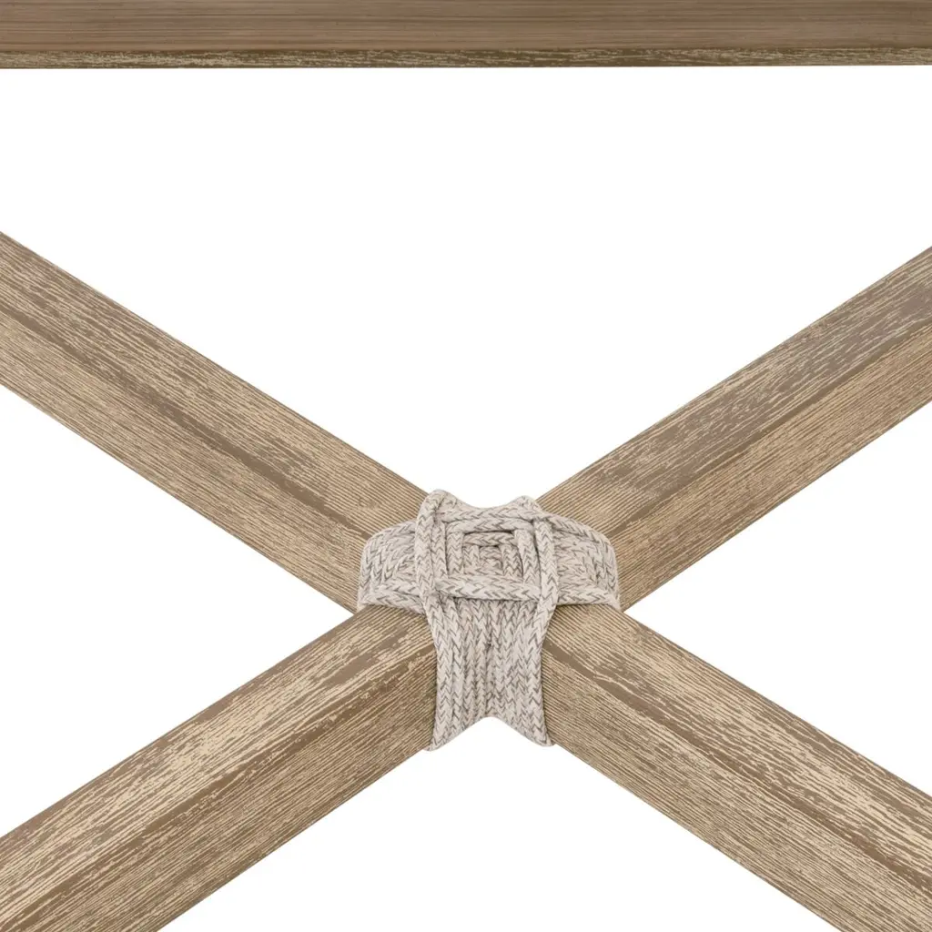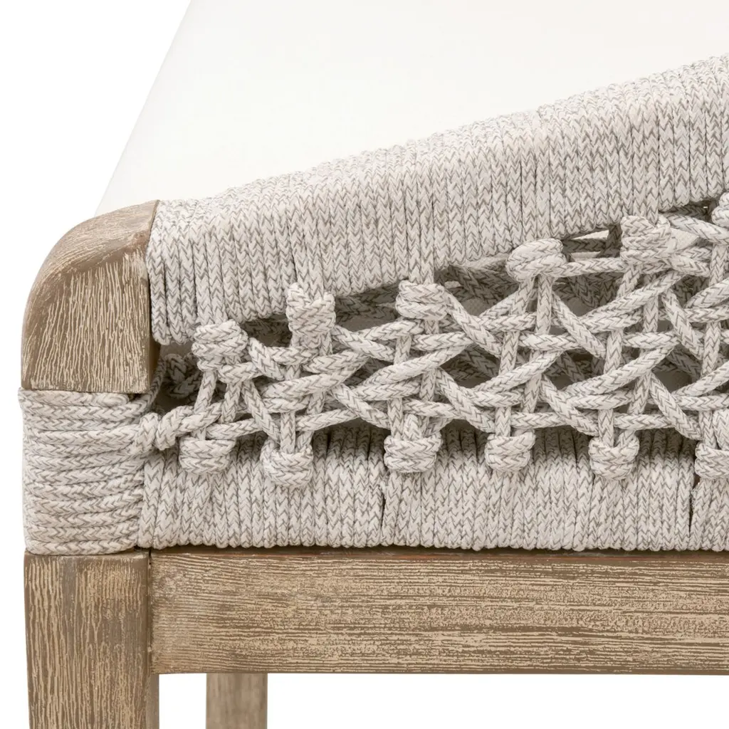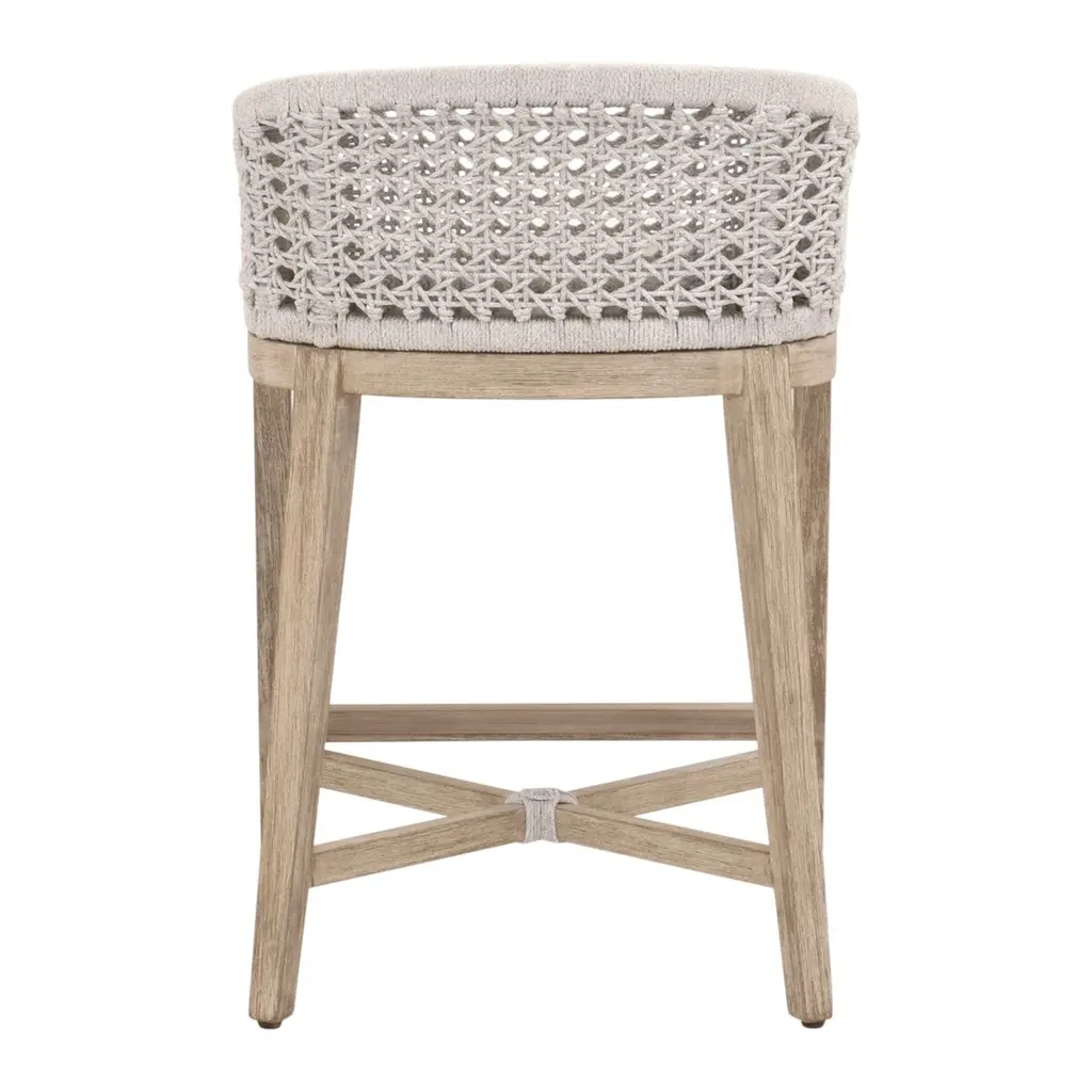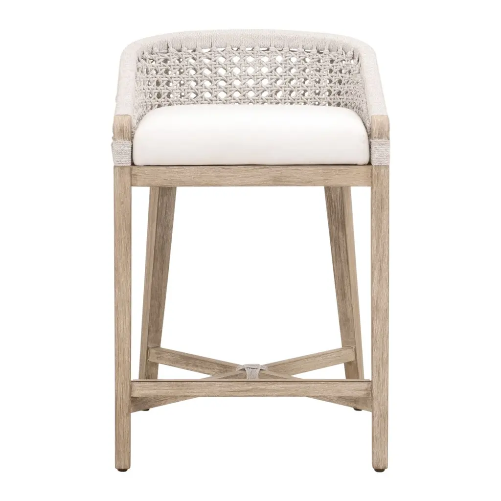 The Sununy Counter Stool offers a contemporary take on coastal style, perfect for transitional spaces. With a sturdy base and frame supporting the rope seat, this stool stands at 21” wide, 21.5” deep, 32.25" high, with a seat height of 27". The handwoven rope seat adds a unique textural element. The fixed seat cushion is upholstered with high-performance fabric, which makes cleaning easy. The legs are designed with extra support in mind, crafted with an X-brace with rope detail at the center. The footrest features a metal cover to provide durability and support. This beach-inspired counter stool will be a lasting addition to any bar or dining space.