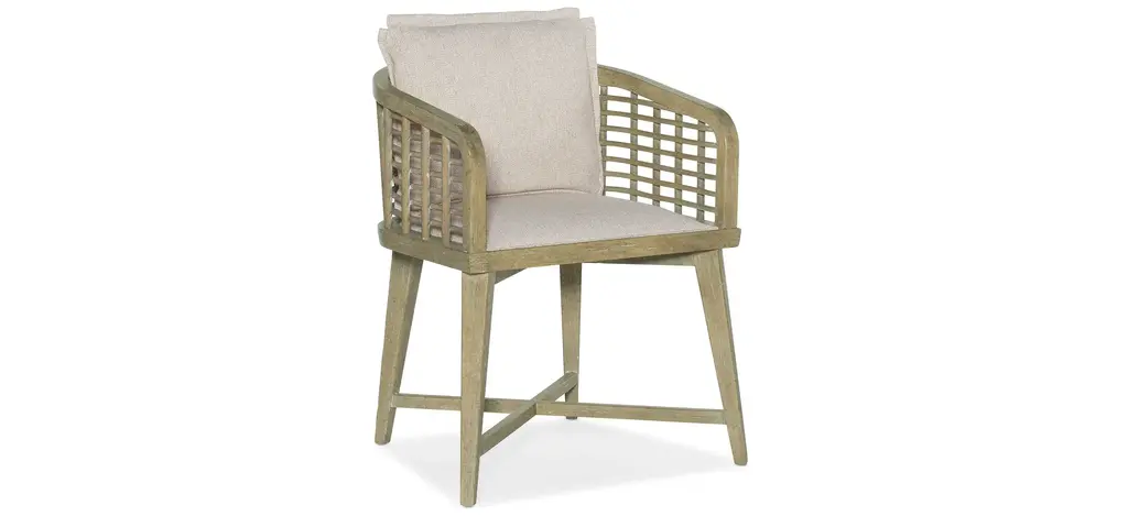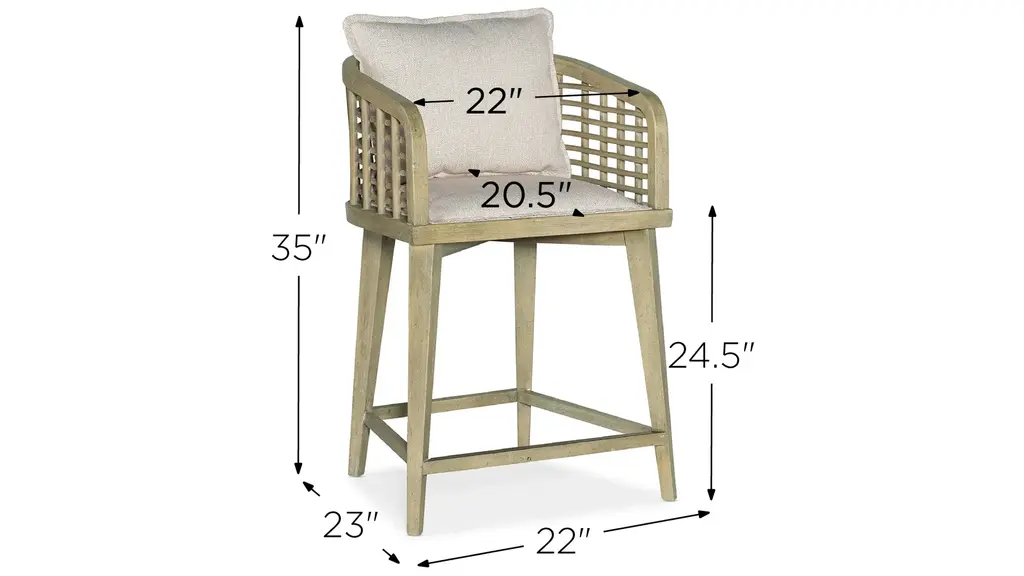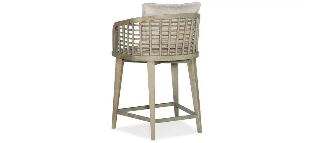 Create a calming resort-inspired retreat in your home with the laid-back, 35-inch high Surfrider Barrel Back Counter Stool. The appealing lattice design of the cane seat back combines with a loose back pillow and an upholstered seat covered in the Zuri Cream performance fabric to invite you to linger and relax. The legs, arms and footrest are finished in the light natural Driftwood finish, and the footrest has a Copper sheet for durability and an extra design detail.