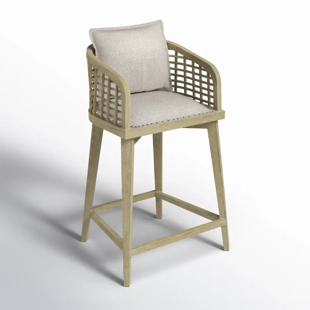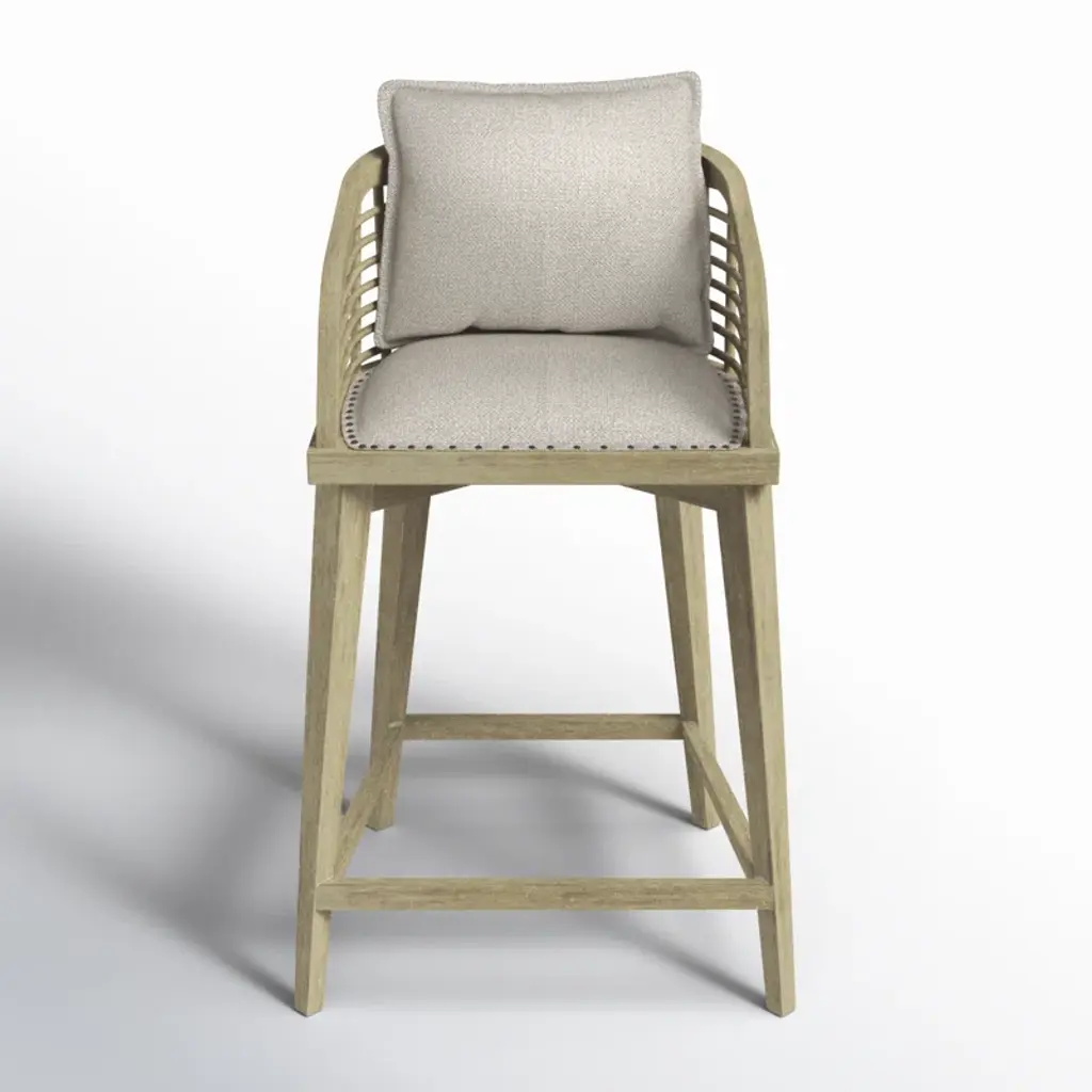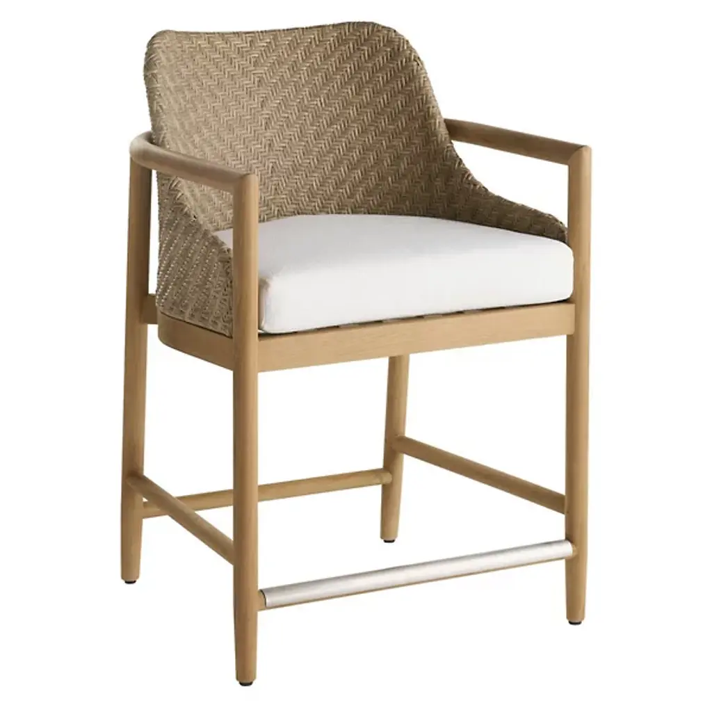 Create a calming resort-inspired retreat in your home with the laid-back, 35-inch high Barrel Back Counter Stool. The appealing lattice design of the cane seat back combines with a loose back pillow and an upholstered seat covered in the Zuri Cream performance fabric to invite you to linger and relax. The footrest has a Copper sheet for durability and extra design detail. Melding the salty, yet cozy oasis of the California coastline with modern surf culture, Surfrider is defined by the use of natural materials including rattan, jute rope, stone, gypsum, bamboo, and driftwood motifs. Designed to create relaxing spaces to escape from the pressures of modern life, it is featured in a light, natural Driftwood finish. Luxurious materials, shapes, and textures combine to create a relaxed, yet sophisticated style that epitomizes the lifestyle of a casual, beach-town community.