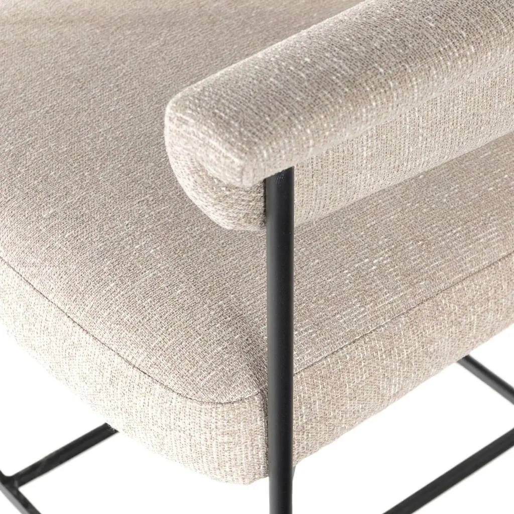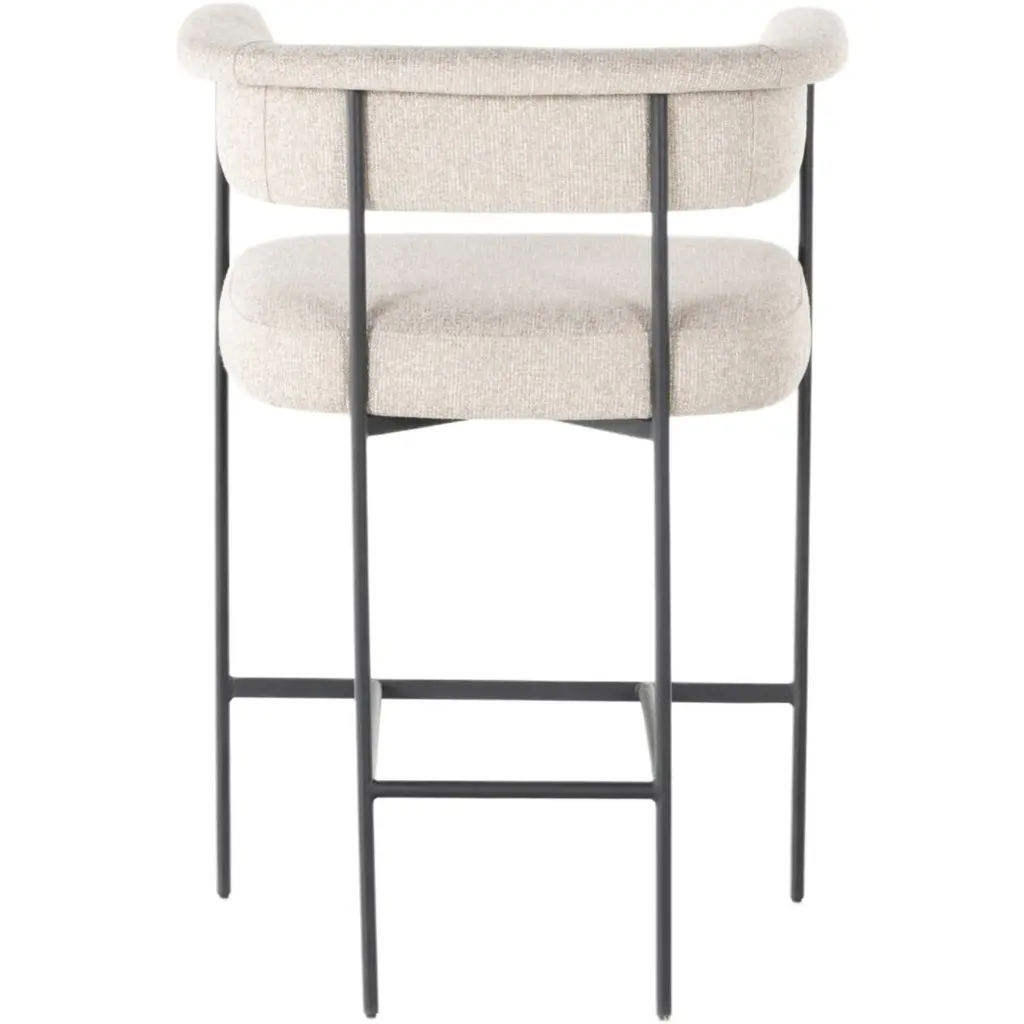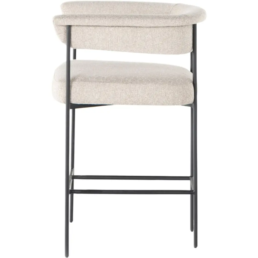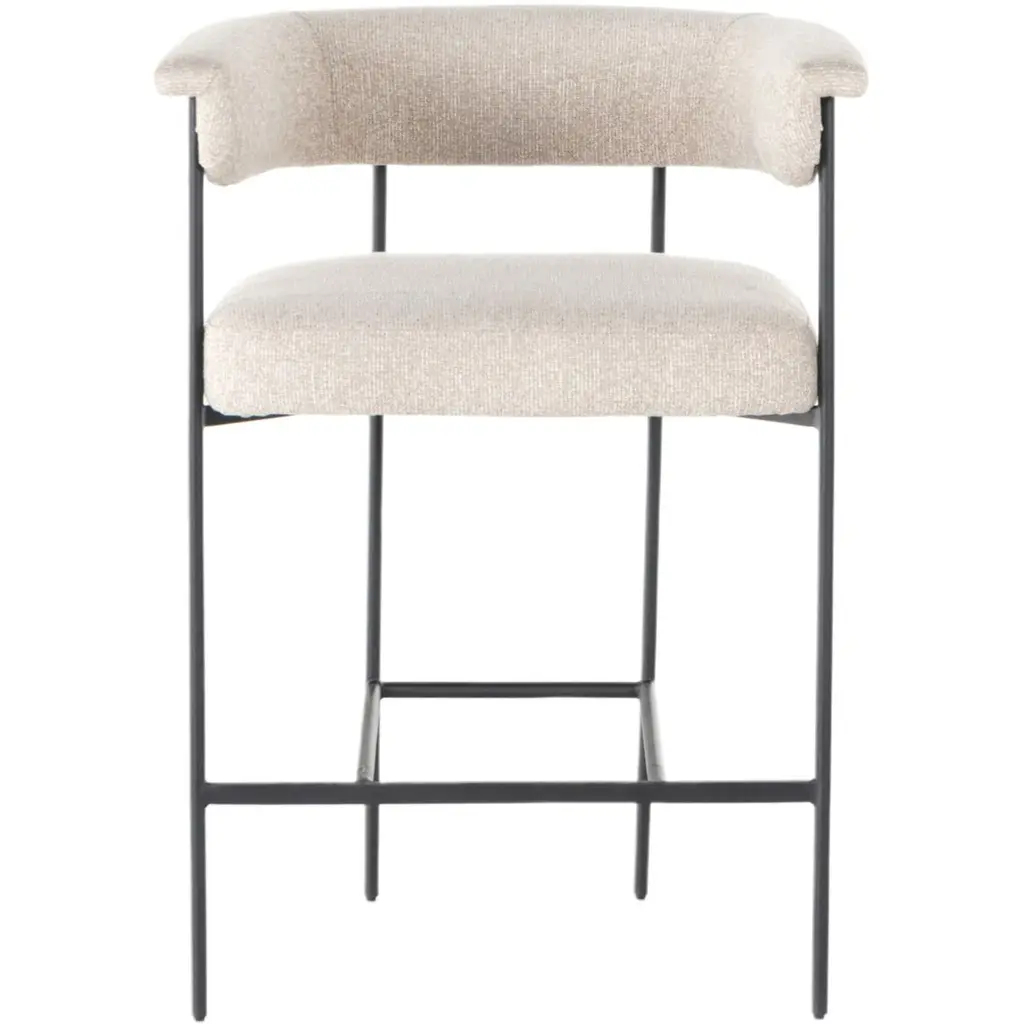 The Tate Counter Stool exudes an airy and light presence with its slim, black-finished iron framing. This beautifully sculpted bar stool is designed with a yoke back and features elegant fold detailing. Its upholstery adds a touch of texture, making it a sophisticated addition to any space.