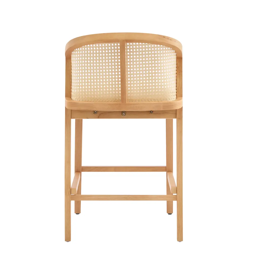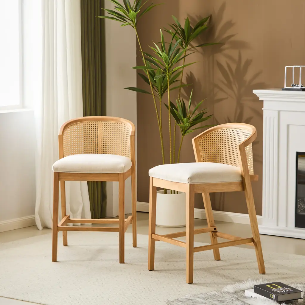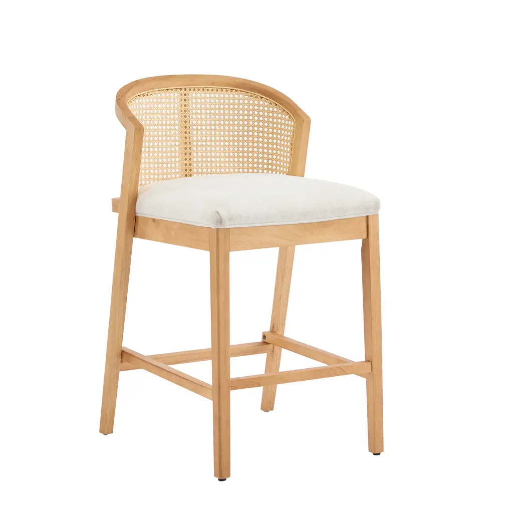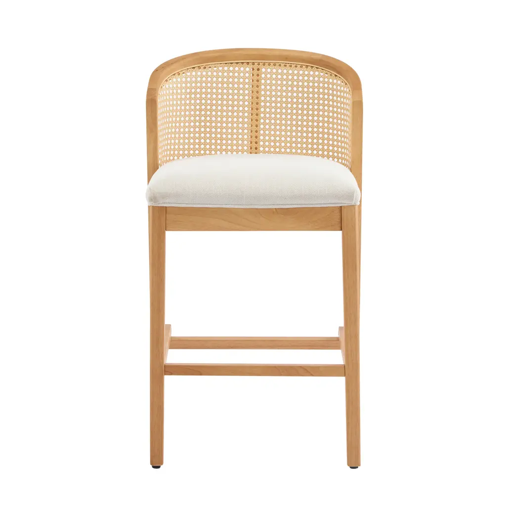 Warm Rubberwood Base: Crafted from rich, light-toned rubberwood, this stool embodies organic warmth. The solid frame ensures lasting durability, while the natural grain patterns add earthy character.. Plush Beige Cushion: Sink into a generously padded, beige seat crafted for comfort. The wide, thick cushion invites lingering conversations or casual meals, with a neutral tone that complements any palette.. Rattan-Accented Curved Backrest: A rattan panel adorns the mid-height, arched backrest, introducing texture and bohemian charm. The ergonomic curve cradles your posture, blending style with support.. Low-Profile Versatility: Designed for lower counters or coffee tables, this stool adds flexible seating to lounges, casual bars, or eclectic homes. Its compact height ensures easy integration into cozy spaces.. Natural-Modern Fusion: The blend of wood, rattan, and soft fabric creates a harmonious mix of textures. Perfect for boho, Scandinavian, or transitional interiors seeking warmth without clutter.. Included: Two (2) Counter Stools. Assembly Required