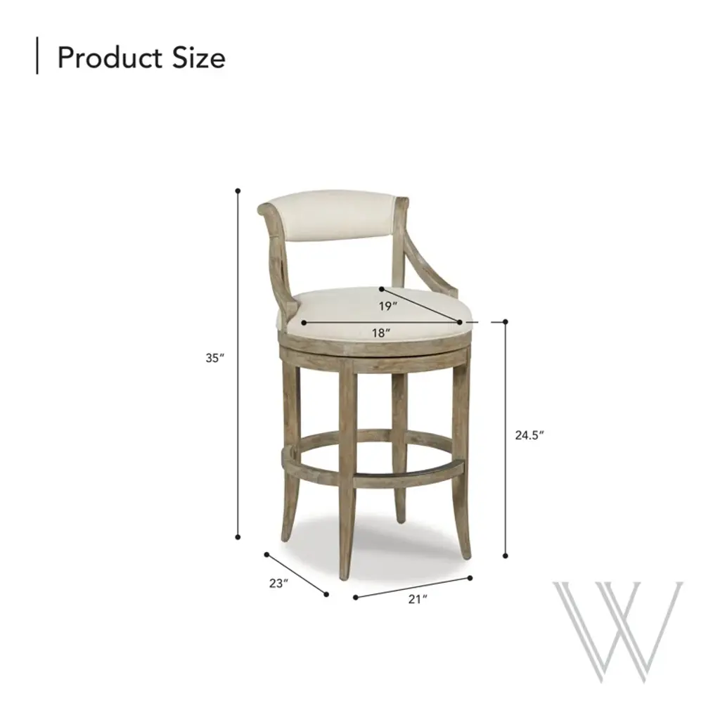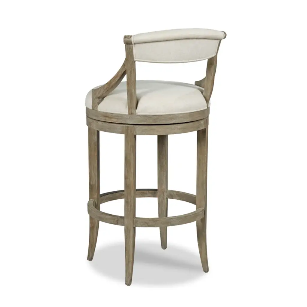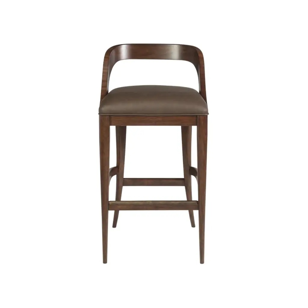 This stool curved upholstered top rail rests above an upholstered seat raised by squared tapering legs. Crafted from hardwood solids.