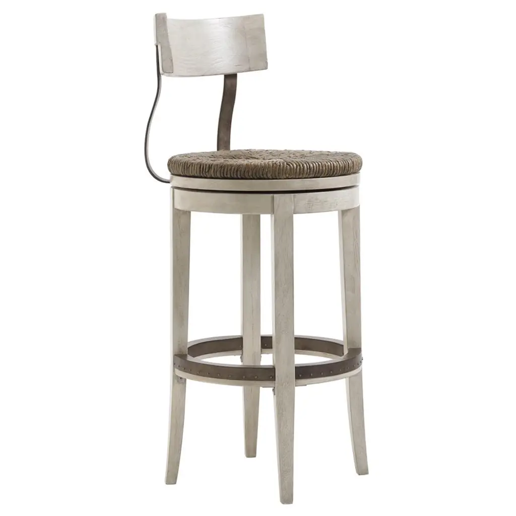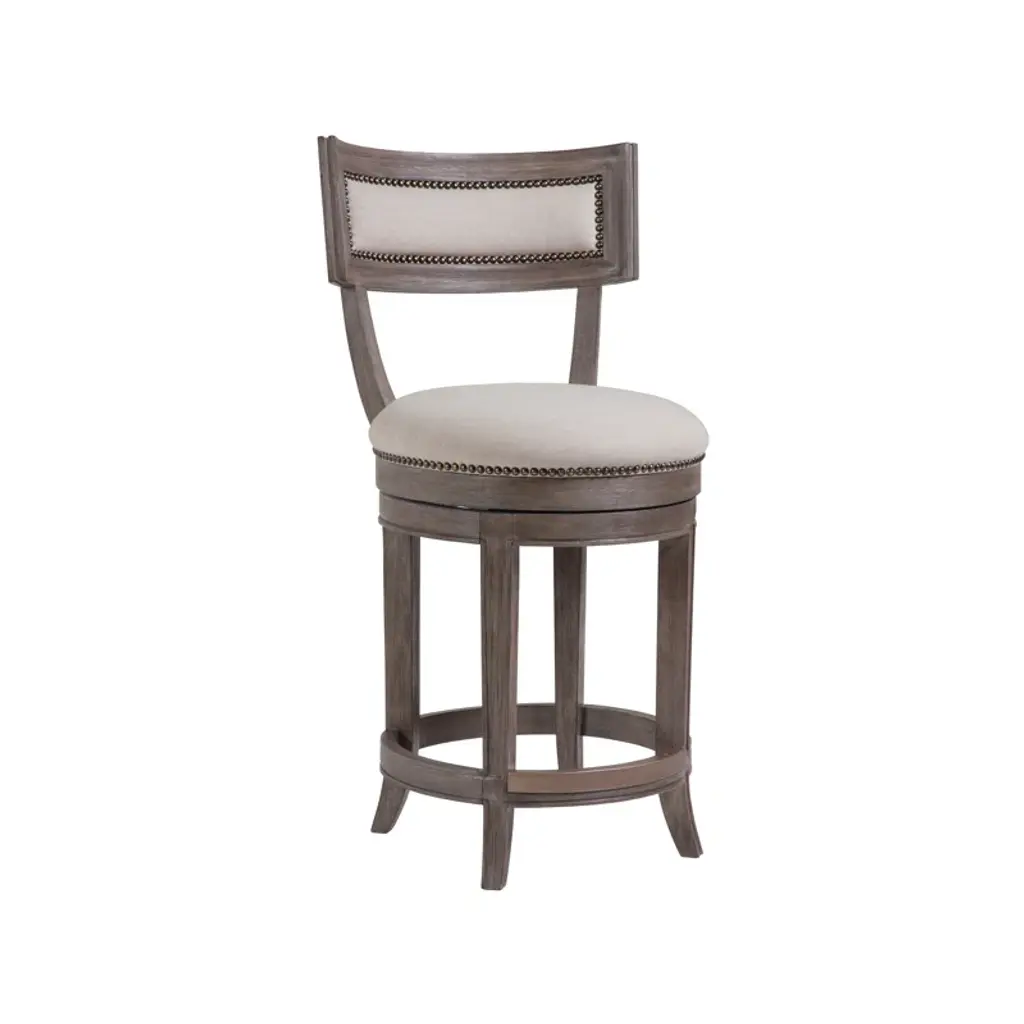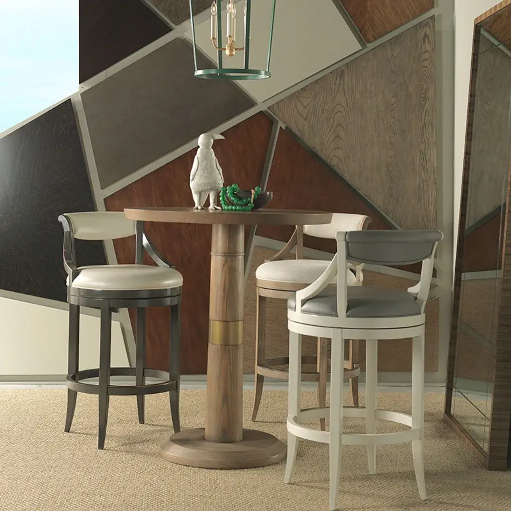 This stool curved upholstered top rail rests above an upholstered seat raised by squared tapering legs. Crafted from hardwood solids.