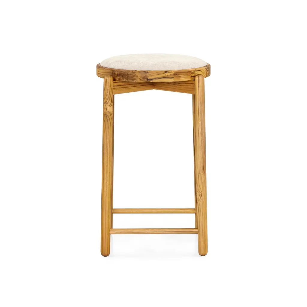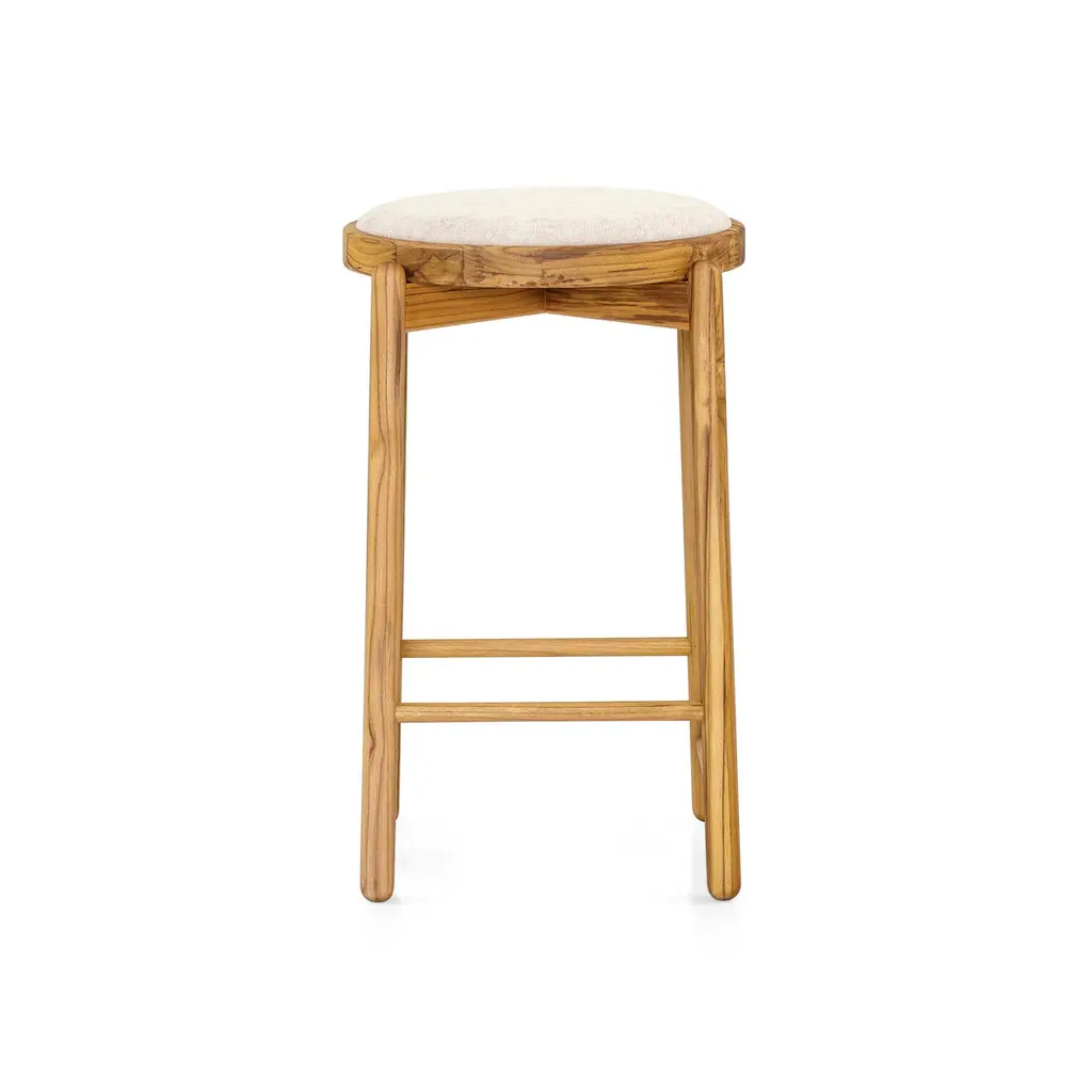 Teak Wood Counter Stool With Beige Upholstery And Matte Finish, Maru Collection