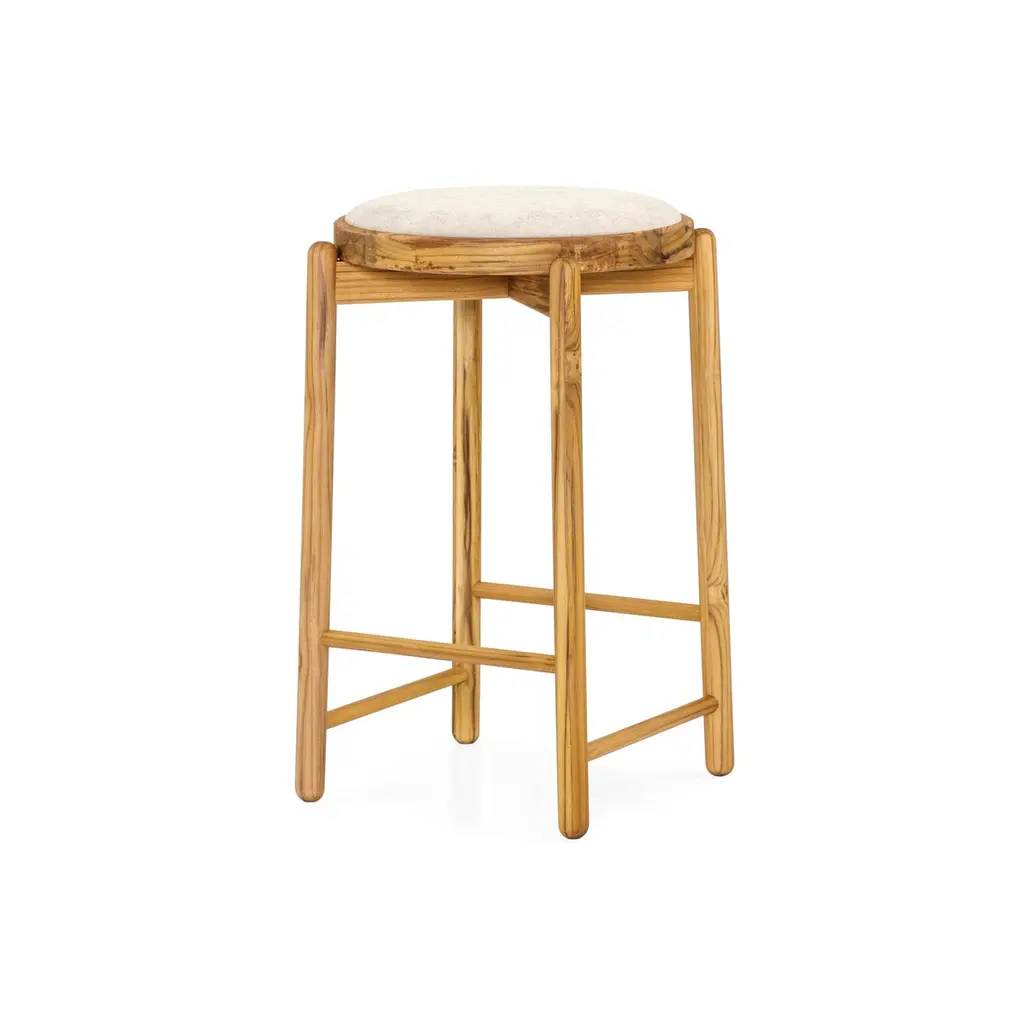 A Maru teak wood counter stool designed by Uultis Studio and upholstered in a beige fabric. Please check availability prior to purchase.The Maru teak wood counter stool, designed by Uultis Studio, combines cultural inspiration with modern functionality to create a beautiful and practical addition to any home. The stool features a sleek teak wood base, offering both strength and natural warmth. Its seat is upholstered in Wheat Thin Twill Weave fabric, a light beige material that adds subtle elegance while providing comfortable seating for high surfaces such as kitchen islands or bar counters. Please note that teak has natural variations, therefore each piece will be very unique. The teak wood will receive a teak touch finish, that is matte and velvety, preserving the natural feel of the wood.Inspired by the traditional straw sieves used in Brazilian food production by native communities, the Maru stool integrates cultural elements into its modern design. The clean, armless silhouette allows for easy storage, making it a space-saving option that fits seamlessly under countertops when not in use. Its minimalist design ensures versatility, making it suitable for both contemporary and traditional interiors.Committed to sustainability, Uultis carefully selects eco-friendly materials and incorporates responsible practices into the production of each piece. Assembled and ready for immediate use, the Maru counter stool adds both charm and functionality to any living space. Whether in a kitchen, bar area, or outdoor counter, this stool brings a touch of natural elegance and cultural heritage, creating a perfect balance between form, function, and sustainable design.