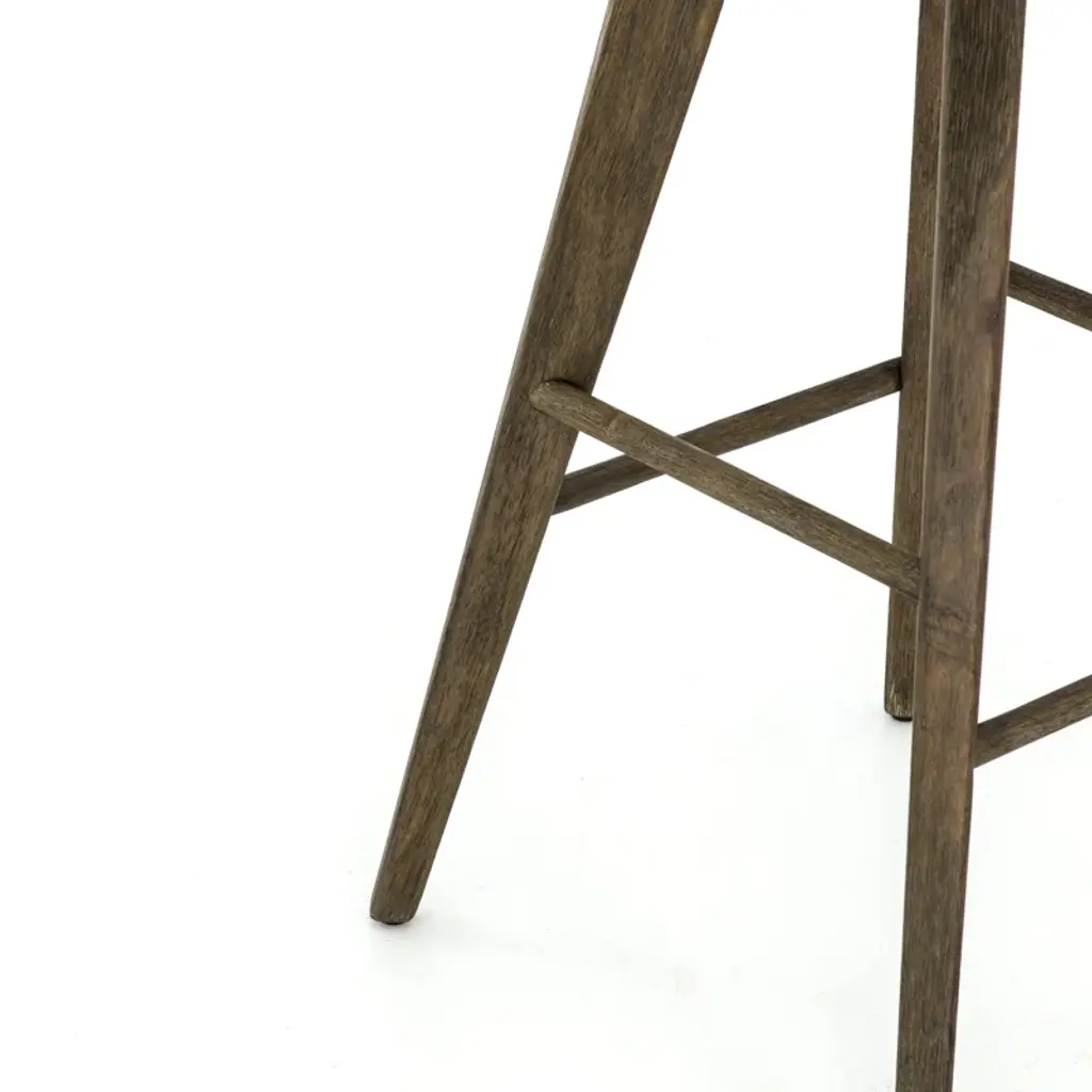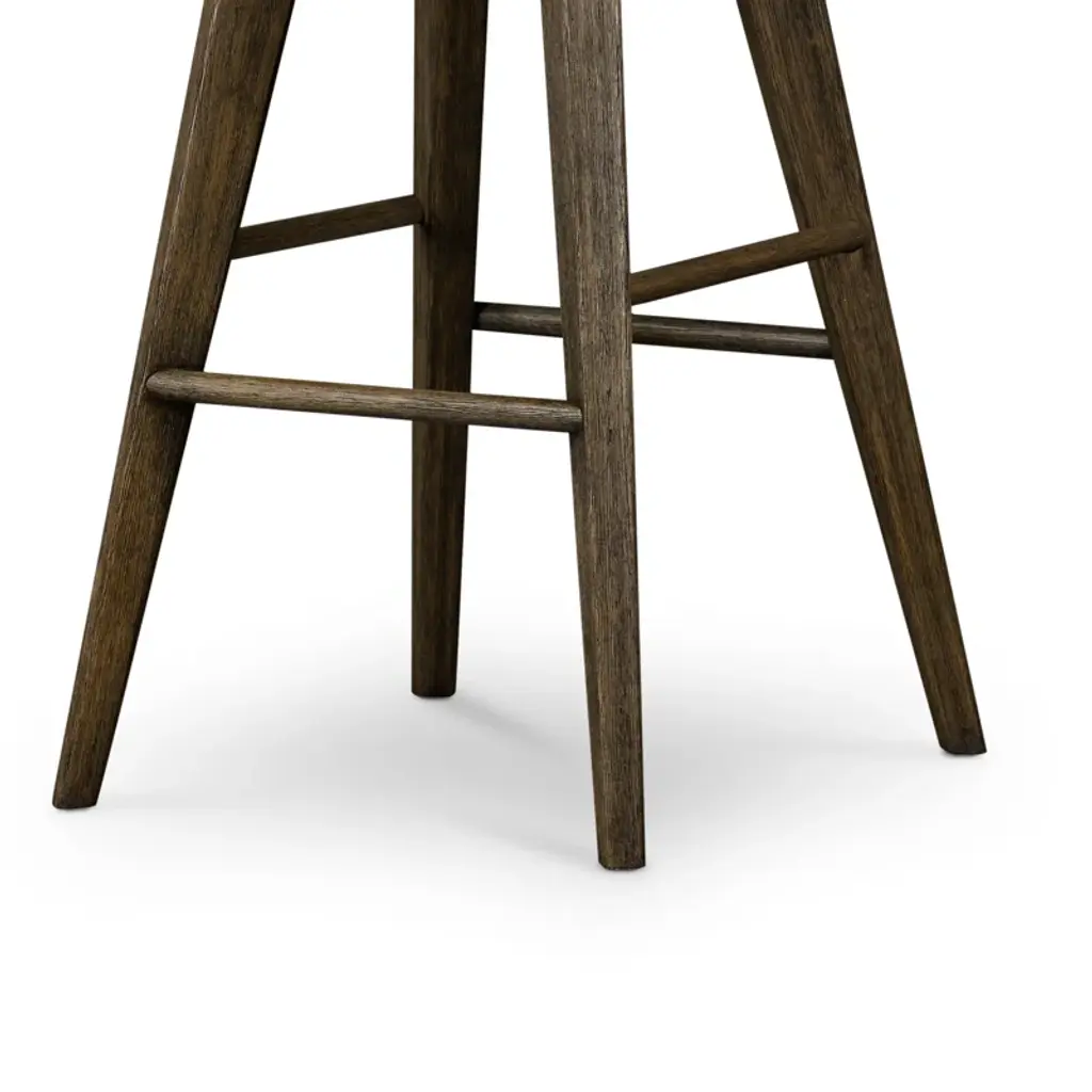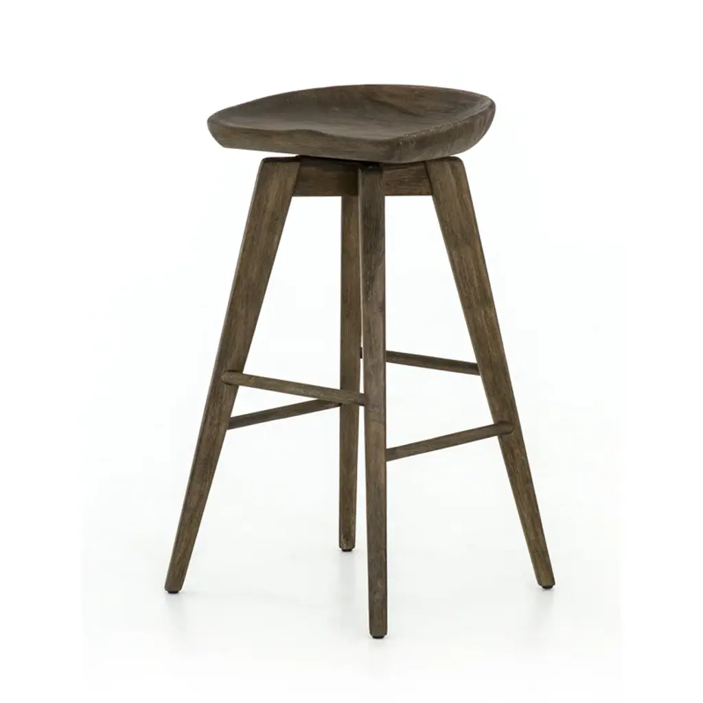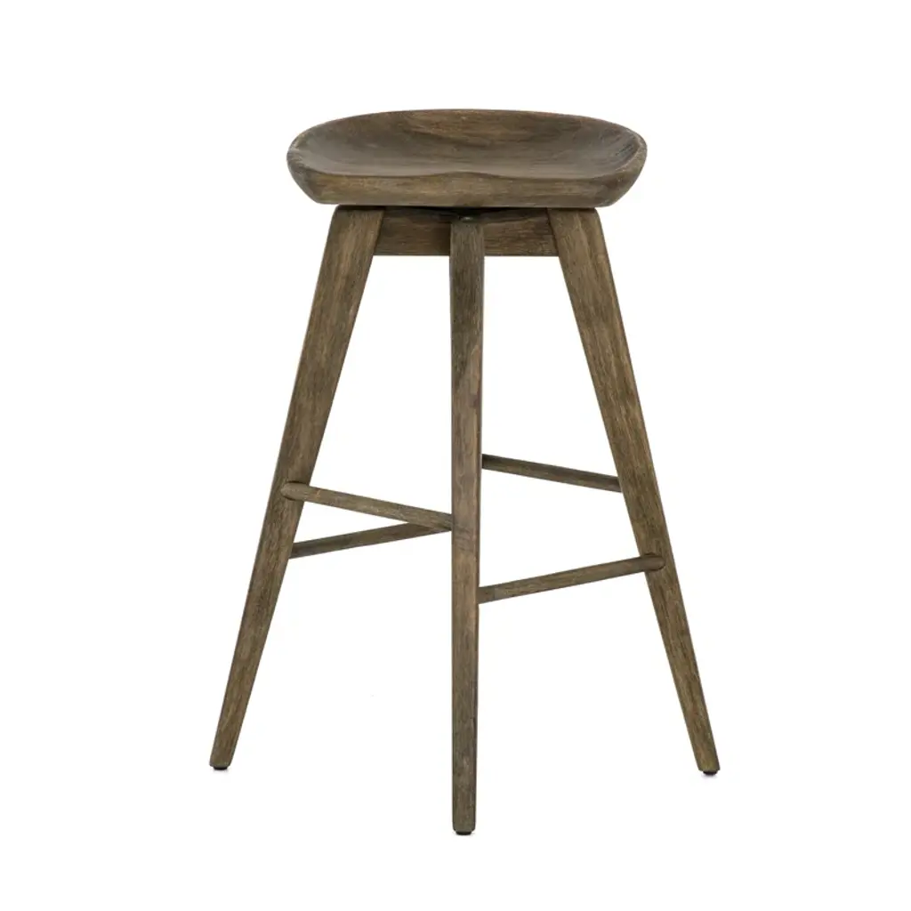 A rustic Byron finish counter stool, the shaped saddle seat above turned legs, and stretchers. The original French Provincial.