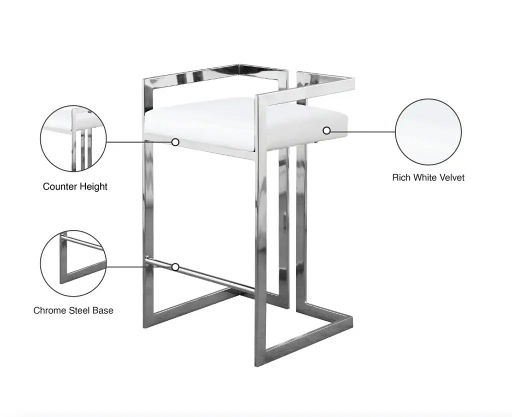 Looking to make a big impression on guests? Look no further than this Square White Faux Leather Counter Stool. Elegant faux leather in a creamy white hue adds the perfect modish finish to this contemporary stool that's perfect for the home bar or the kitchen counter. A plump and welcoming seat beckons you to sit down and rest a spell, and a beautiful chrome-finished silver base provides sturdy support and durability to this stool's design.