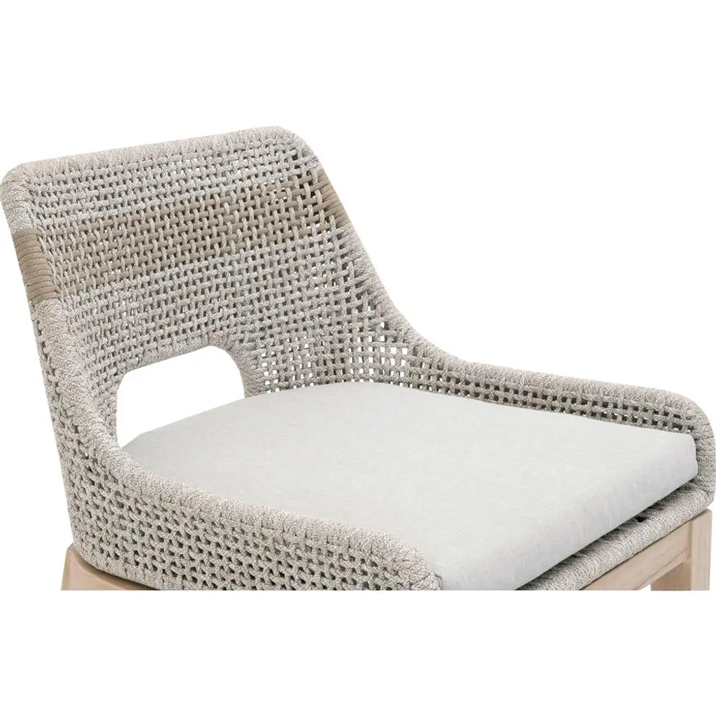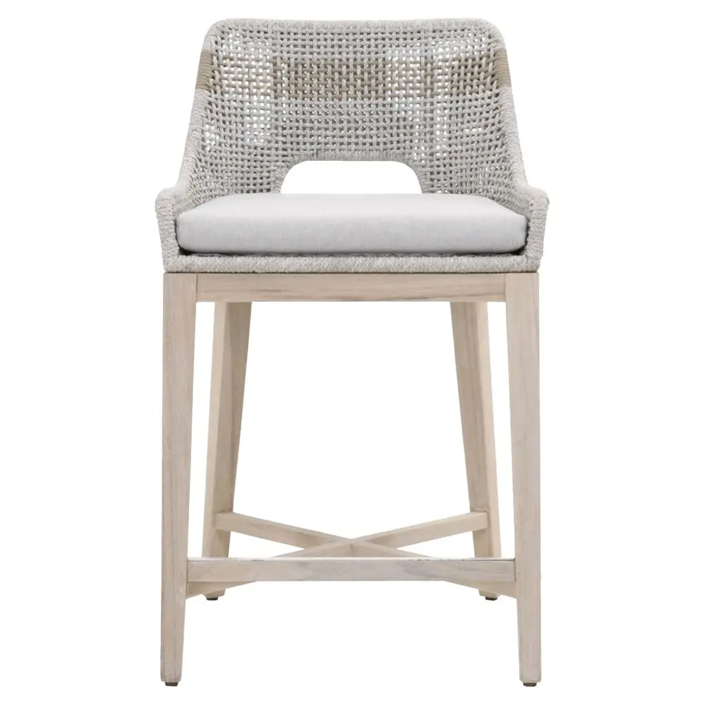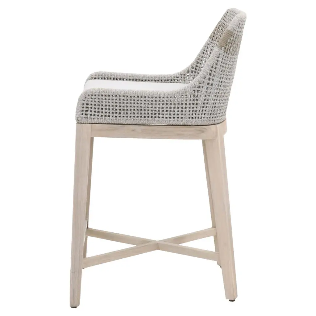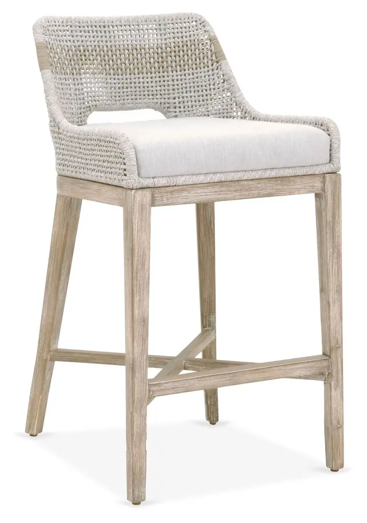 Finished in versatile shades of grey and taupe, our ever-popular Theodore counter stool is the perfect choice for any stylish outdoor dining space. Timeless and durable, the solid teak frame is grounded by an X-stretcher base. Intricately woven polyolefin rope enlivens the silhouette, while a foam cushion creates a wonderfully comfortable seat.