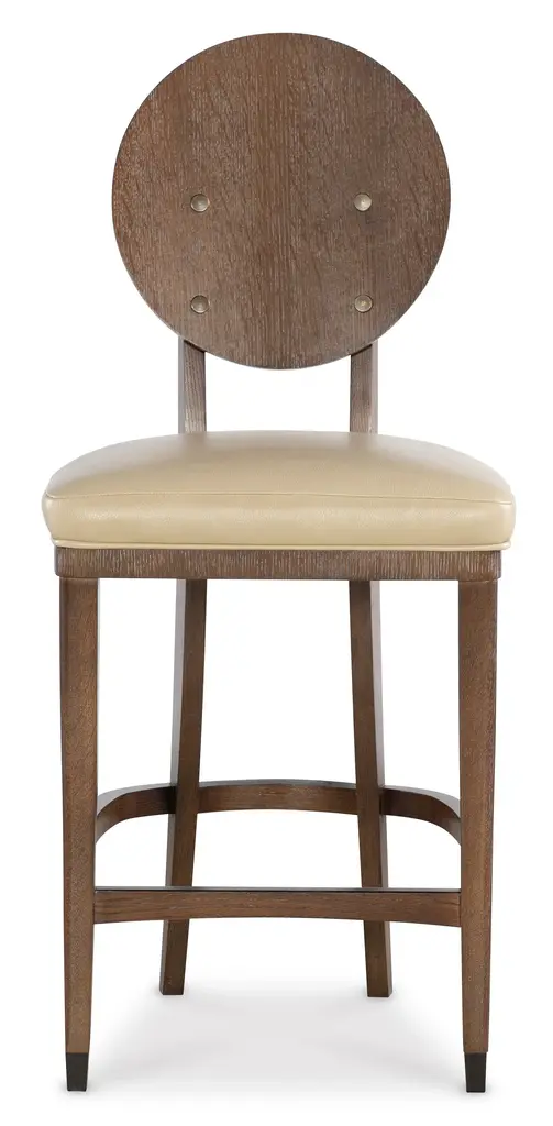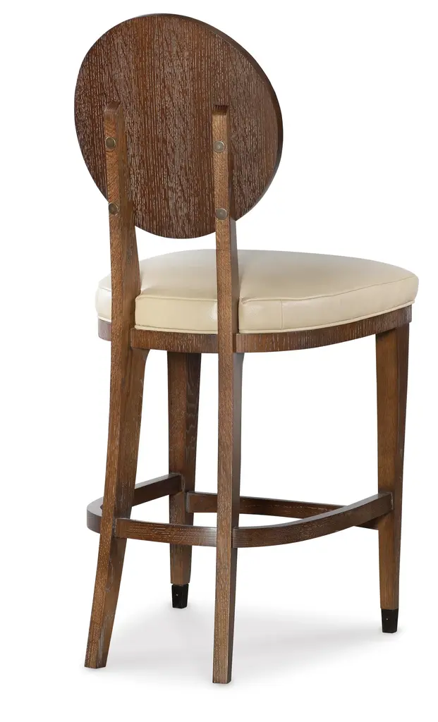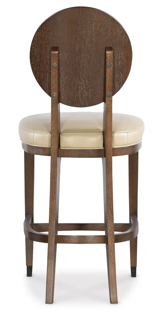 The Keira Counter Stool boasts a round back, rich oak grain, and smooth, neutral leather seat.