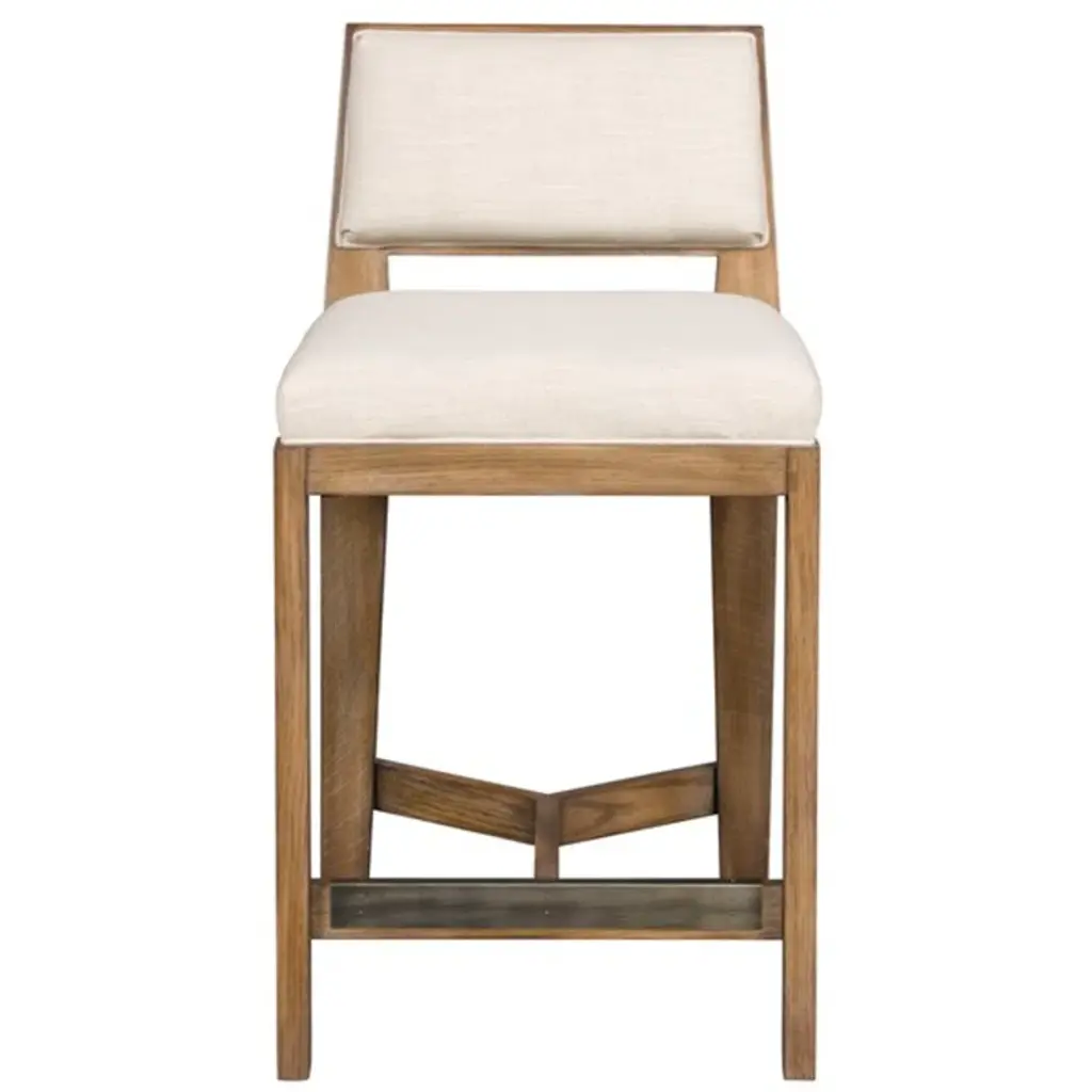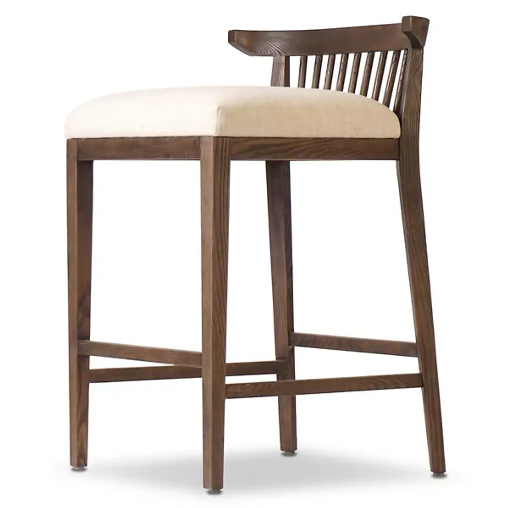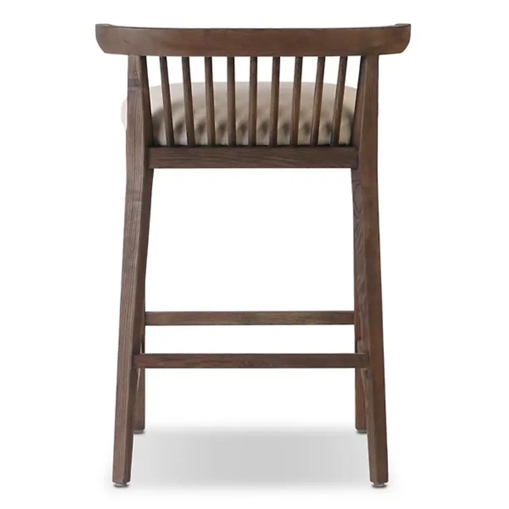 The Tullio Stool from Four Hands adapts the dining chair's Japanese-inspired design into counter height while maintaining the same spindle backrest construction. Its natural ash finish allows the wood's inherent grain patterns to show through the linear framework. The same thick cushion provides comfort at the elevated seating height, while the poly-linen blend upholstery ensures durability through daily use. This stool brings the meditative quality of tea house design to contemporary kitchen and bar settings.