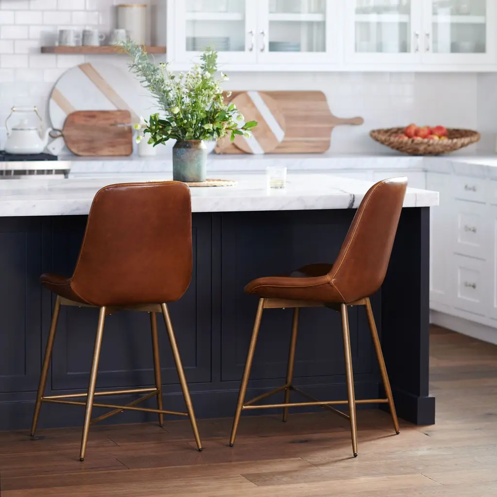With a spacious molded seat and bi-cast leather upholstery in your choice of colors, our counter stool features a modern, trend-forward design. Details like clean seaming and topstitching lend visual interest, while a bit of foam padding adds comfort.