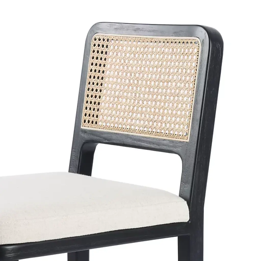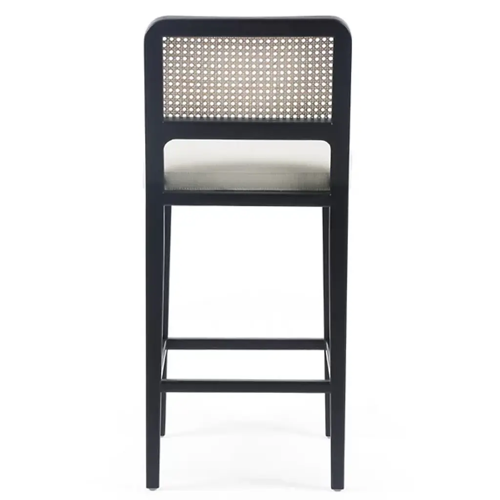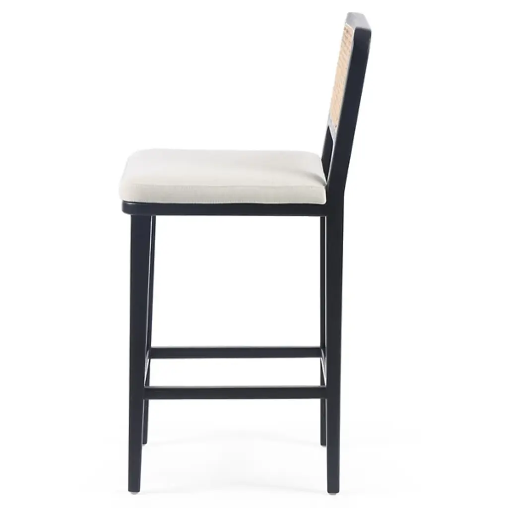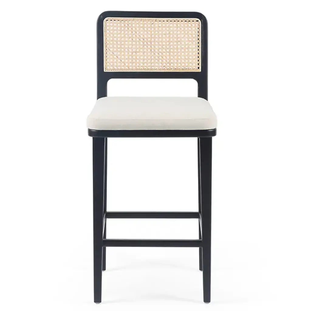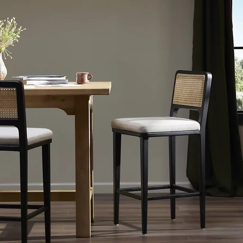 The Veka Counter Stool from Four Hands is a masterful merger of midcentury aesthetics and modern materials. This piece features a solid beechwood frame that undergoes an ebony-brushing process, creating a rich, textured finish. The backrest incorporates a natural cane inlay, adding a trace of traditional craftsmanship. The seat is upholstered in a high-performance fabric composed of polyester and flax/linen, designed to withstand daily use while maintaining its appearance. This innovative material resists spills, stains, and wear, ensuring long-term durability without sacrificing comfort.
