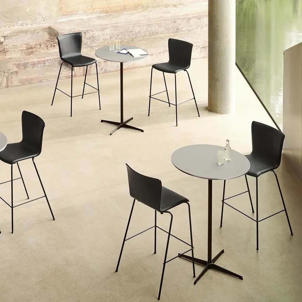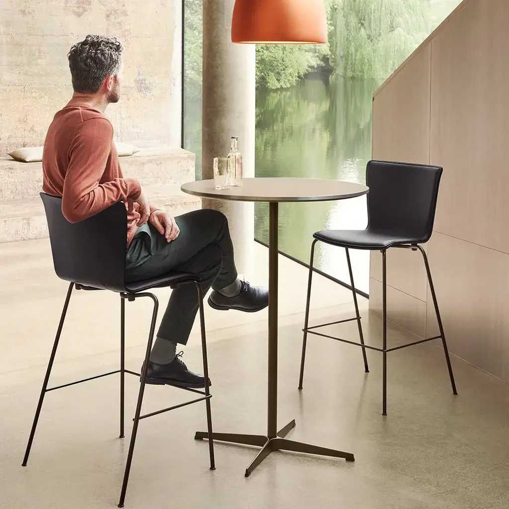 The Vico Duo chair comes in two different finishes: Natural veneer and black colored ash. All chairs are made of pressure molded sliced veneer. The shell is also available in front or fully upholstered versions in a wide range of textiles and leather types. Besides a base with four legs, it also comes with a sledge base, as a counter stool or as a bar stool.