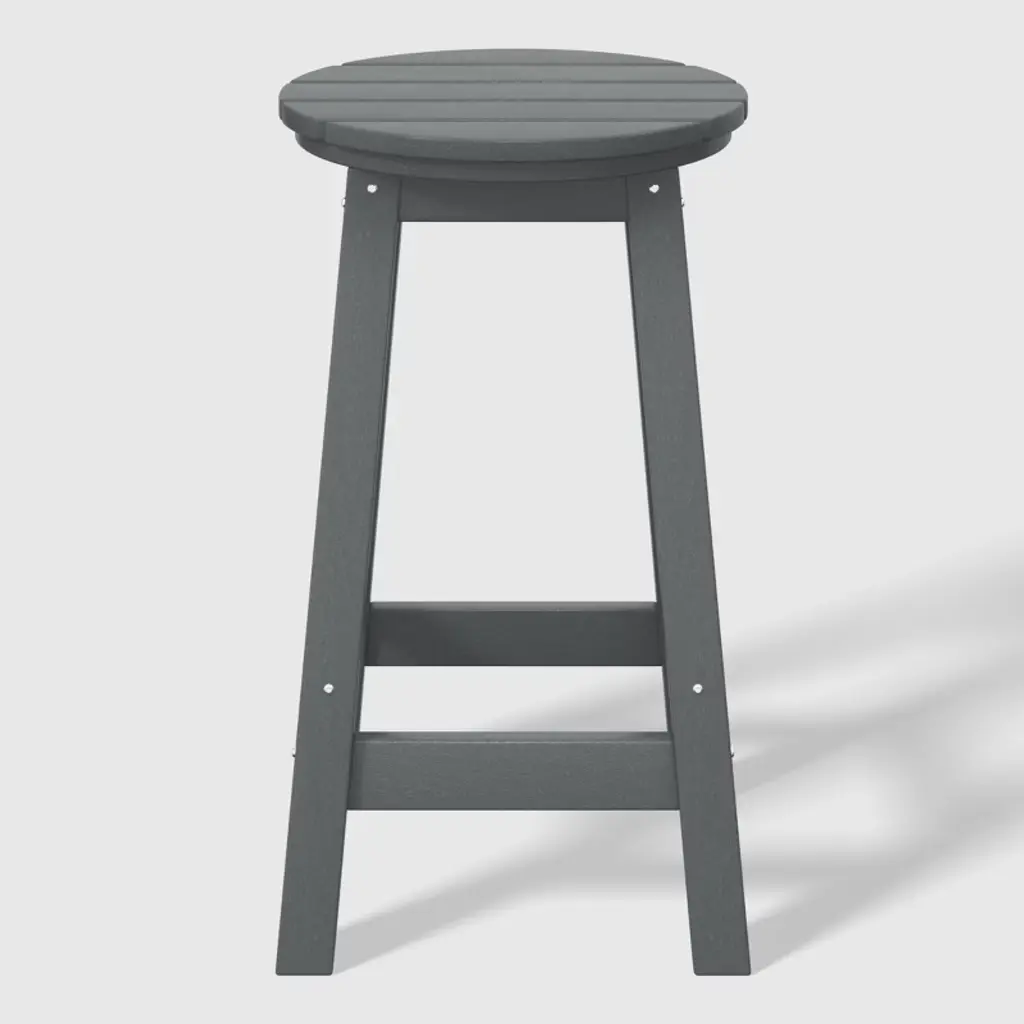 This 24" counter-height round-seat bar stool presents a sophisticated addition to your outdoor patio, ideally suited for placement around your outdoor patio bar or bistro table. crafted from durable and recycled HDPE material, its design is tailored for outdoor use, boasting UV and weather-resistant properties that safeguard the stool. Available in a palette of fade-resistant solid colors ensures the enduring vibrancy of its charming color each season. backless design makes for seamless storage underneath the table, offering both versatility and elegance. classic yet modern aesthetic effortlessly harmonizes with your existing decor, while the A-frame design, supported by four sturdy square legs and foot bars, provides a well-balanced and comfortable seating experience.While we strive to accurately represent product colors, please be aware that actual colors may vary slightly due to individual screen settings and lighting conditions. FeaturesConstructed from robust and environmentally friendly HDPE materialWeather resistant to protect against the harsh outdoor elementsFade and UV resistant to protect against the sunA-frame construction adds stabilityStainless steel hardware prevents rustLightweight constructionEasy to AssembleDetails:Product Type: Patio Bar & Counter StoolsWhat's Included: (1) Counter StoolCounter StoolDimensions: 13.5" W x 13.5" D x 24.25" HWeight: 12.75 lbs.Seat Width: 13.75"Seat Depth: 13.75"Seat Height: 24"Weight Capacity: 330 lbs.