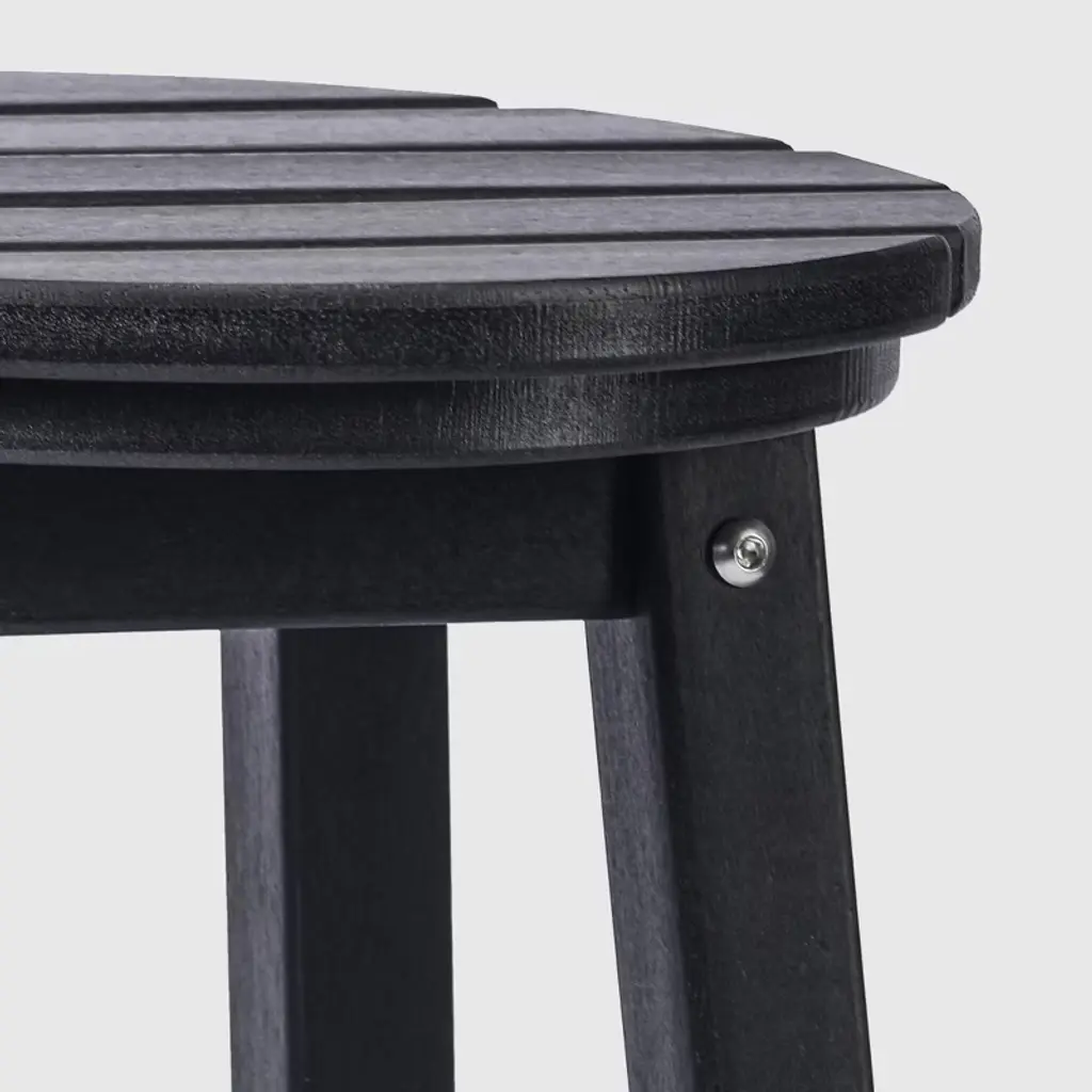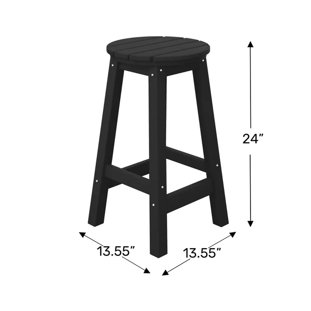 This set of three 24" counter-height round-seat bar stools presents a sophisticated addition to your outdoor patio, ideally suited for placement around your outdoor patio bar or bistro table. crafted from durable and recycled HDPE material, its design is tailored for outdoor use, boasting UV and weather-resistant properties that safeguard the stool. Available in a palette of fade-resistant solid colors ensures the enduring vibrancy of its charming color each season. backless design makes for seamless storage underneath the table, offering both versatility and elegance. classic yet modern aesthetic effortlessly harmonizes with your existing decor, while the A-frame design, supported by four sturdy square legs and foot bars, provides a well-balanced and comfortable seating experience.While we strive to accurately represent product colors, please be aware that actual colors may vary slightly due to individual screen settings and lighting conditions. FeaturesSet of three (3) backless counter bar stoolsConstructed from robust and environmentally friendly HDPE materialWeather resistant to protect against the harsh outdoor elementsFade and UV resistant to protect against the sunA-frame construction adds stabilityStainless steel hardware prevents rustLightweight constructionDetails:Product Type: Patio Bar & Counter StoolsWhat's Included: (3) Counter StoolCounter StoolDimensions: 13.5" W x 13.5" D x 24.25" HWeight: 12.75 lbs.Seat Width: 13.75"Seat Depth: 13.75"Seat Height: 24"Weight Capacity: 330 lbs.