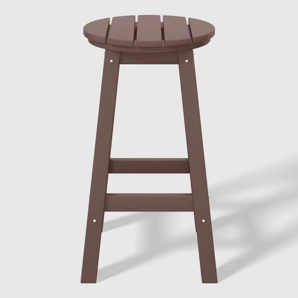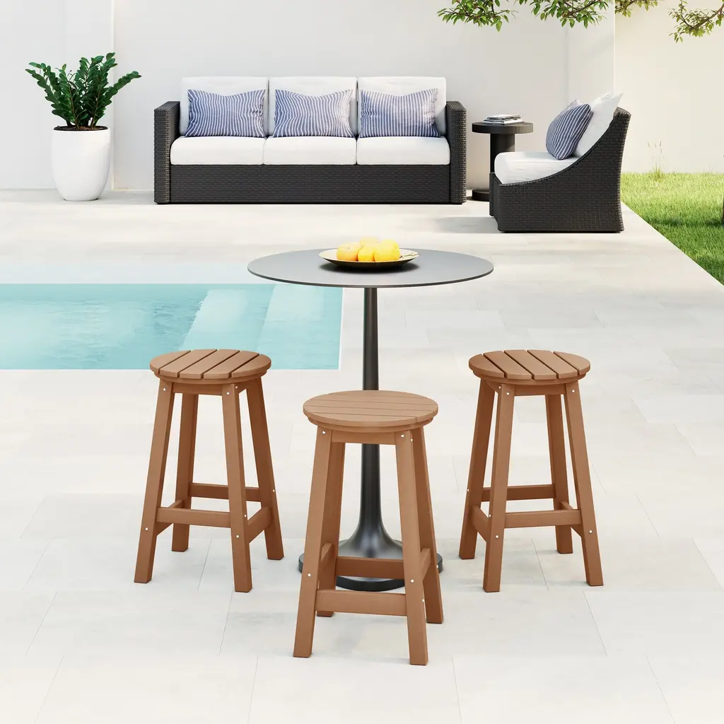 This set of three 24" counter-height round-seat bar stools presents a sophisticated addition to your outdoor patio, ideally suited for placement around your outdoor patio bar or bistro table. crafted from durable and recycled HDPE material, its design is tailored for outdoor use, boasting UV and weather-resistant properties that safeguard the stool. Available in a palette of fade-resistant solid colors ensures the enduring vibrancy of its charming color each season. backless design makes for seamless storage underneath the table, offering both versatility and elegance. classic yet modern aesthetic effortlessly harmonizes with your existing decor, while the A-frame design, supported by four sturdy square legs and foot bars, provides a well-balanced and comfortable seating experience.While we strive to accurately represent product colors, please be aware that actual colors may vary slightly due to individual screen settings and lighting conditions. FeaturesSet of three (3) backless counter bar stoolsConstructed from robust and environmentally friendly HDPE materialWeather resistant to protect against the harsh outdoor elementsFade and UV resistant to protect against the sunA-frame construction adds stabilityStainless steel hardware prevents rustLightweight constructionDetails:Product Type: Patio Bar & Counter StoolsWhat's Included: (3) Counter StoolCounter StoolDimensions: 13.5" W x 13.5" D x 24.25" HWeight: 12.75 lbs.Seat Width: 13.75"Seat Depth: 13.75"Seat Height: 24"Weight Capacity: 330 lbs.