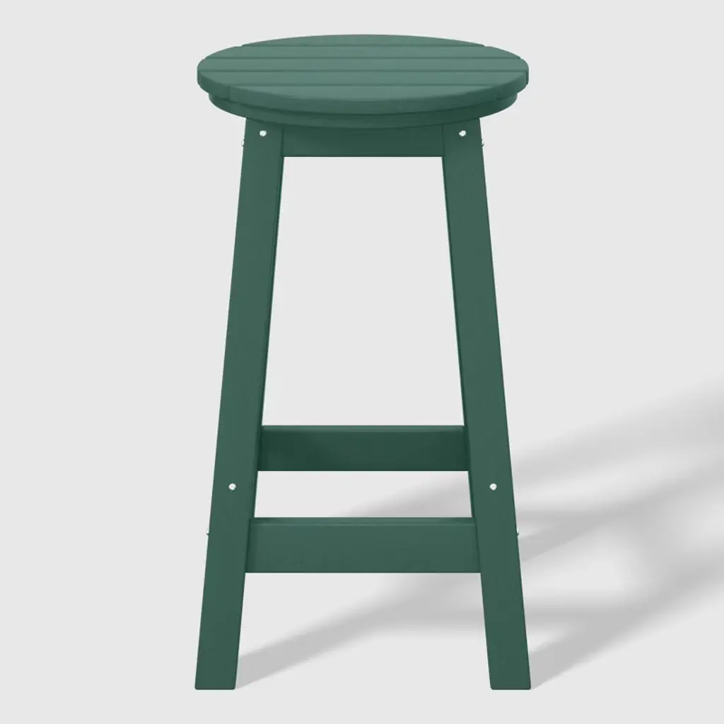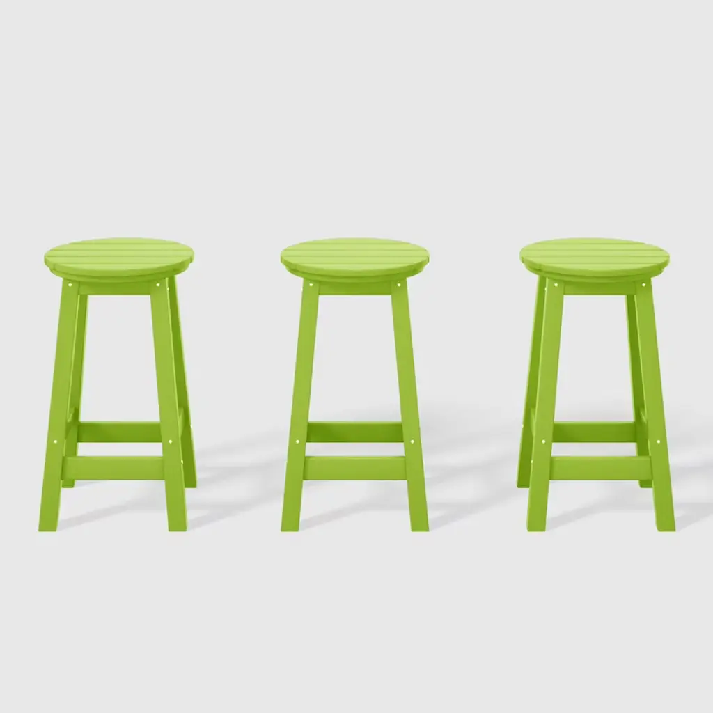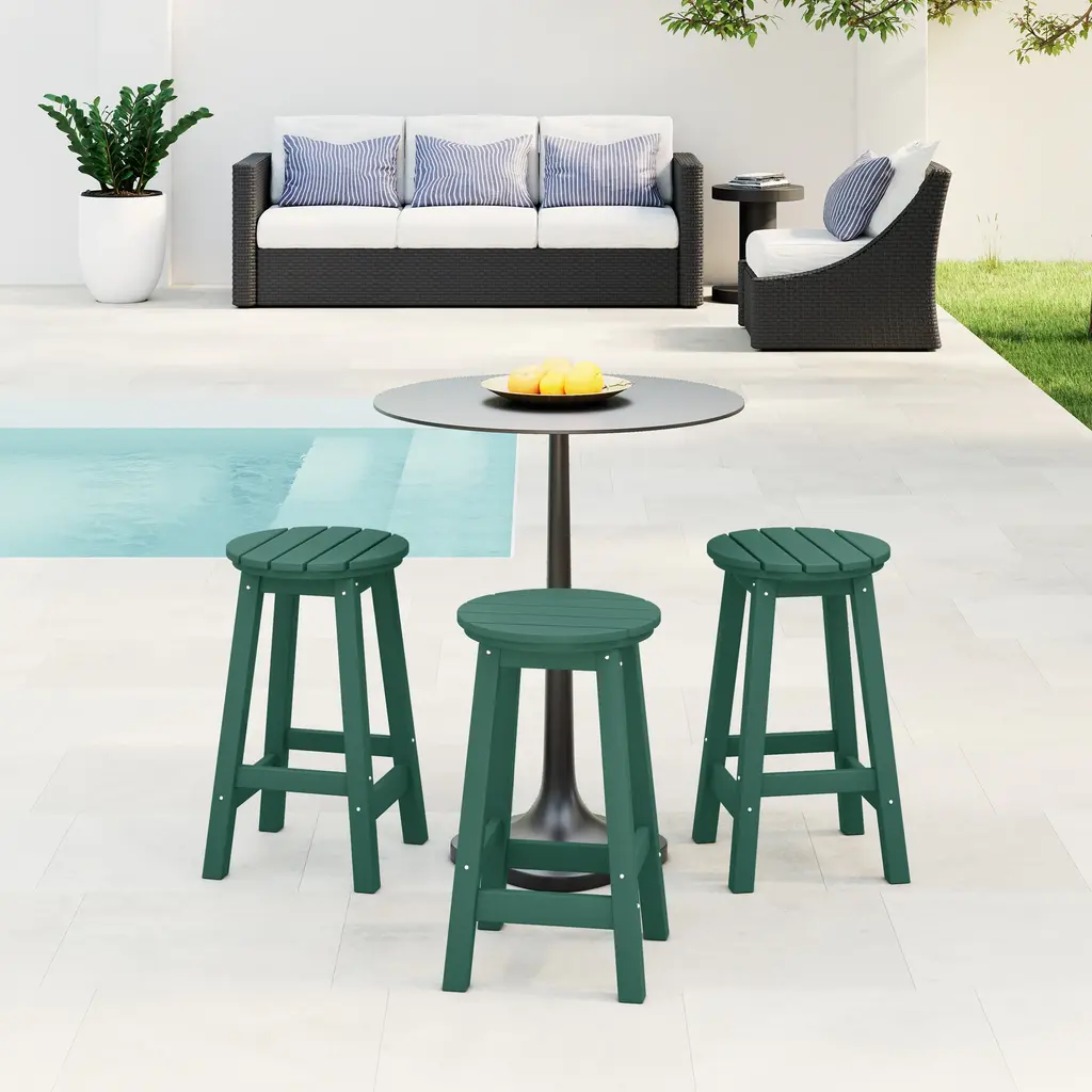 This set of three 24" counter-height round-seat bar stools presents a sophisticated addition to your outdoor patio, ideally suited for placement around your outdoor patio bar or bistro table. crafted from durable and recycled HDPE material, its design is tailored for outdoor use, boasting UV and weather-resistant properties that safeguard the stool. Available in a palette of fade-resistant solid colors ensures the enduring vibrancy of its charming color each season. backless design makes for seamless storage underneath the table, offering both versatility and elegance. classic yet modern aesthetic effortlessly harmonizes with your existing decor, while the A-frame design, supported by four sturdy square legs and foot bars, provides a well-balanced and comfortable seating experience.While we strive to accurately represent product colors, please be aware that actual colors may vary slightly due to individual screen settings and lighting conditions. FeaturesSet of three (3) backless counter bar stoolsConstructed from robust and environmentally friendly HDPE materialWeather resistant to protect against the harsh outdoor elementsFade and UV resistant to protect against the sunA-frame construction adds stabilityStainless steel hardware prevents rustLightweight constructionDetails:Product Type: Patio Bar & Counter StoolsWhat's Included: (3) Counter StoolCounter StoolDimensions: 13.5" W x 13.5" D x 24.25" HWeight: 12.75 lbs.Seat Width: 13.75"Seat Depth: 13.75"Seat Height: 24"Weight Capacity: 330 lbs.