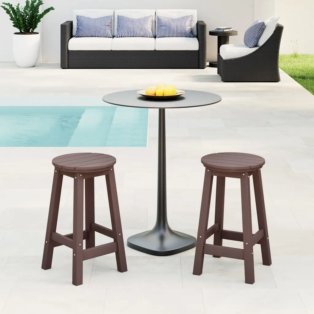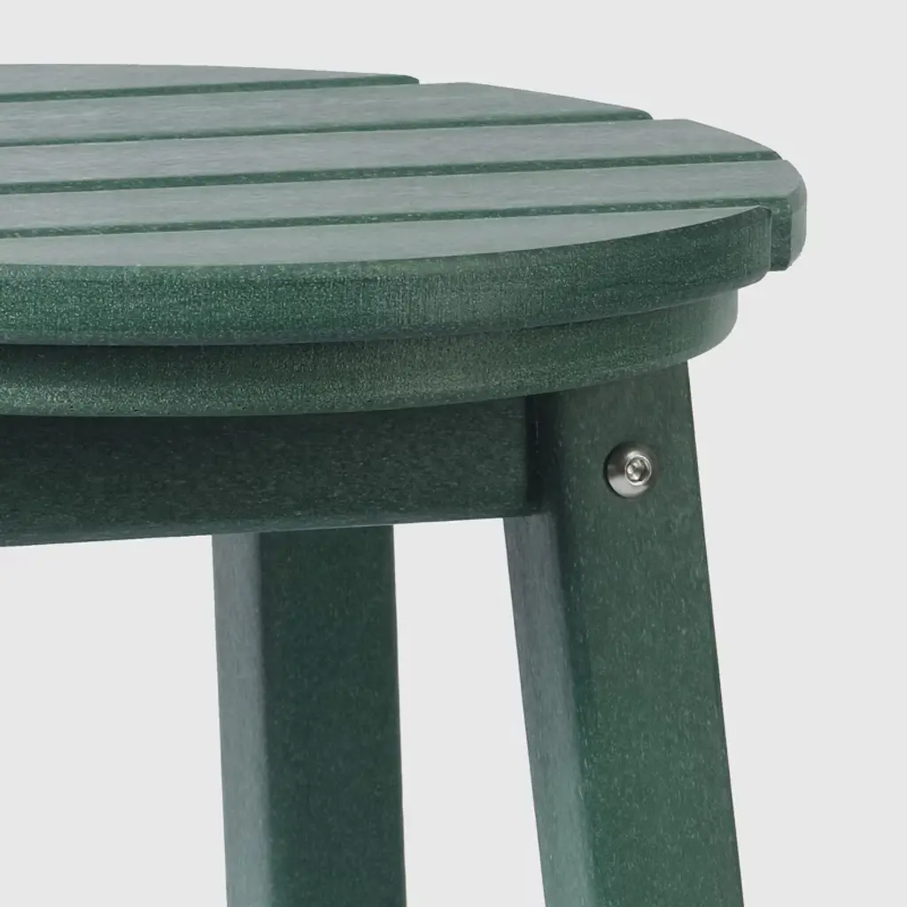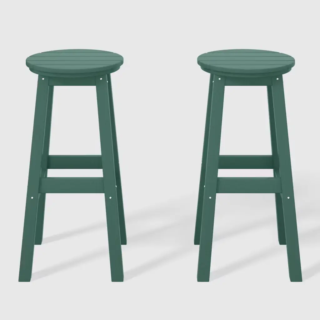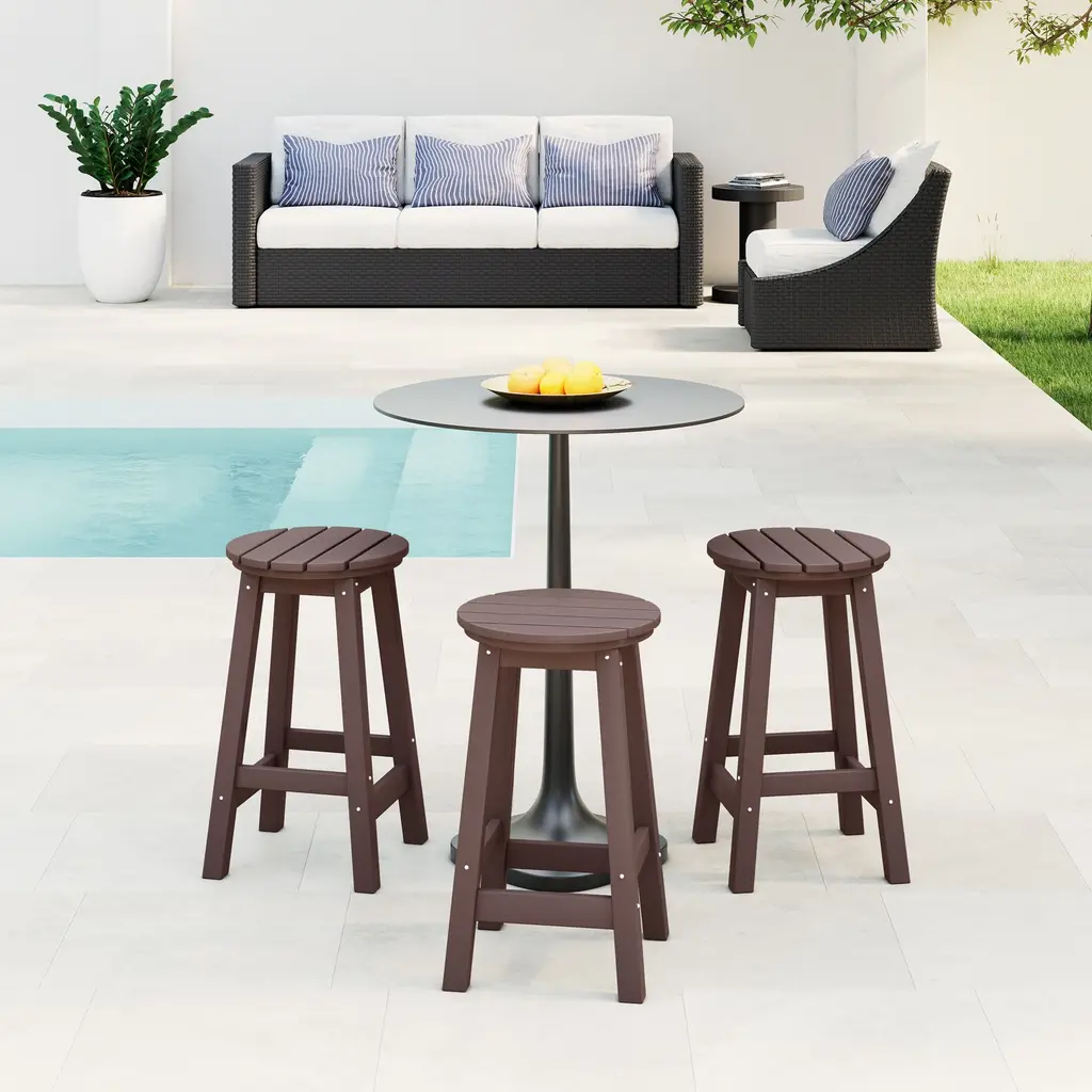 This set of three 24" counter-height round-seat bar stools presents a sophisticated addition to your outdoor patio, ideally suited for placement around your outdoor patio bar or bistro table. crafted from durable and recycled HDPE material, its design is tailored for outdoor use, boasting UV and weather-resistant properties that safeguard the stool. Available in a palette of fade-resistant solid colors ensures the enduring vibrancy of its charming color each season. backless design makes for seamless storage underneath the table, offering both versatility and elegance. classic yet modern aesthetic effortlessly harmonizes with your existing decor, while the A-frame design, supported by four sturdy square legs and foot bars, provides a well-balanced and comfortable seating experience.While we strive to accurately represent product colors, please be aware that actual colors may vary slightly due to individual screen settings and lighting conditions. FeaturesSet of three (3) backless counter bar stoolsConstructed from robust and environmentally friendly HDPE materialWeather resistant to protect against the harsh outdoor elementsFade and UV resistant to protect against the sunA-frame construction adds stabilityStainless steel hardware prevents rustLightweight constructionDetails:Product Type: Patio Bar & Counter StoolsWhat's Included: (3) Counter StoolCounter StoolDimensions: 13.5" W x 13.5" D x 24.25" HWeight: 12.75 lbs.Seat Width: 13.75"Seat Depth: 13.75"Seat Height: 24"Weight Capacity: 330 lbs.