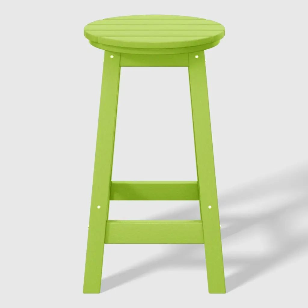 This set of three 24" counter-height round-seat bar stools presents a sophisticated addition to your outdoor patio, ideally suited for placement around your outdoor patio bar or bistro table. crafted from durable and recycled HDPE material, its design is tailored for outdoor use, boasting UV and weather-resistant properties that safeguard the stool. Available in a palette of fade-resistant solid colors ensures the enduring vibrancy of its charming color each season. backless design makes for seamless storage underneath the table, offering both versatility and elegance. classic yet modern aesthetic effortlessly harmonizes with your existing decor, while the A-frame design, supported by four sturdy square legs and foot bars, provides a well-balanced and comfortable seating experience.While we strive to accurately represent product colors, please be aware that actual colors may vary slightly due to individual screen settings and lighting conditions. FeaturesSet of three (3) backless counter bar stoolsConstructed from robust and environmentally friendly HDPE materialWeather resistant to protect against the harsh outdoor elementsFade and UV resistant to protect against the sunA-frame construction adds stabilityStainless steel hardware prevents rustLightweight constructionDetails:Product Type: Patio Bar & Counter StoolsWhat's Included: (3) Counter StoolCounter StoolDimensions: 13.5" W x 13.5" D x 24.25" HWeight: 12.75 lbs.Seat Width: 13.75"Seat Depth: 13.75"Seat Height: 24"Weight Capacity: 330 lbs.