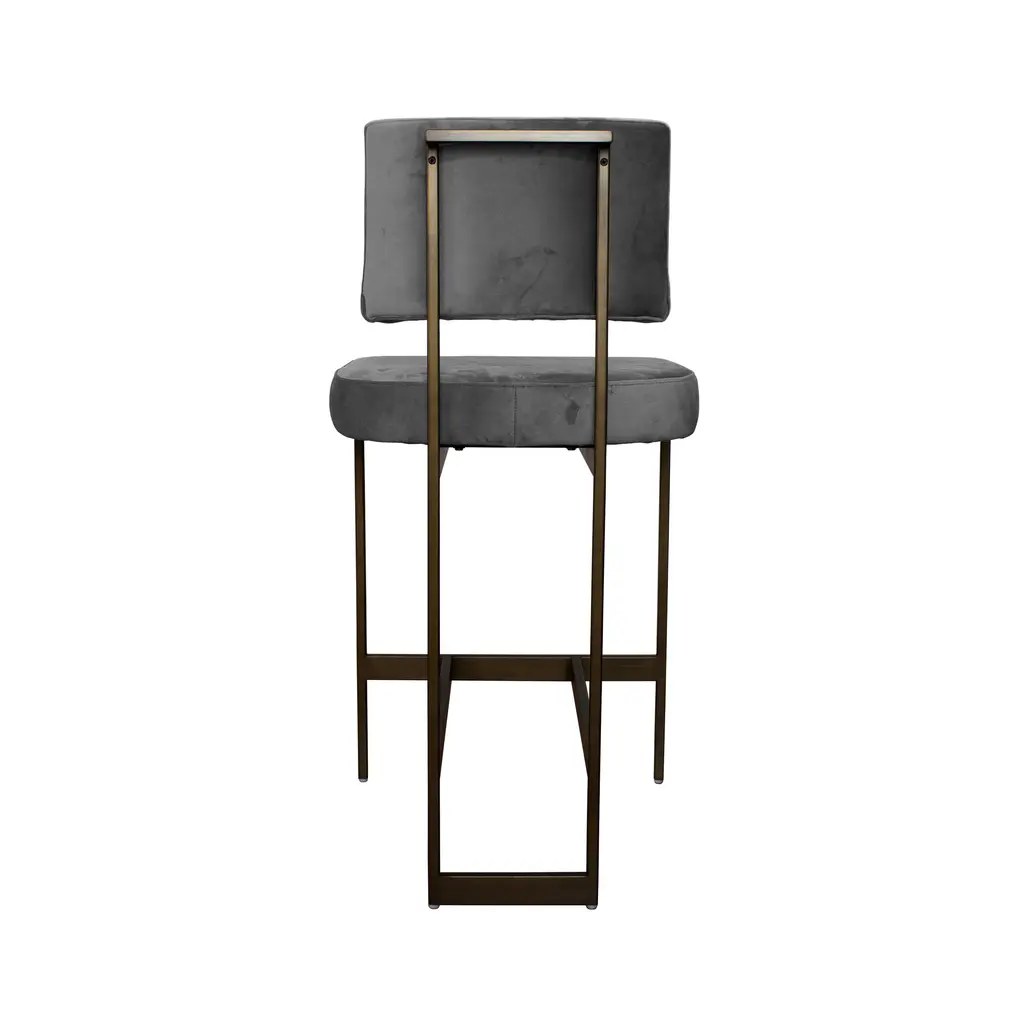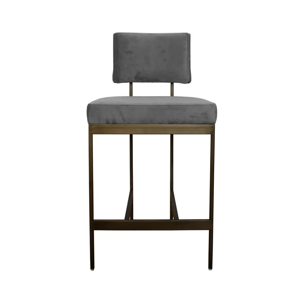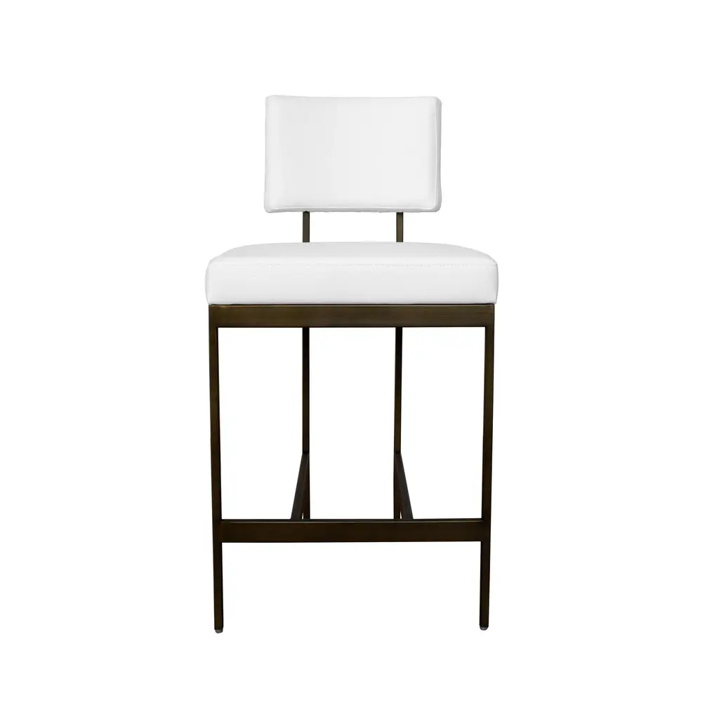 The clean lines and simple geometry of the Worlds Away Baylor counter height stool are inspired by early European modernists. A versatile cushion in your choice of white vinyl, camel velvet, or grey velvet pairs seamlessly with a nickel or bronze finish base. Back handle incorporated into the metal frame for easy portability.