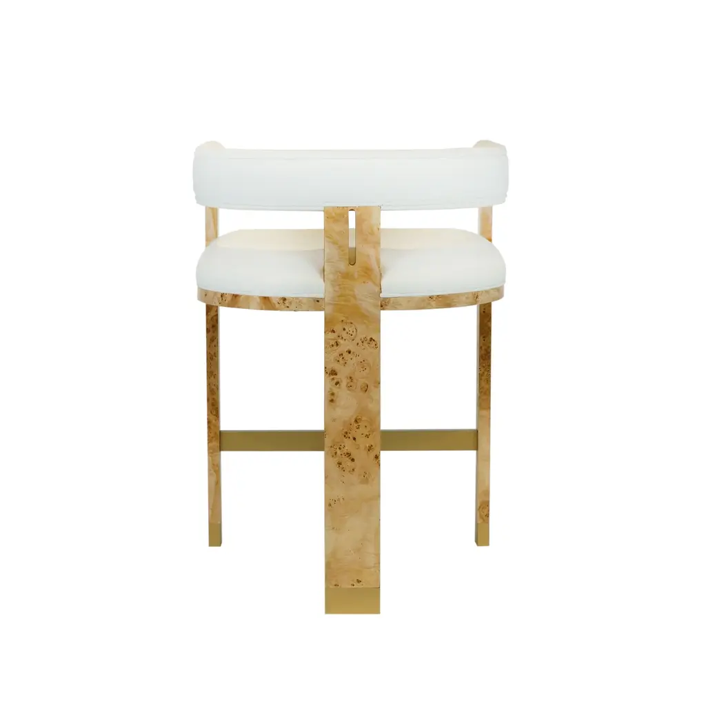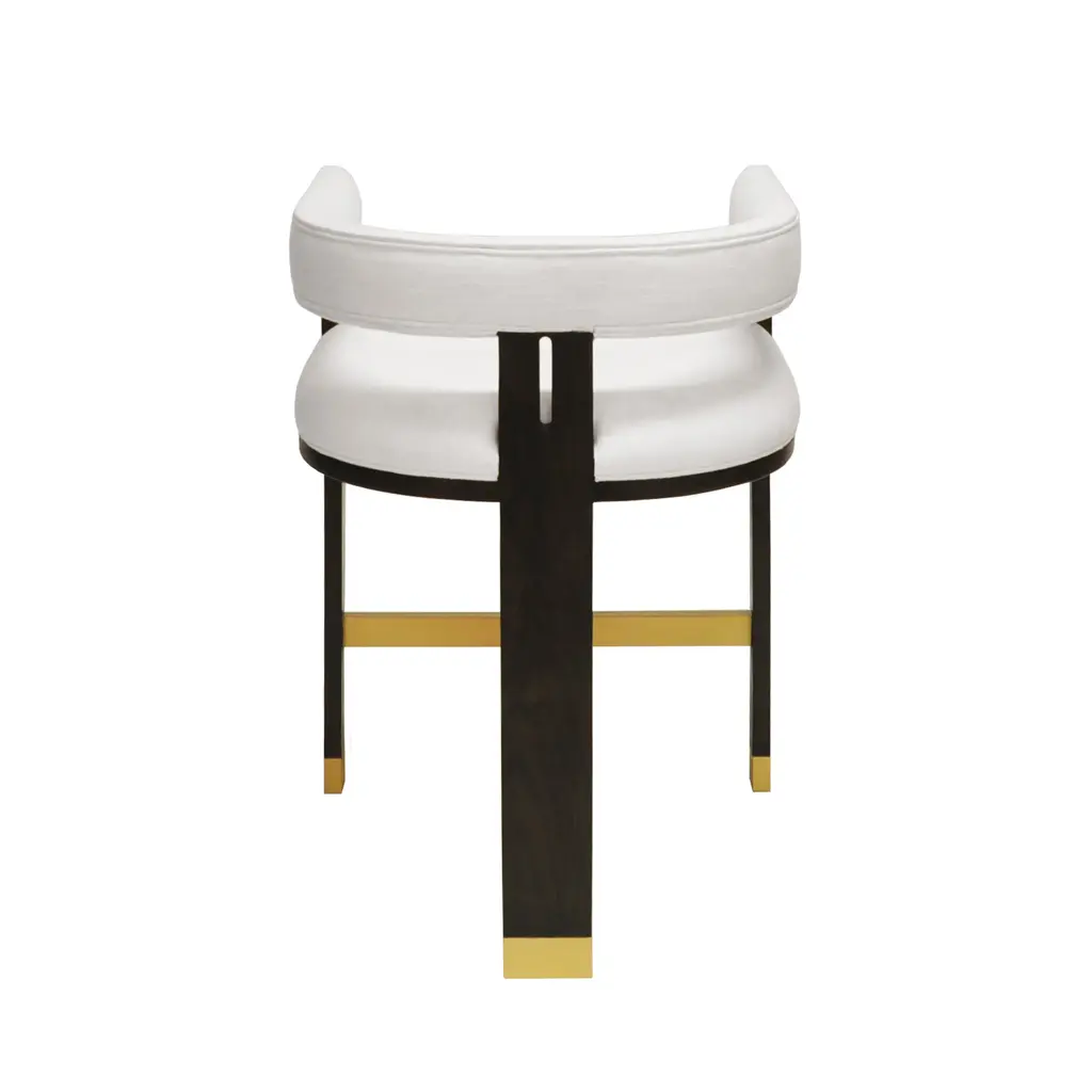 Perfectly tailored in crisp white linen upholstery, the barrel back Cruise counterstool by Worlds Away exudes mid century mod style and attitude. Its durable tri-leg, solid oak frame with a rich espresso or burl wood veneer finish forms a highly sought-after silhouette that's perfect for all occasions. Brass ferrule hardware completes the look.