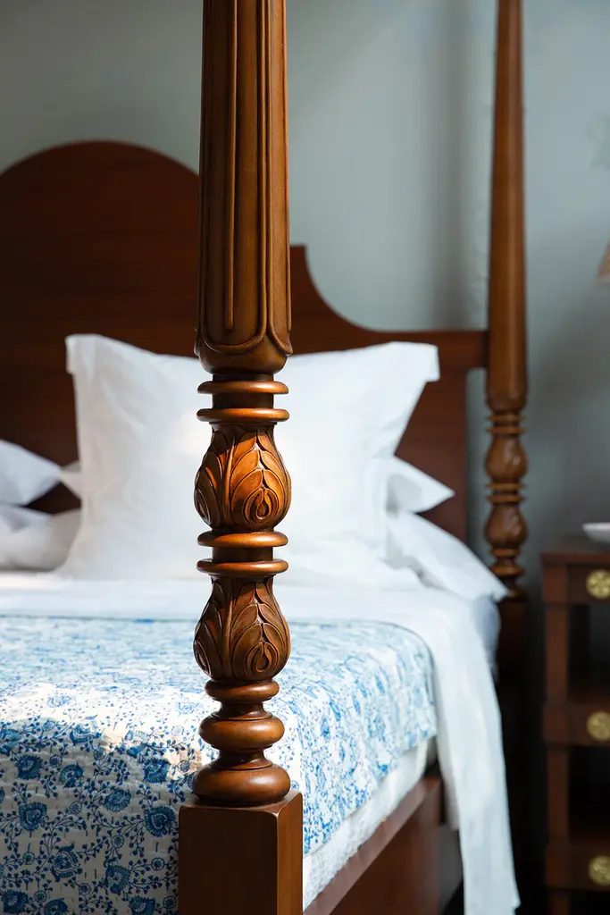 A soft, hand blocked reversible throw in blue and white, with coordinating blue stitching. Made with 100% cotton. Reversible; one side with a geometric leaf repeat, the other with an exuberant, crisp floral. Care Instructions: Dry clean, or machine wash on cold with like colors, line dry, and use medium/warm iron.