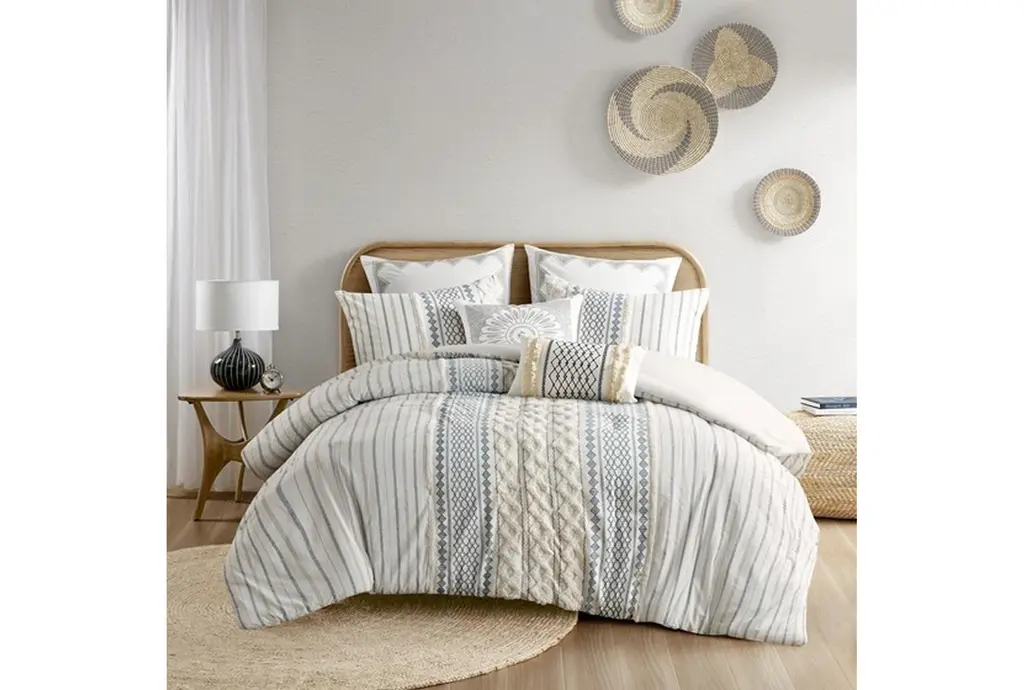 The Delilah Bedding Set features a stunning pattern that is a mixture of floral, geometric, and retro botanical prints, constructed with rosebud stitching in a refreshing color palette of blue, gold, navy, orange, and green. Reverse to a coordinating blue and navy floral print for an effortless way to bring beautiful style to any bedroom decor.