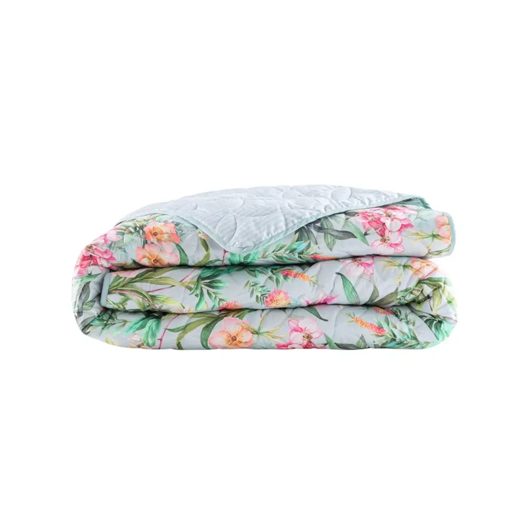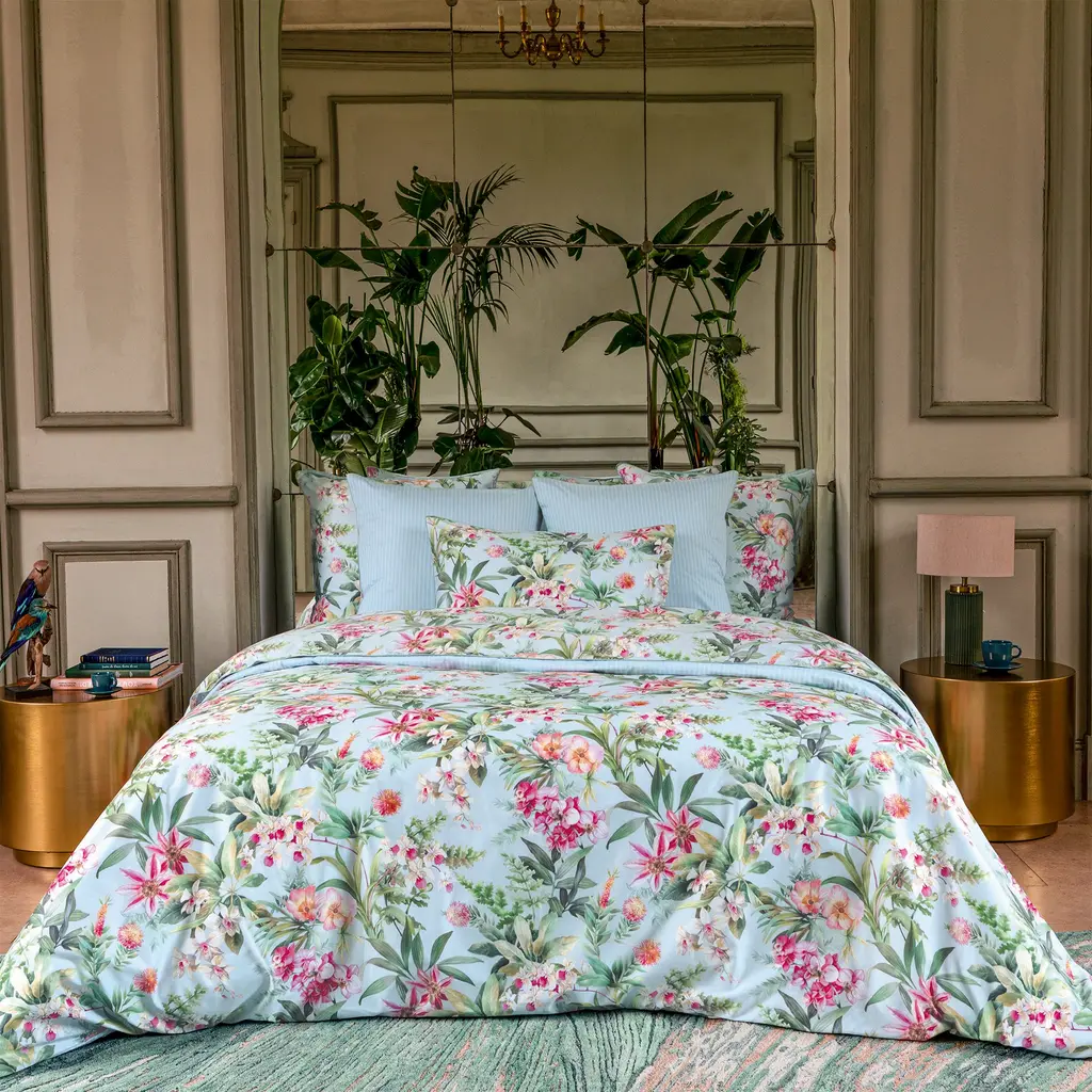 Anne de Solene's Conte Sateen Bedding Collection is a magical tale of luxurious tropical flowers and foliage, coordinated with a very modern stripe. The flowering orchids, hibiscus, safflowers, and clematis have an artistic, hand-painted look. Both the flowers print and the stripes print are done on a beautiful blue ground.