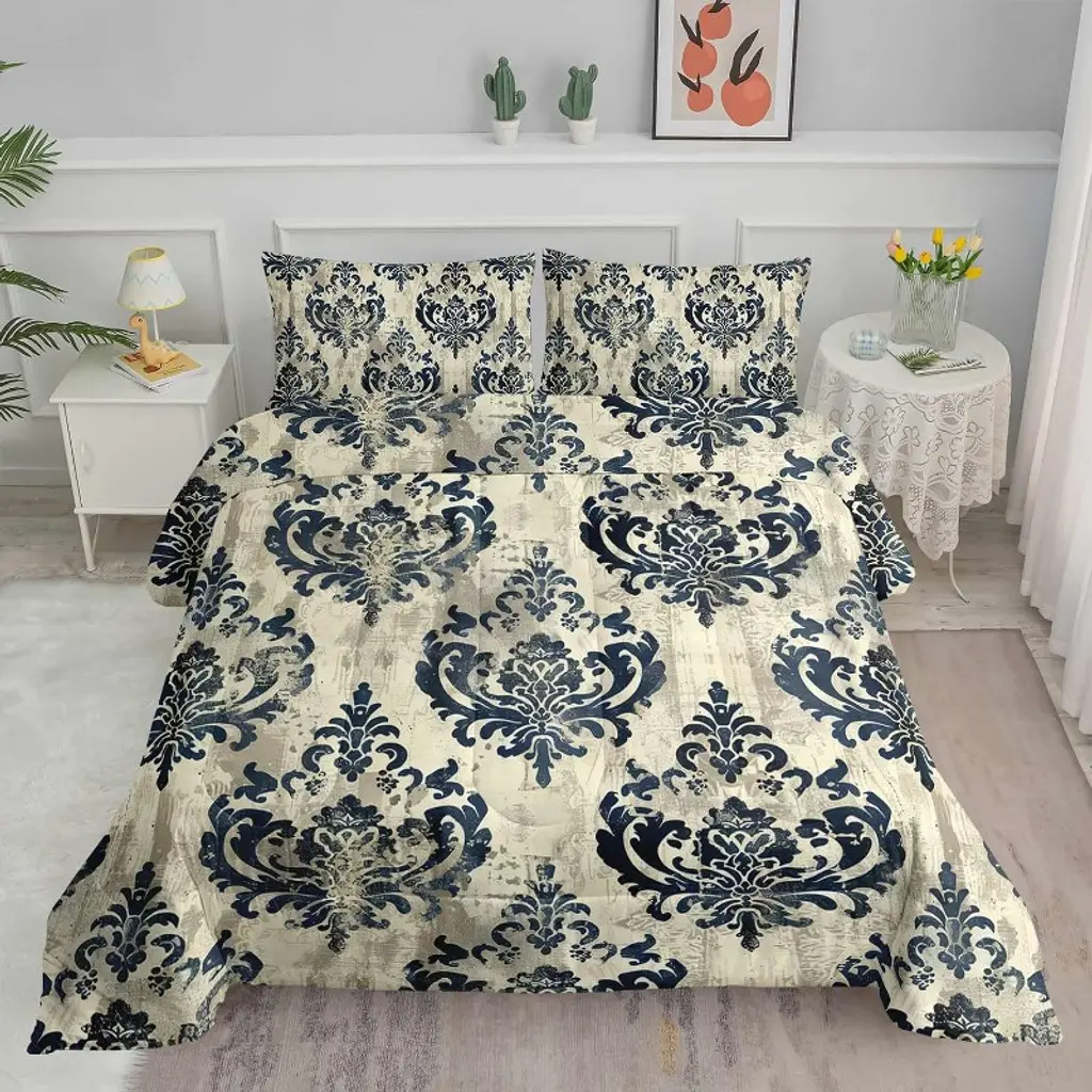 Our Damask duvet ensemble brings an elegant touch to your bedroom with varying hues of grey, cream, tan, light blue and rust that add a sense of sophistication to your space. Complete your bedding look with cream or rust colored accent pillows for an elevated aesthetic. The queen set includes one unfilled duvet or comforter and two standard shams while the king set includes one unfilled duvet or comforter and two king shams. Fabric content: 70% viscose, 30% linen. Spot clean only.
